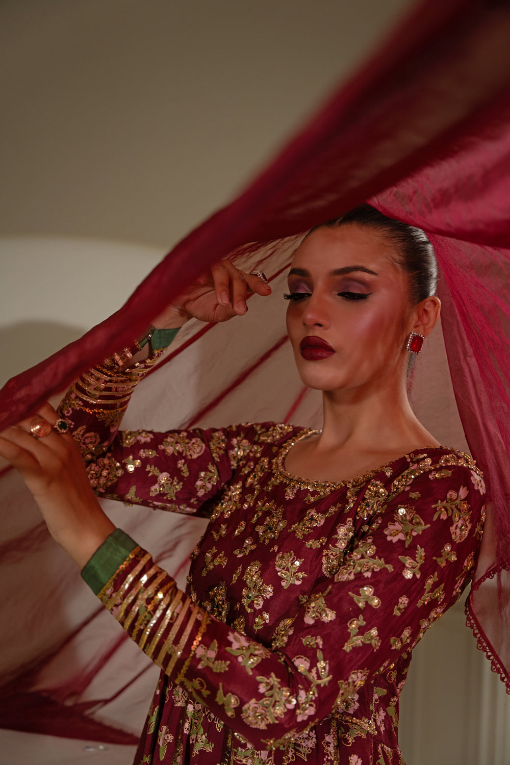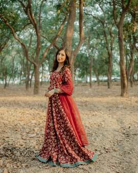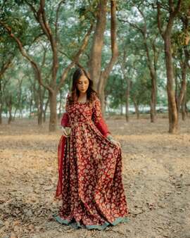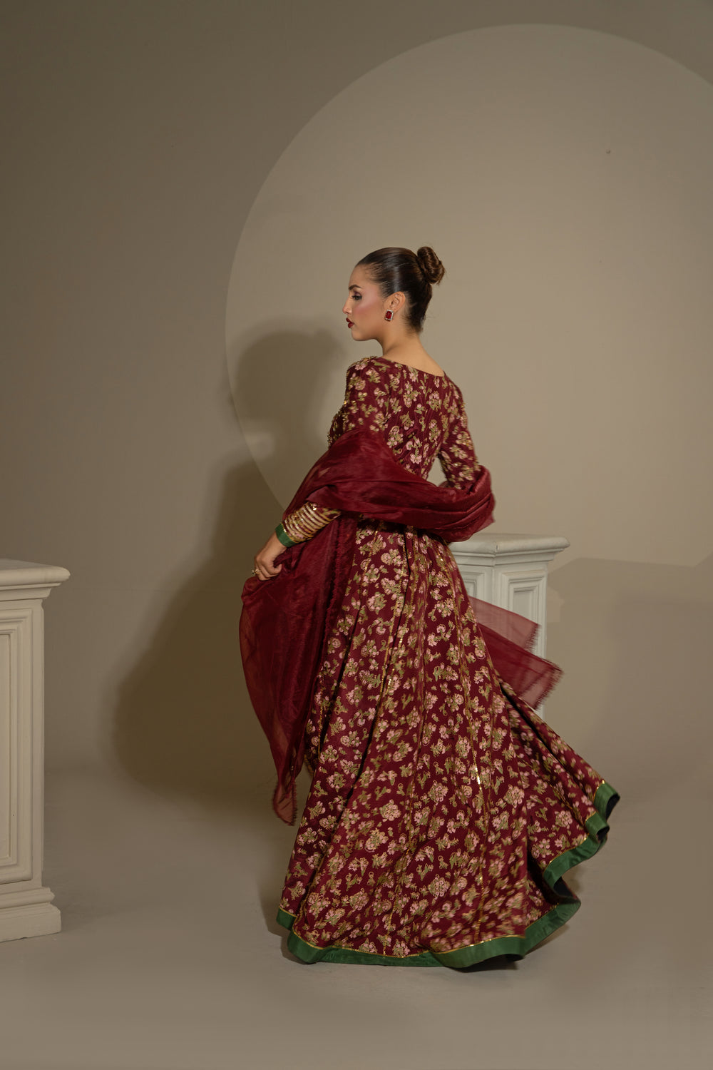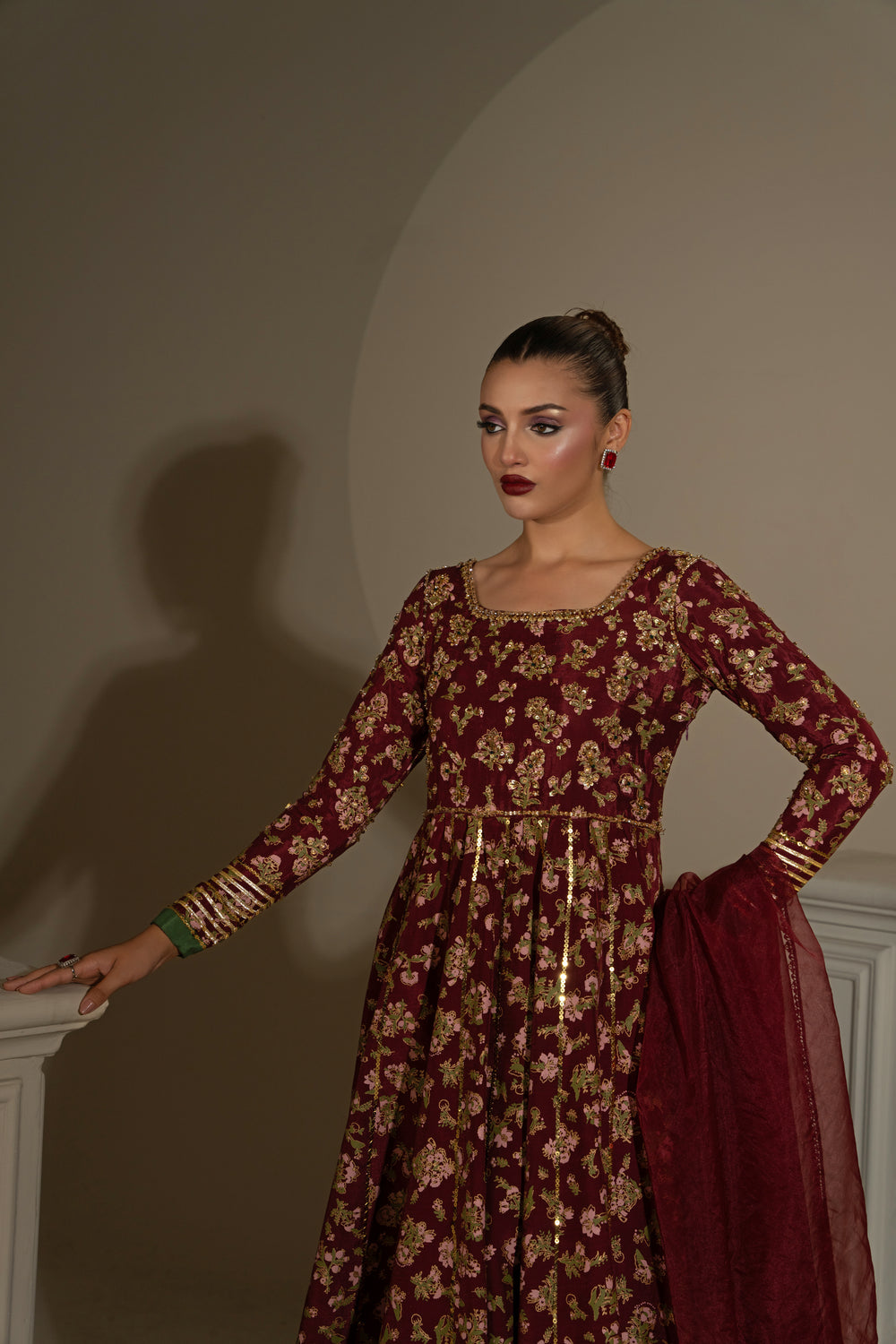 Thai silk pishwas of a maroon colour were exquisitely decorated with screen printing patterns throughout, and their top portion was exquisitely adorned with further embellishments and matched with an orgenza dupata.