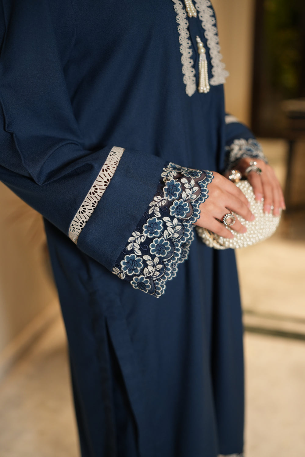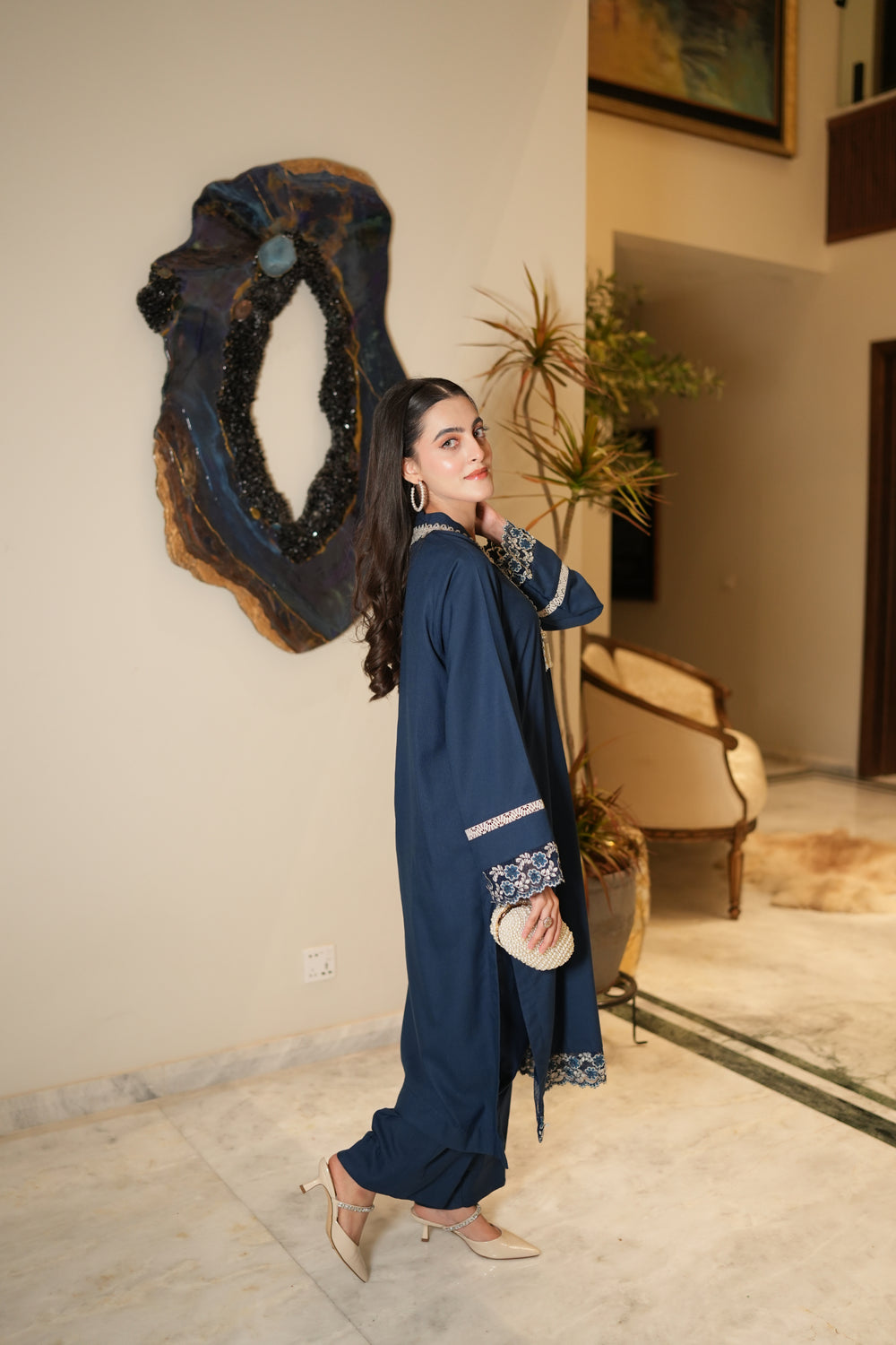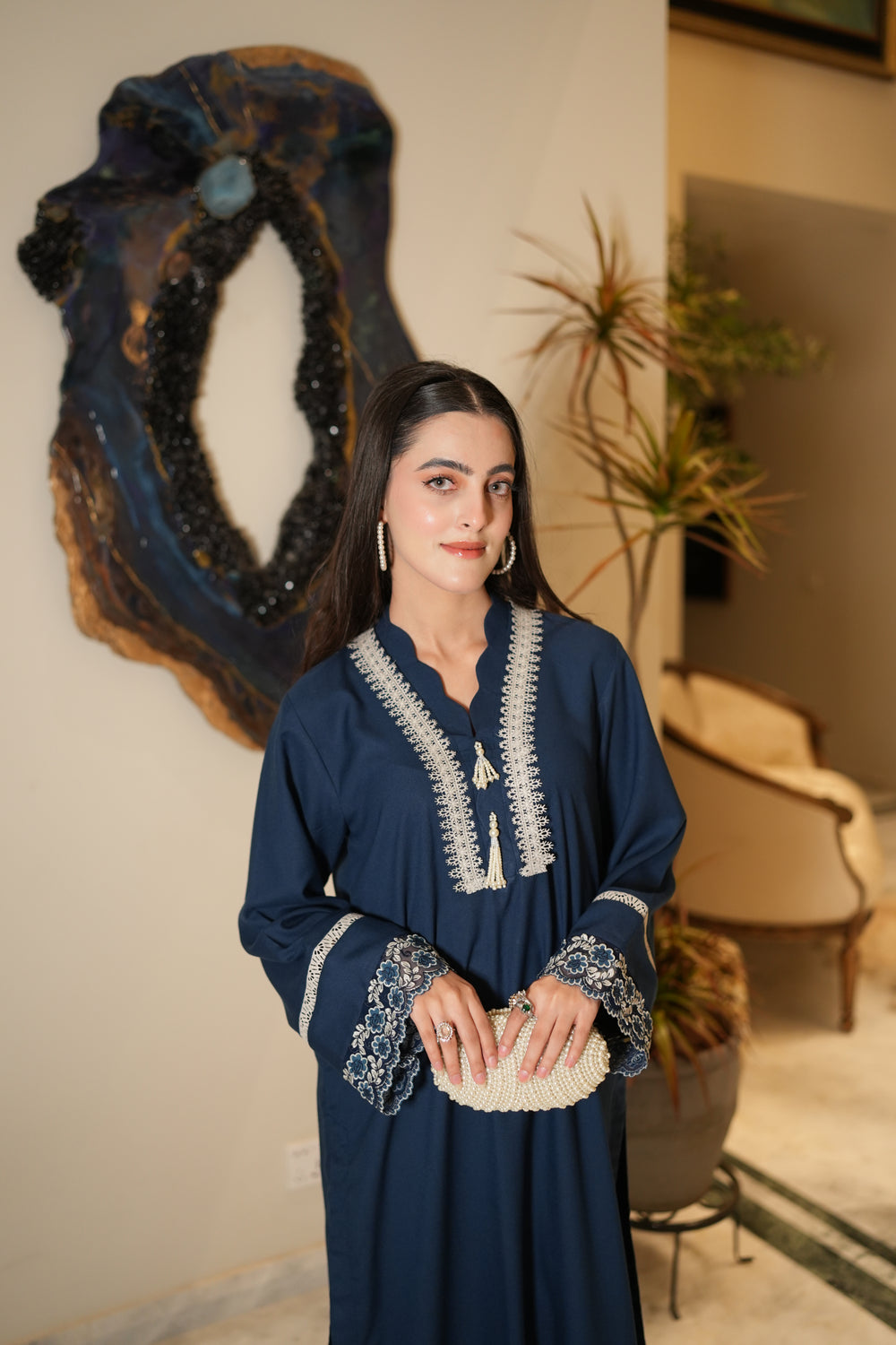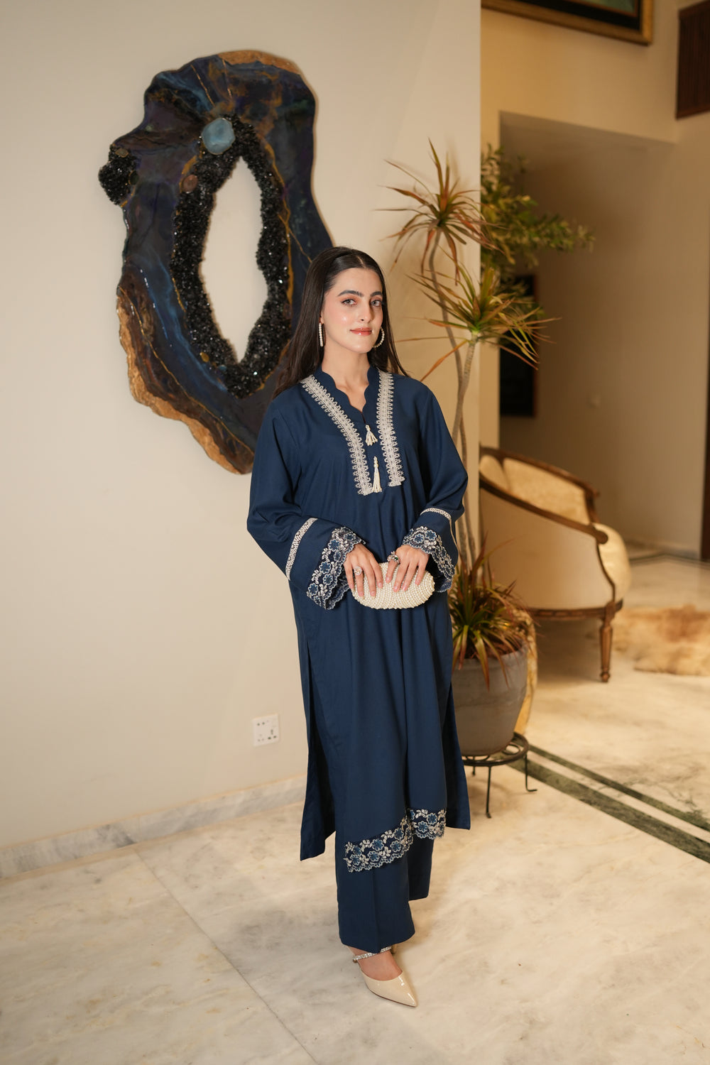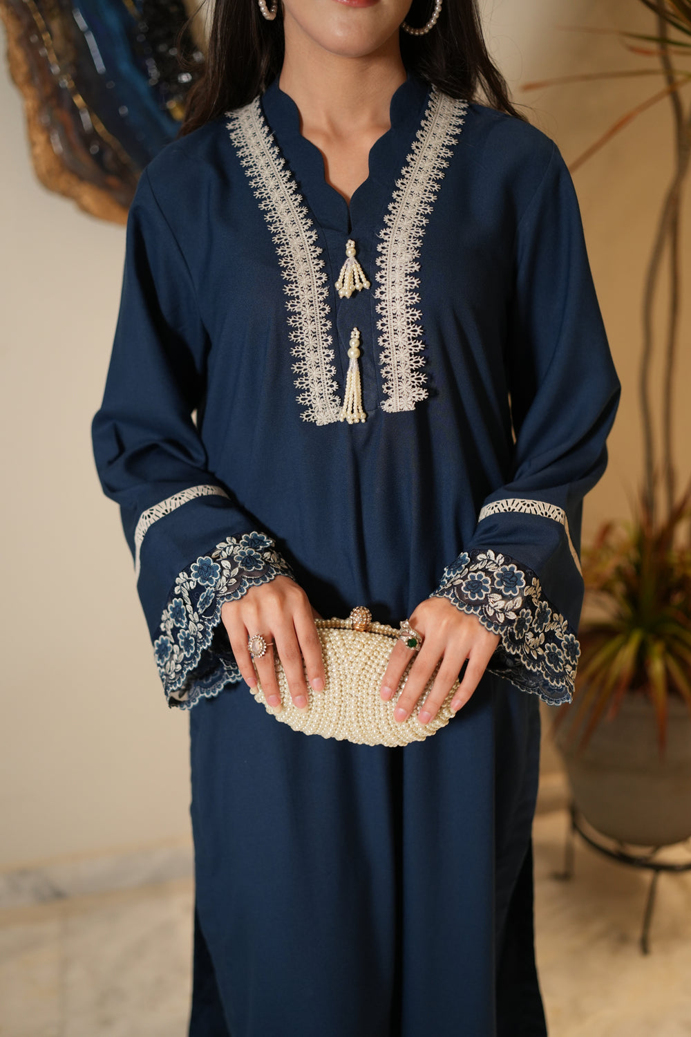 Elevate your wardrobe with ALEA, a two-piece marina ensemble. Featuring a straight, loose-fit shirt paired with matching trousers, it is delicately enhanced with net lace detailing on the sleeves and daman. The scalloped neckline, adorned with intricate lace and pearl tassels, adds a touch of timeless elegance—perfect for festive occasions or graceful everyday wear.