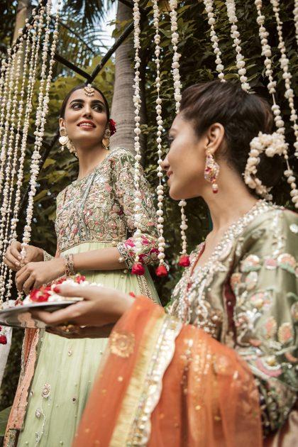 Multi-colored tissue Angrakha Shirt all handworked. Sharara with work of gotta, dupatta with a spray of gotta.