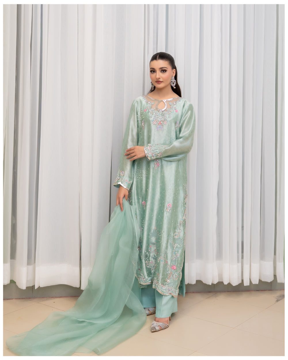 Aqua blue pure tissue silk outfit with all hand work of mukesh, resham , crystals swarovski, dabka, kora paired with plain trouser and pure organza dupatta .