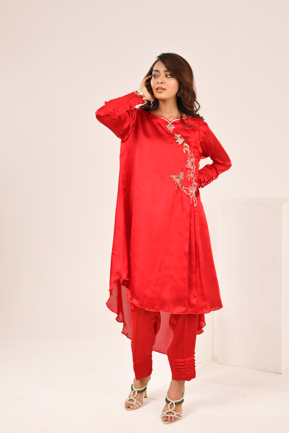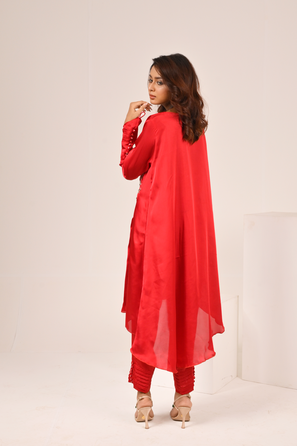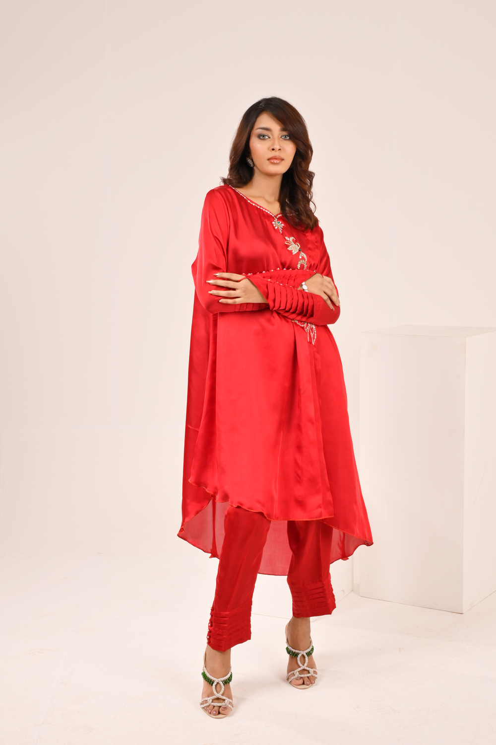 This elegant ensemble features a flowing silk flared shirt with a stylish high-low cut bottom, paired with trousers showcasing refined pleated details. The graceful design blends modern sophistication with timeless charm. The front of the shirt is adorned with sparkling diamantes and sequins, complemented by intricate pleated accents on the sleeves and trouser bottoms, creating a polished and cohesive look.