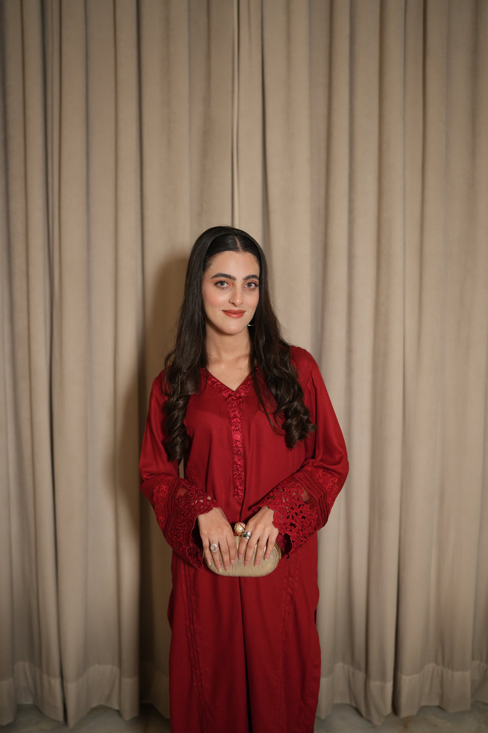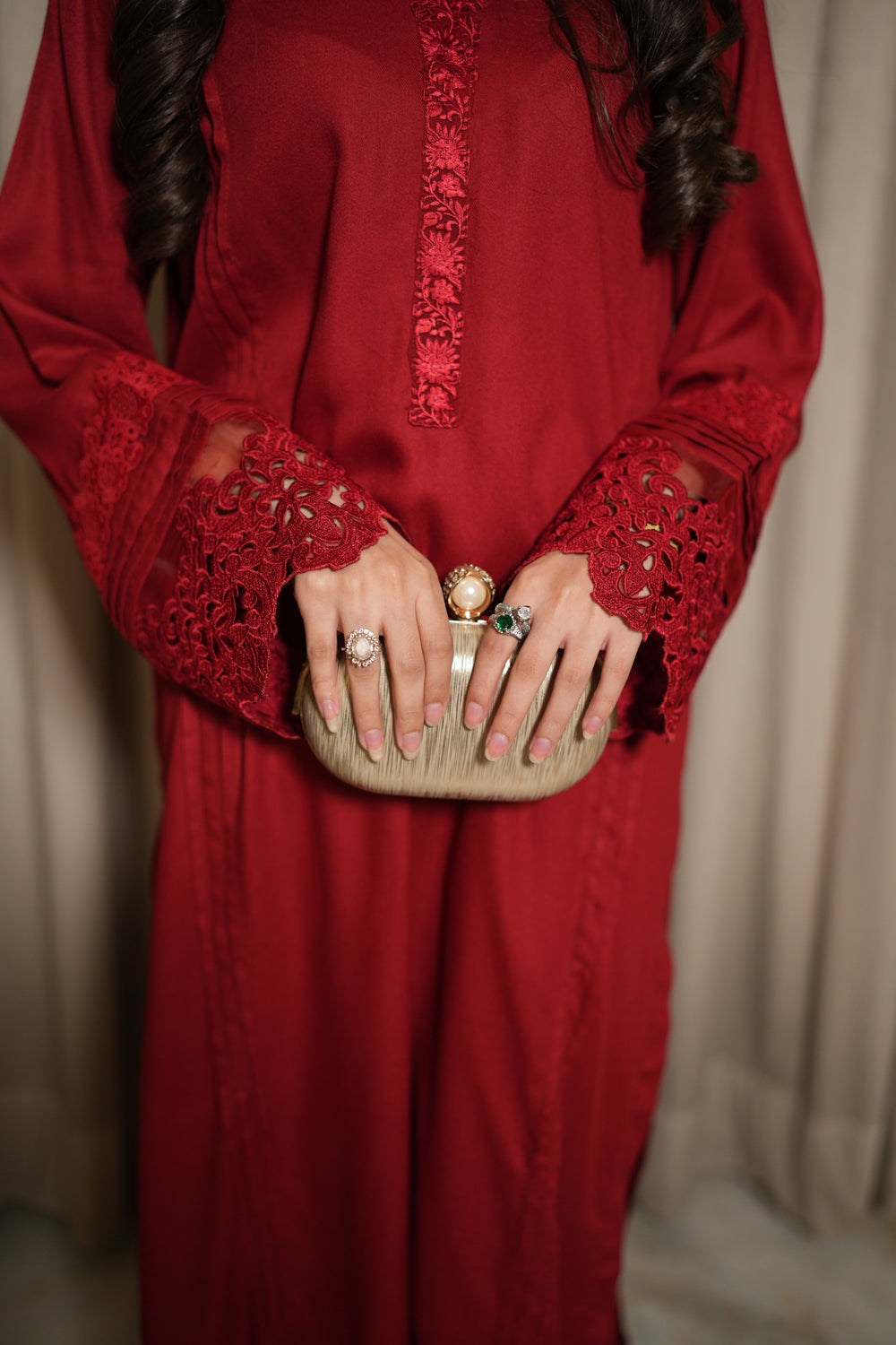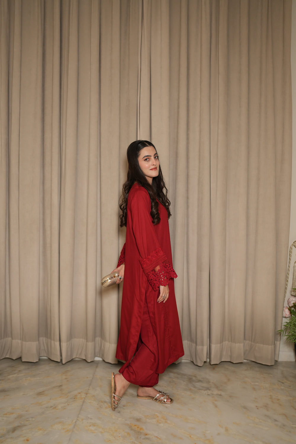 Stand out in AYELE, a beautiful red marina two-piece made from pure merina. The straight-fit shirt has same-color lace on the sleeves with delicate pleats for added detail. A thin organza lace decorates the neckline, and soft pleats run from top to bottom, giving it a graceful and elegant look. Perfect for festive occasions or special gatherings.
