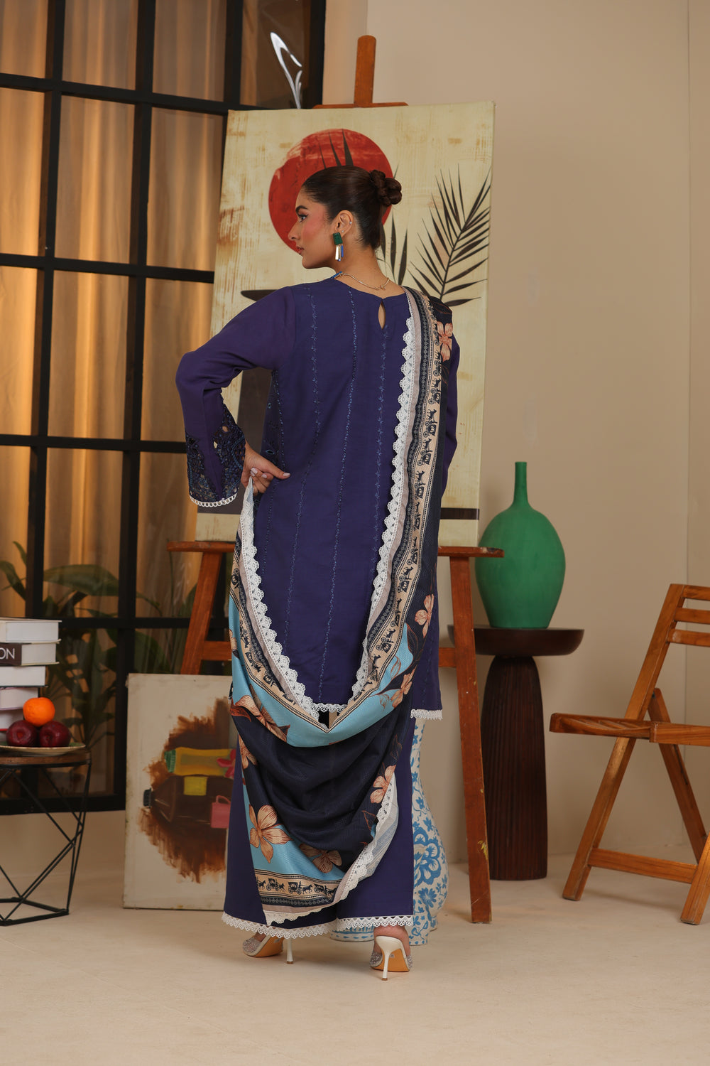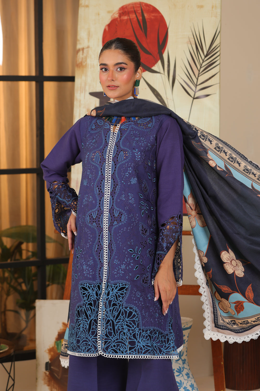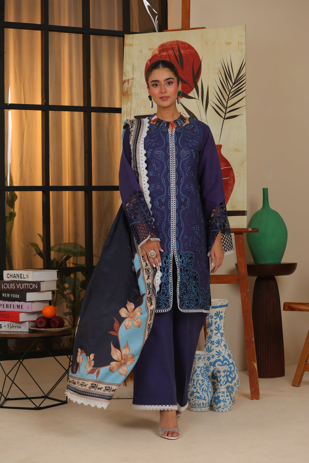 Azura 3-piece khaddar suit with embroidered shirt, dobby net shawl, and coordinating trousers. Available in stitched