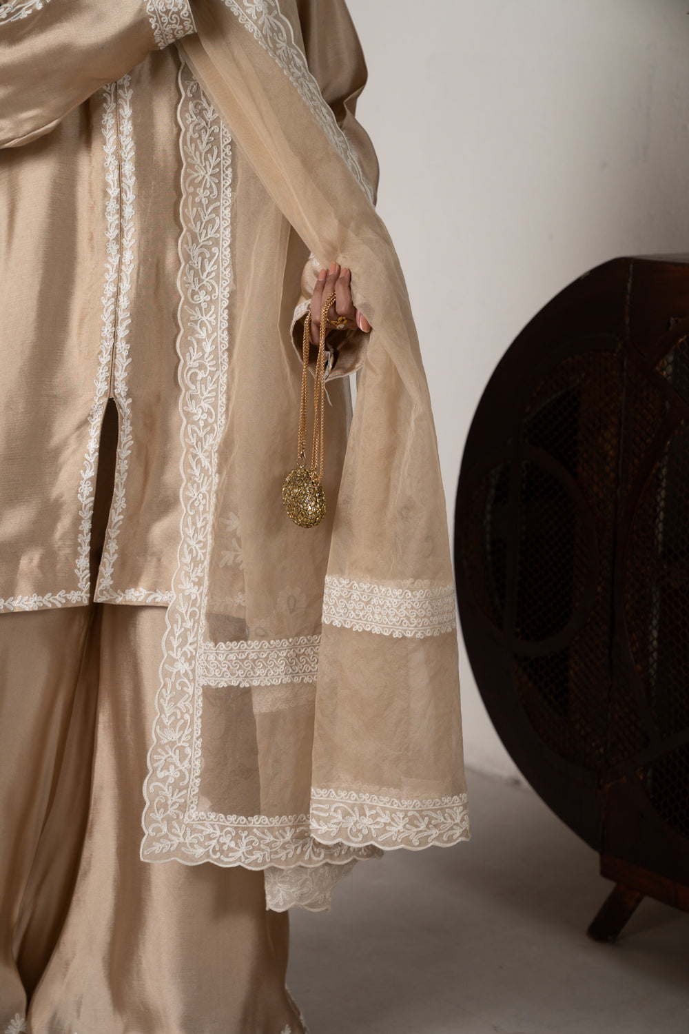This elegant beige outfit is crafted from premium tissue silk, beautifully embroidered to create a timeless and sophisticated design. The rich texture of the fabric combined with delicate embellishments makes it ideal for formal gatherings and celebratory events.