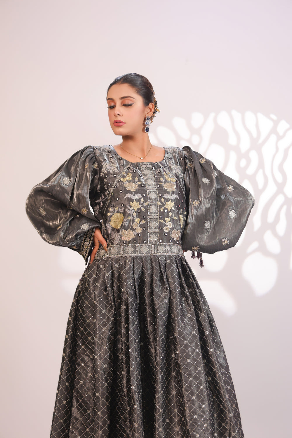 High‑quality black shimmer base fabric blended with luxurious gold,silver embroidery and fine sequin embellishments giving sparking effect.