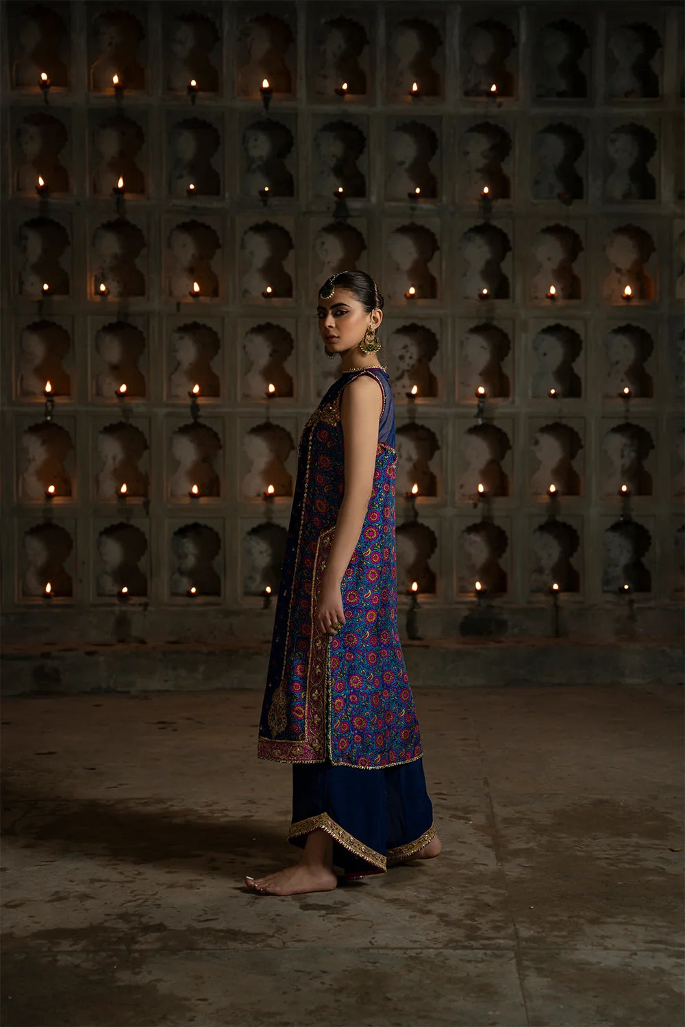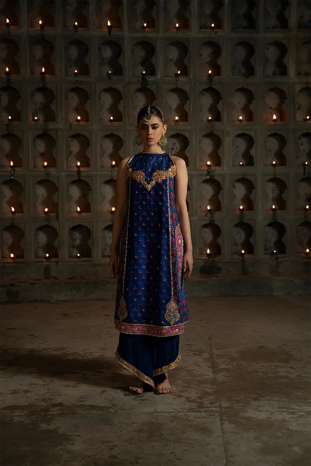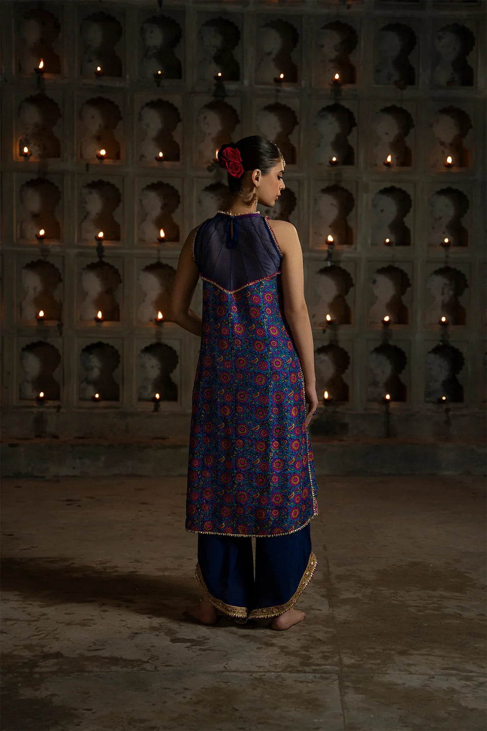 Embrace the artistry of every stitch with this mesmerizing block printed shirt, a canvas of blues and teals interwoven with bursts of pink and yellow. The intricate floral motif at its heart is a testament to timeless craftsmanship, complemented by delicate hand-worked borders. Paired with asymmetric pants adorned with vibrant yellow block prints