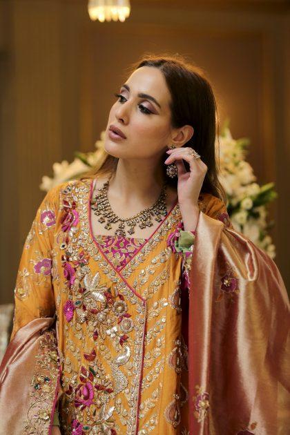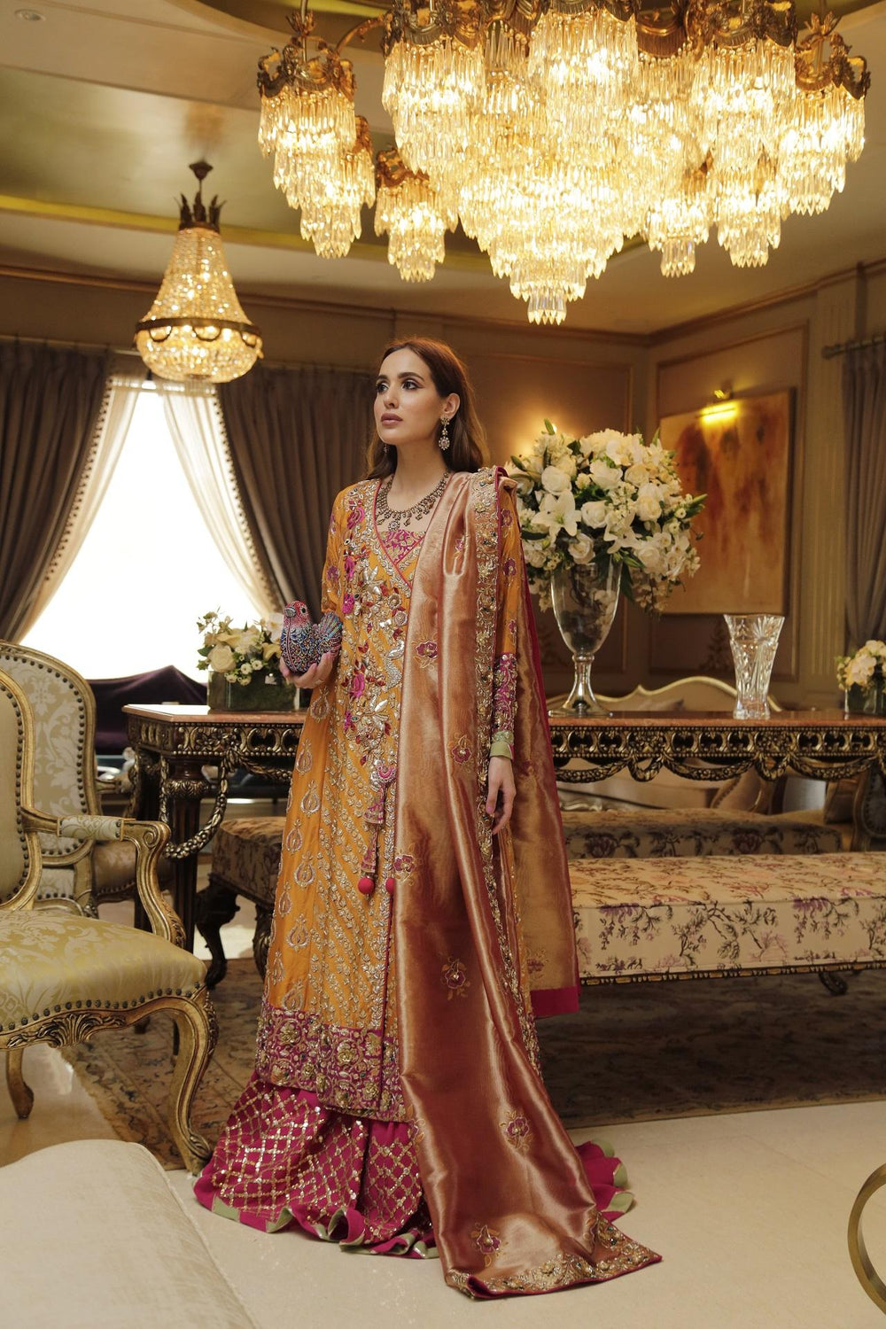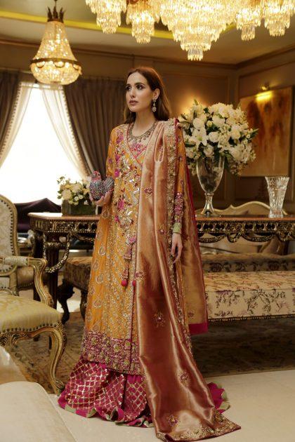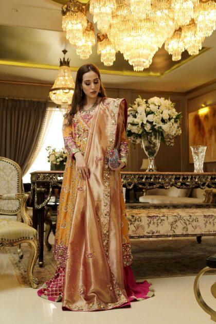 Burnt orange angrakha block printed and handworked with tissue duppata along with handworked lehenga.