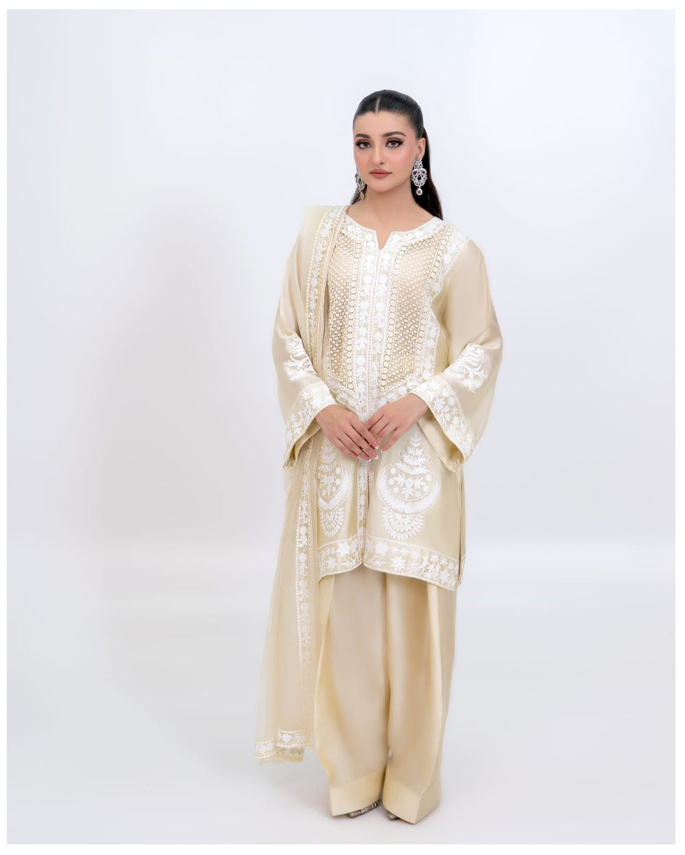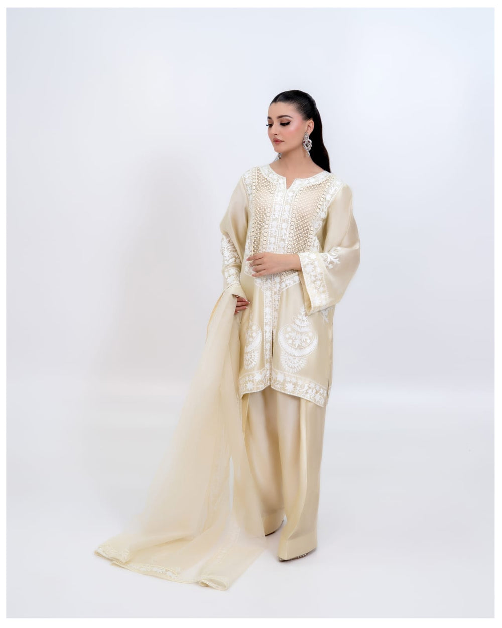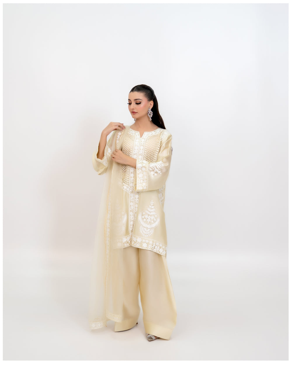Butter yellow tissue silk outfit with embroidery and crochet applique , paired with farshi shalwar and pure organza dupatta