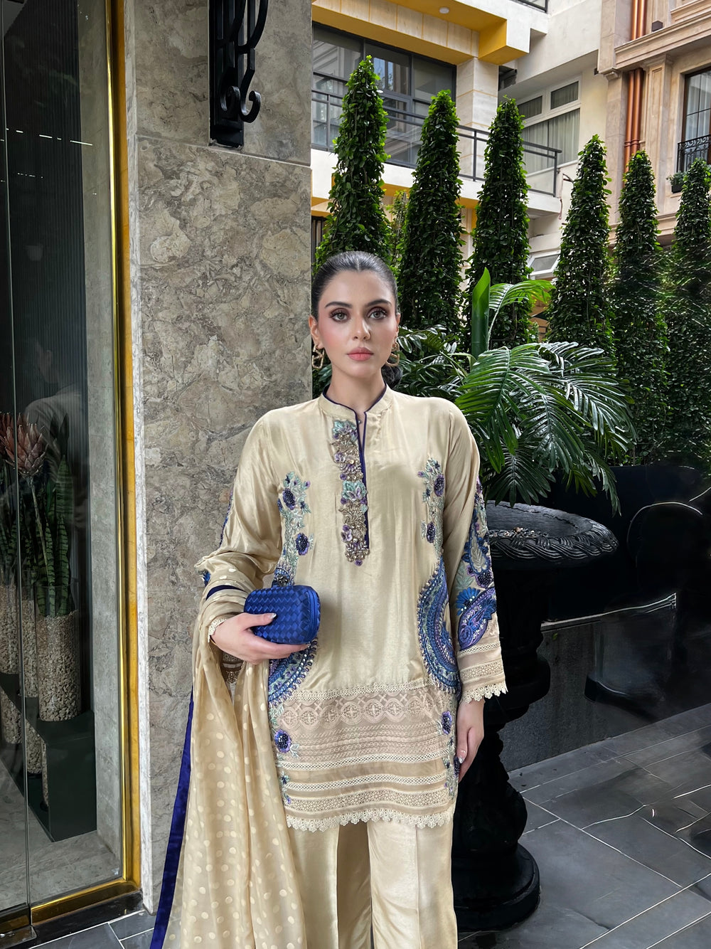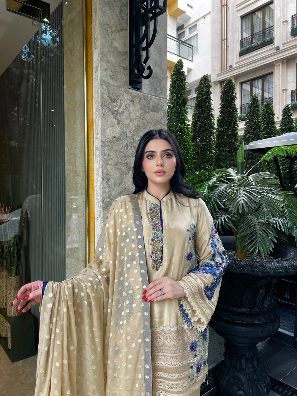 ● Handworked 3D embellishments on neckline featuring pearls, sequins, and cut-dana detailing