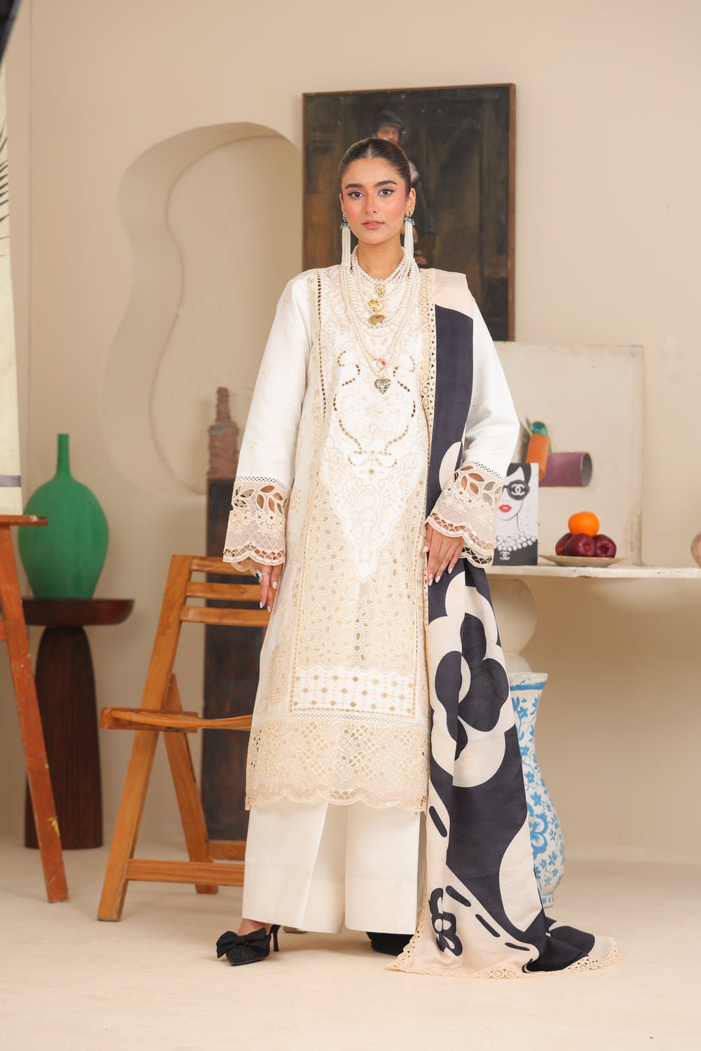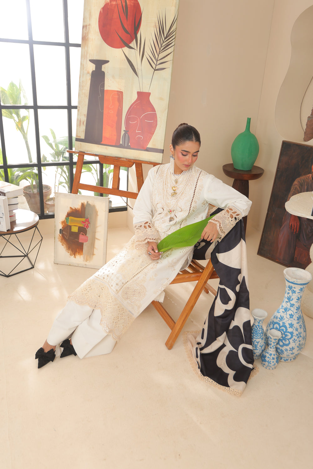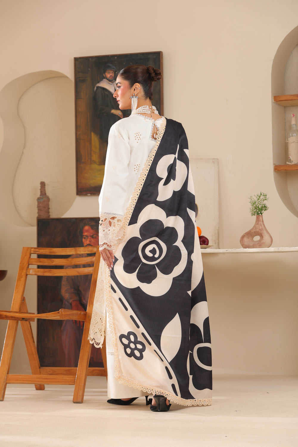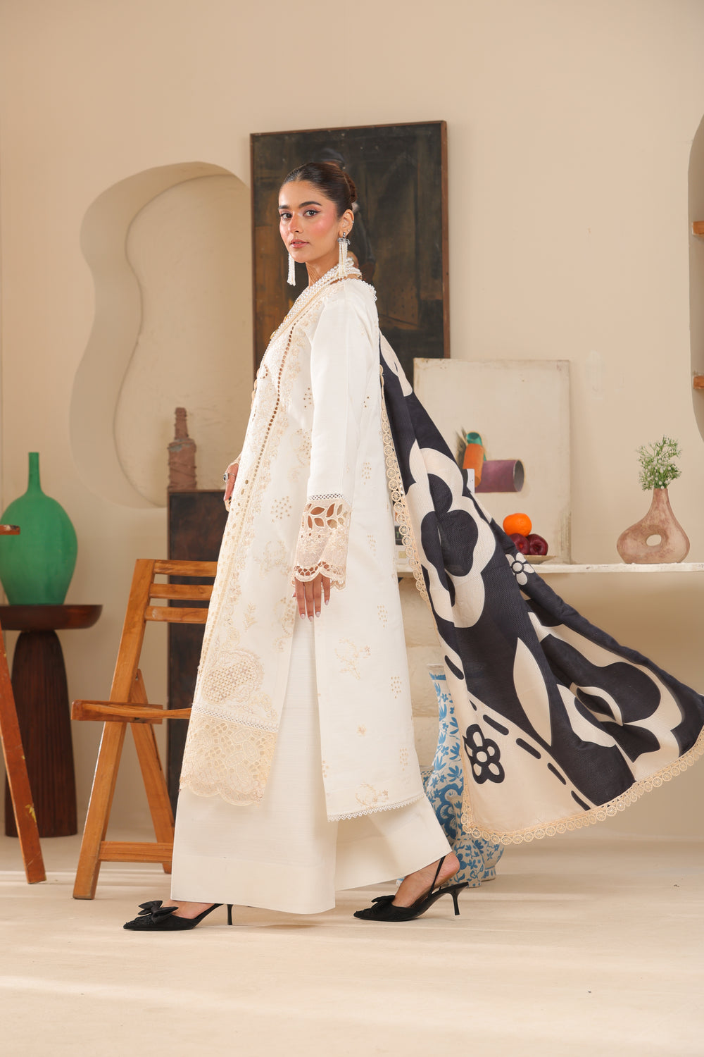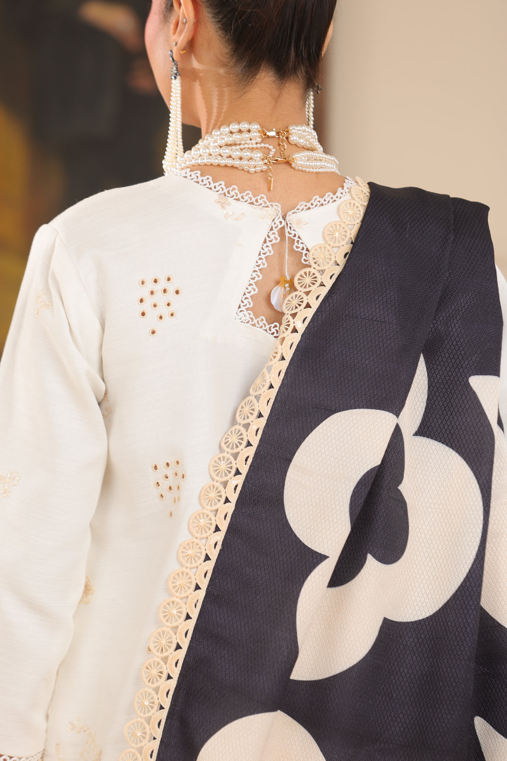 A classic off-white canvas, elevated with an intricate embroidery masterpiece on slub khaddar and dobby net —