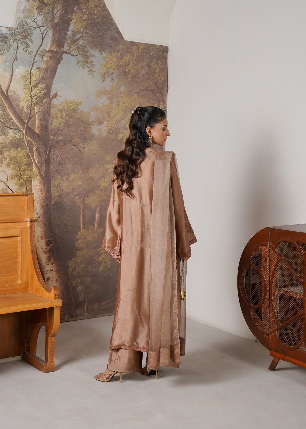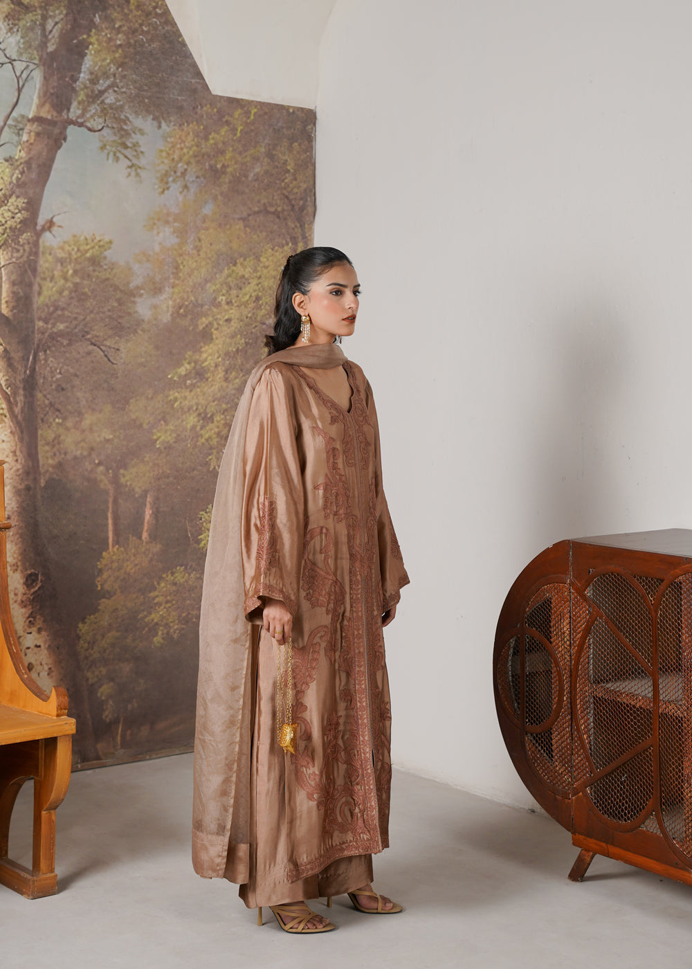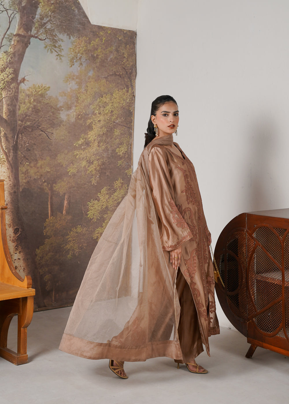 This elegant chocolate brown ensemble is crafted from luxurious tissue silk, offering a graceful fall and subtle sheen. The outfit is beautifully adorned with intricate embroidery and detailed dori work, creating a timeless design that blends tradition with sophistication.