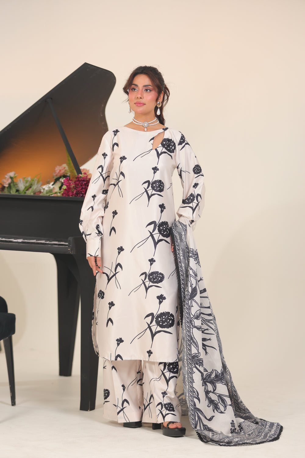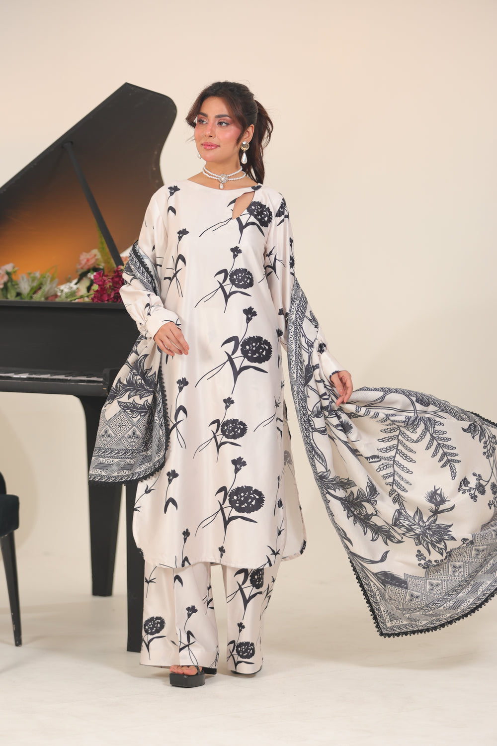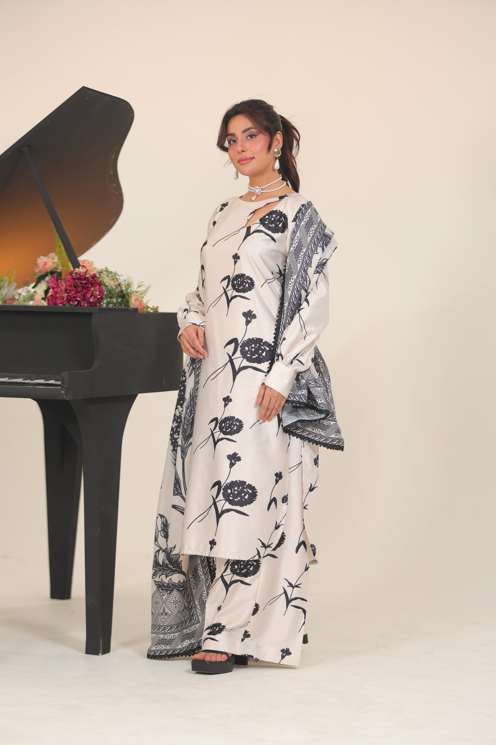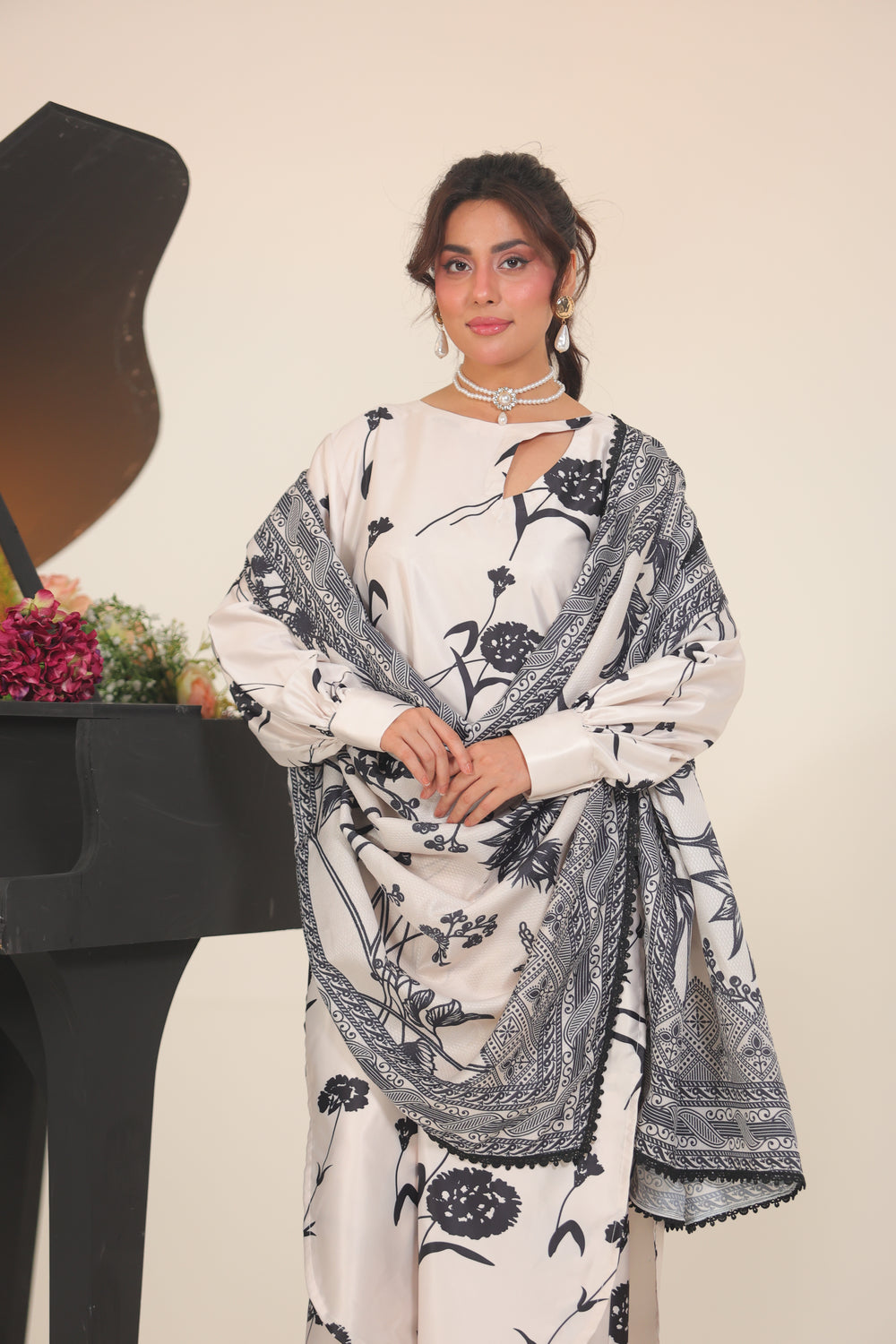 Unstitched The Clara 3-piece satin silk ensemble pairs a chic printed shirt with a delicate dobbie net shawl and matching trousers,