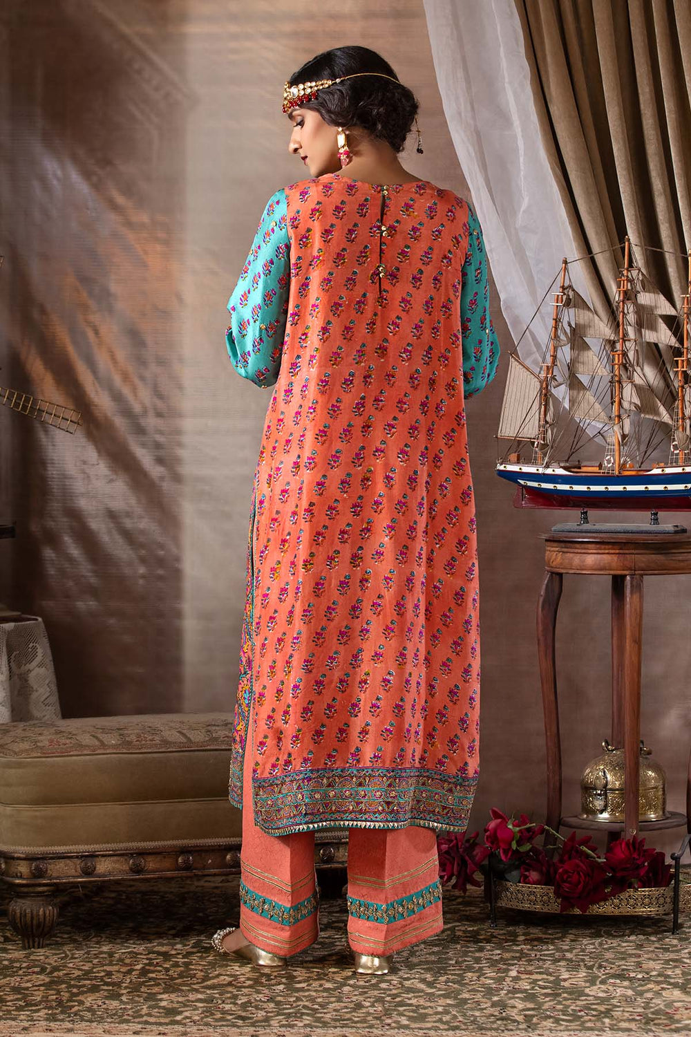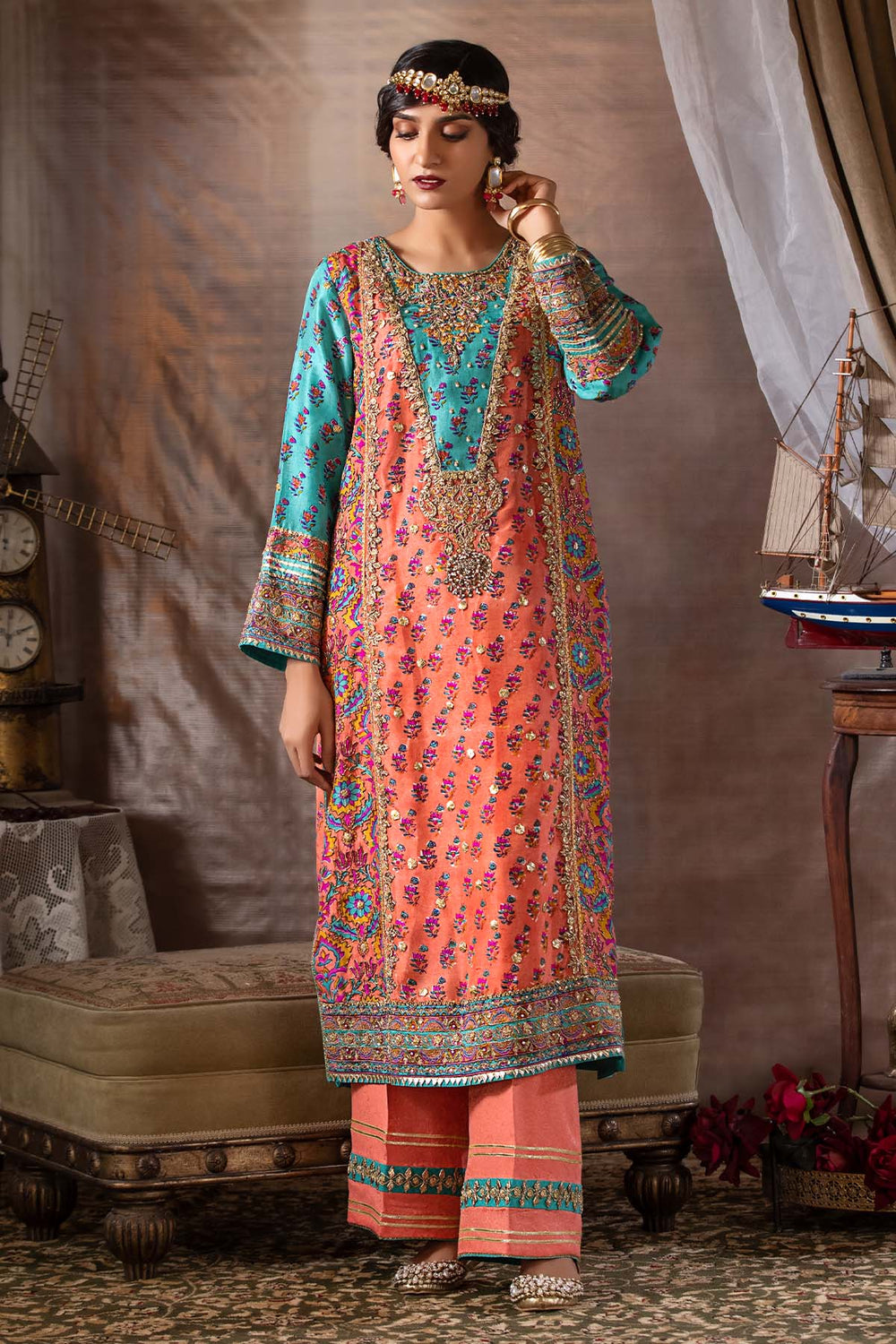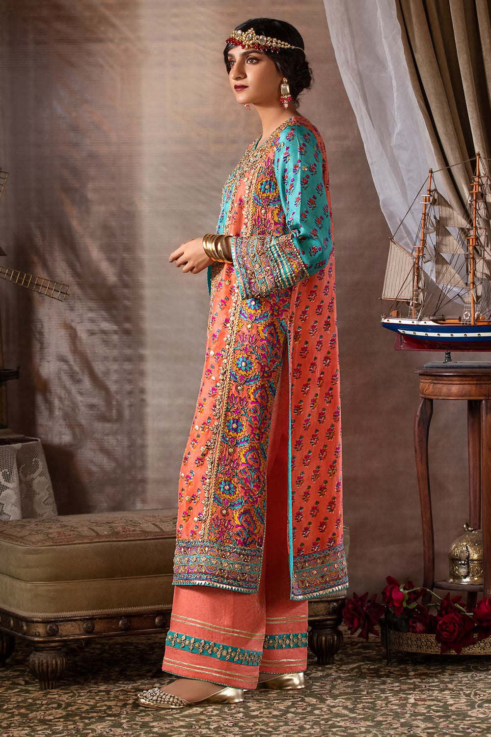 The striking combination of Coral and Turquoise colors creates a harmonious and eye-catching palette. Adorning the neckline is a mesmerizing display of gota work, further enhanced with a fully worked neckline and sleeves. Paired with straight pants.