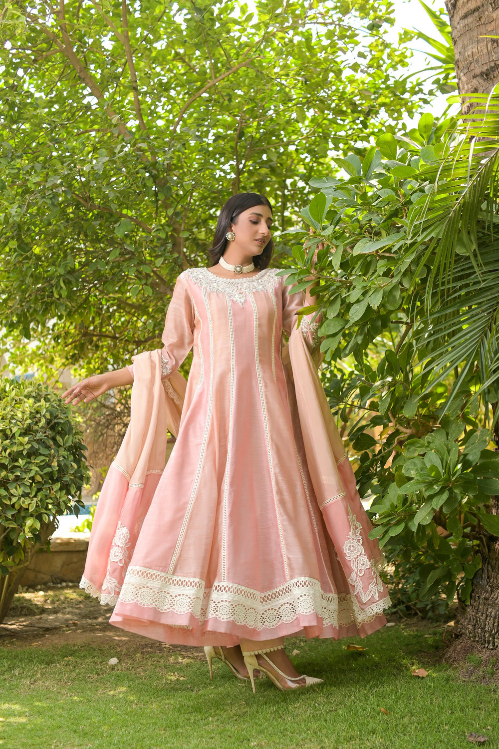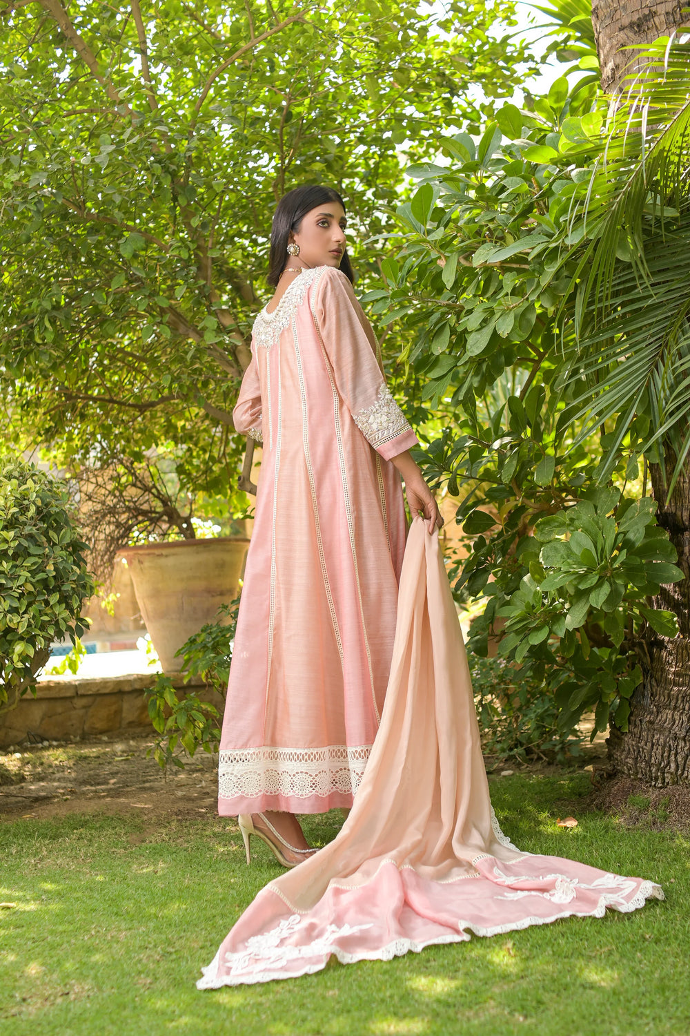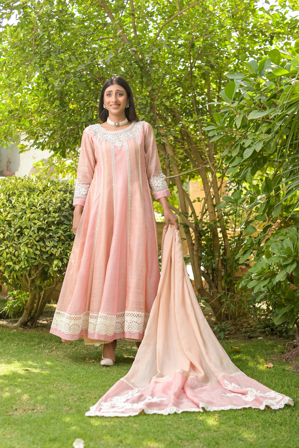 1)Cotton Silk fully embroidered panel flared frock with heavy hand Embroidered neckline & Sleeves (Rasham,nakshi,pearls,etc) with embellished work all over with laces and borders detailing gheera edges. 2)Silk pants loose bottom with embellishment. 3) Silk 2tone dupatta with motifs embellishment and fall detailing edges. Complete 3pcs Stitched (Same as Shown in pictures).
