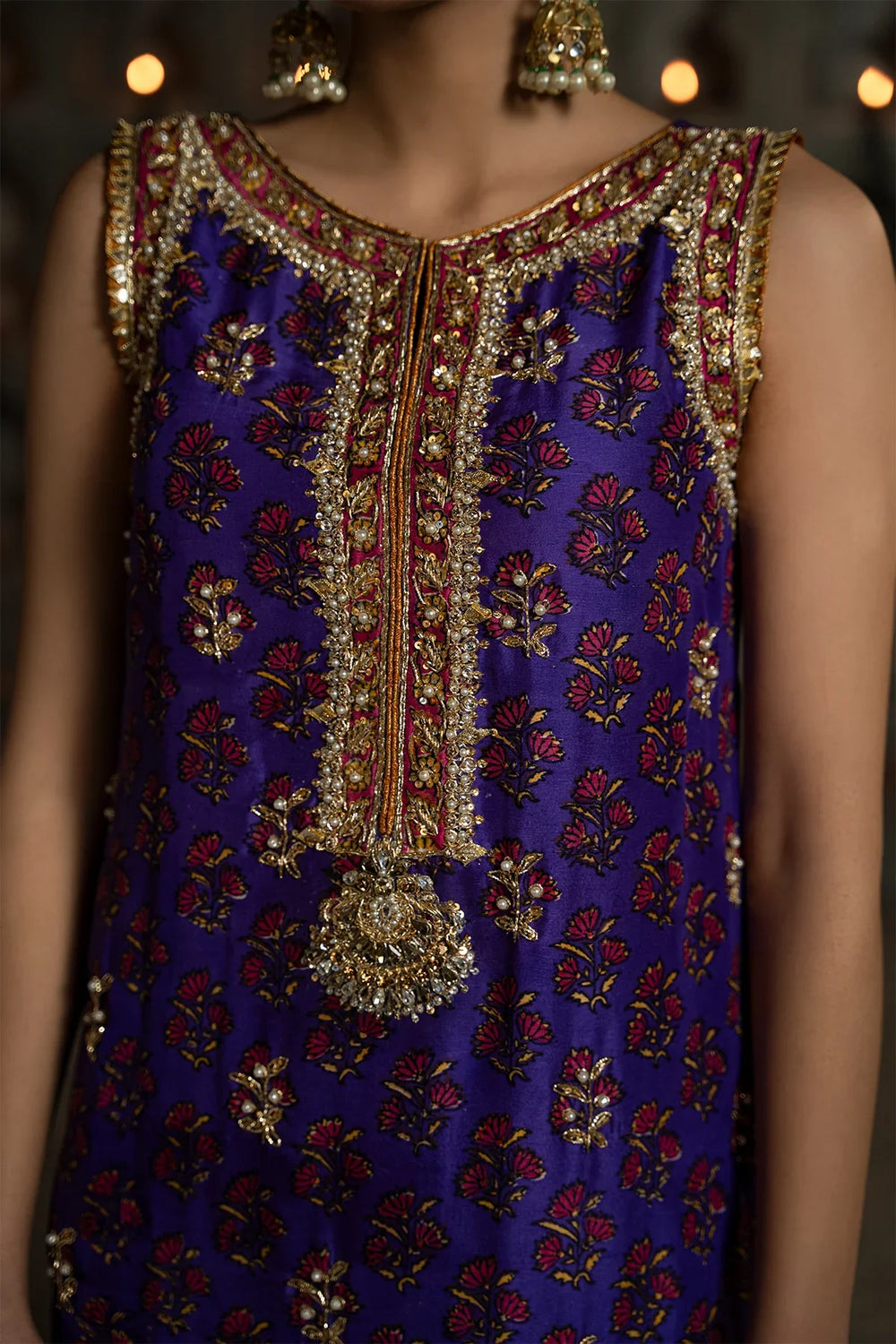 Elevate your style with the allure of deep purple in this exquisite block printed raw silk shirt. Contrasting coral and mustard borders on the neckline and hem add a pop of vibrancy to the rich hue. Hand embellished with intricate gold dabka, naqshi, champagne sequins, and crystals, every detail shimmers with elegance. Finished with delicate gotta, Paired with matching purple azar pants.