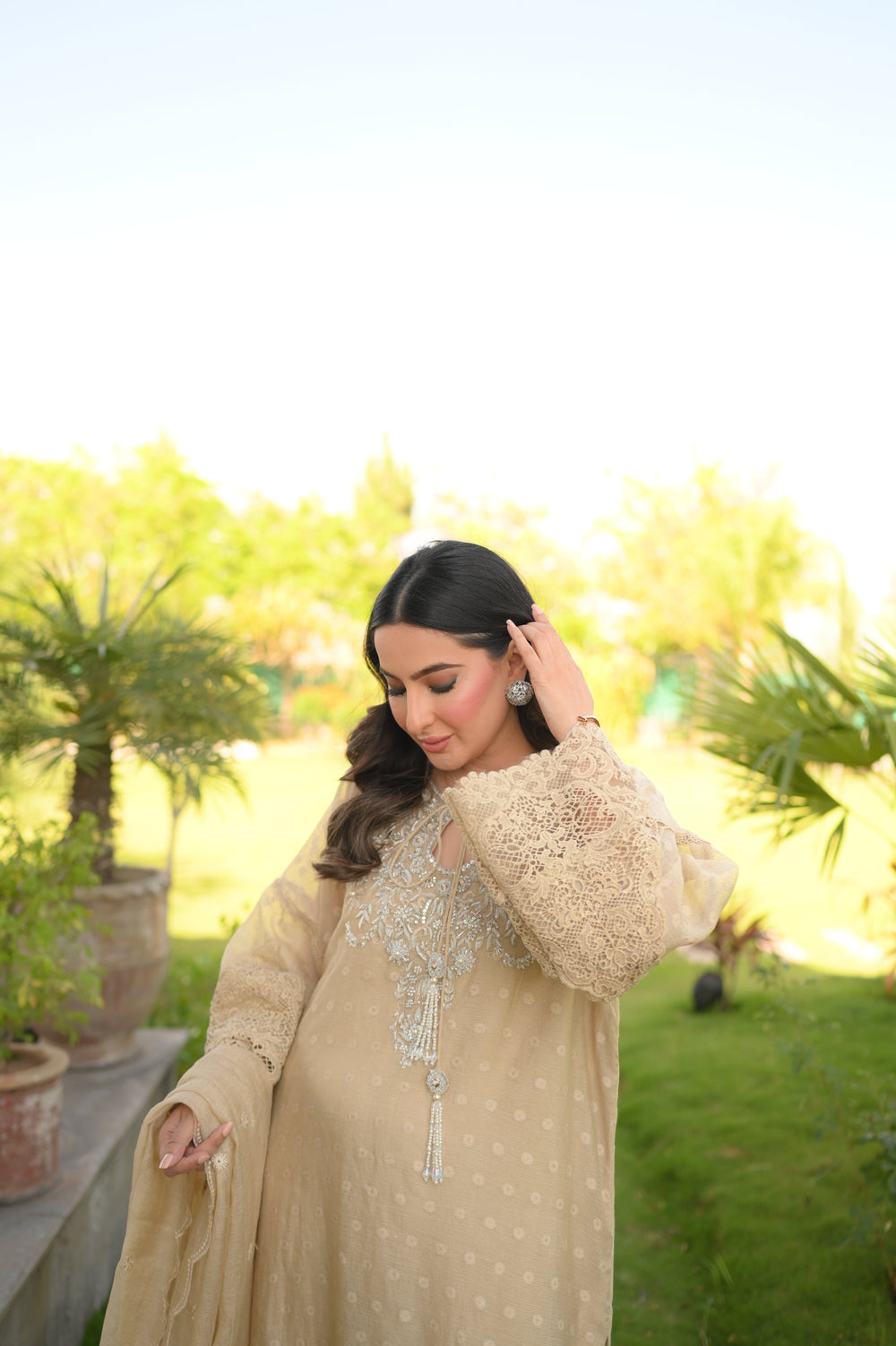 Dusty beige pure khadi net outfit with handworked on it paired with crepe trousers and embroidered scalloped khadi net dupatta .