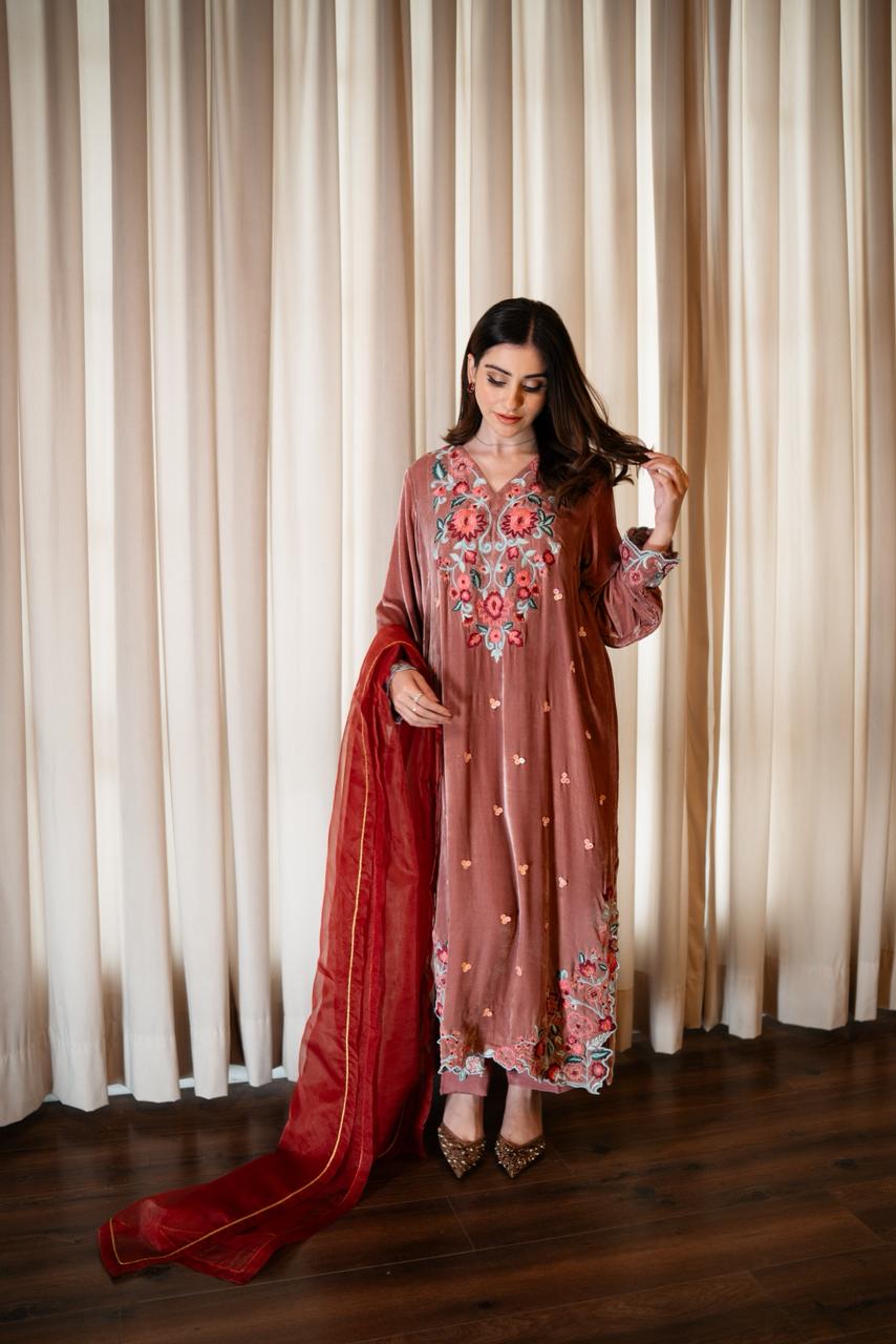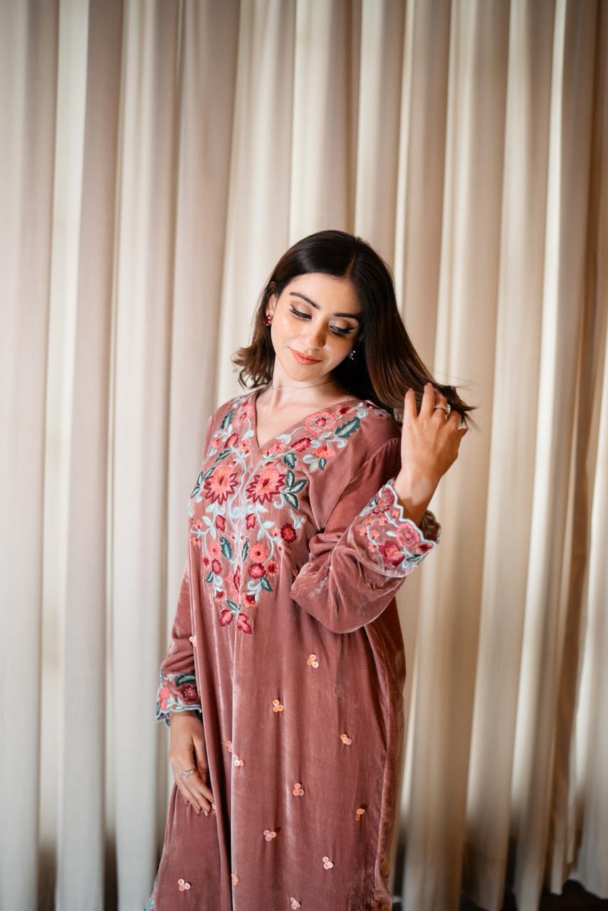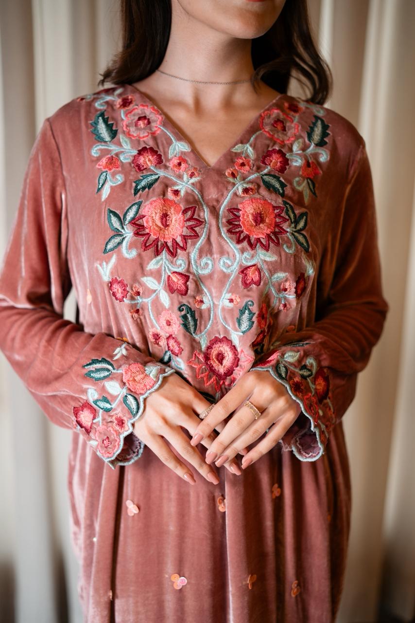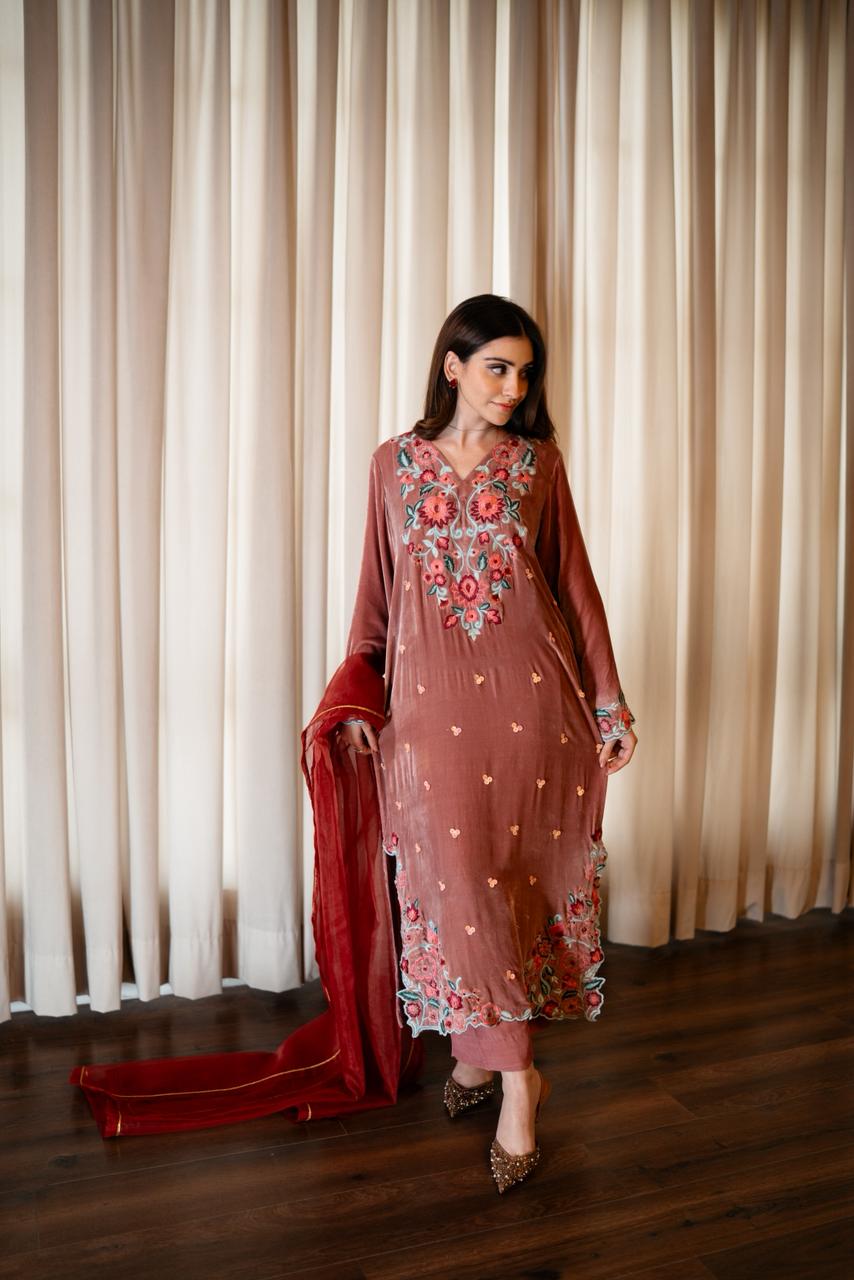 ELIA is a soft yet striking three-piece featuring a light pink French velvet kaftan paired with silk trousers and a contrasting dark pink organza dupatta. The kaftan showcases an intricately embroidered statement neckline, complemented by embroidered corners on the daman and detailed sleeve borders. A subtle spread of peach-toned sequins runs across the shirt, adding texture and gentle shine. ELIA is designed for those who appreciate understated luxury with refined embellishment.