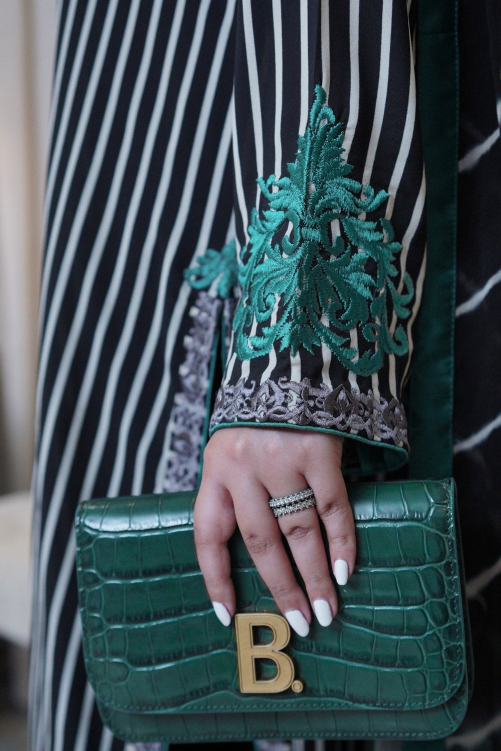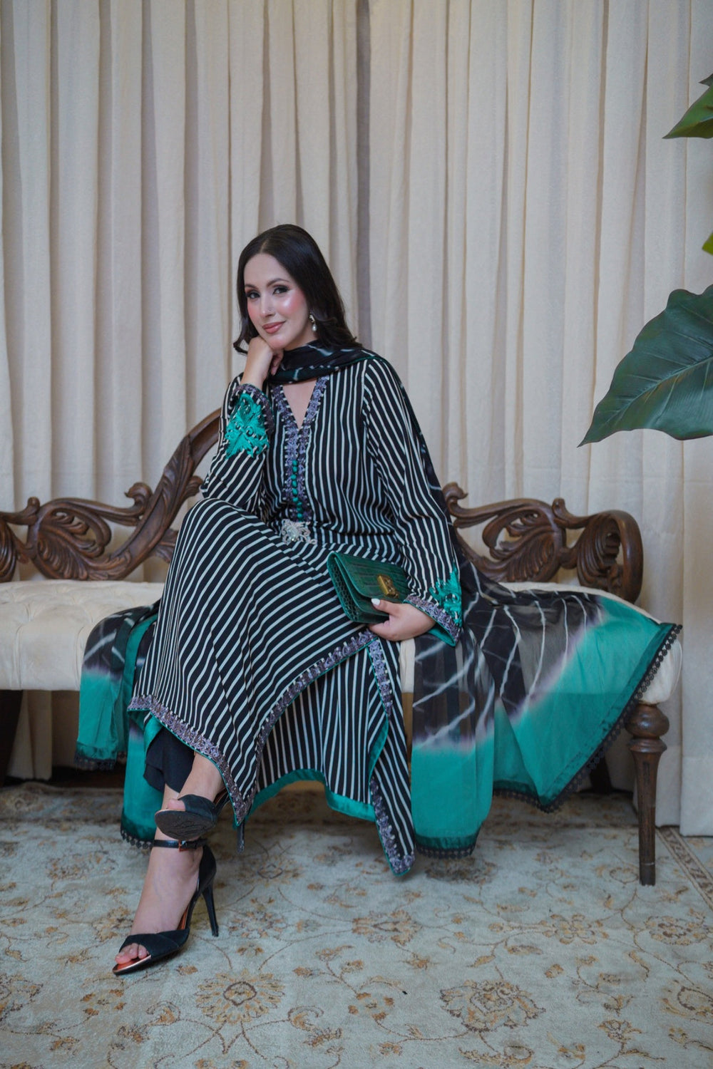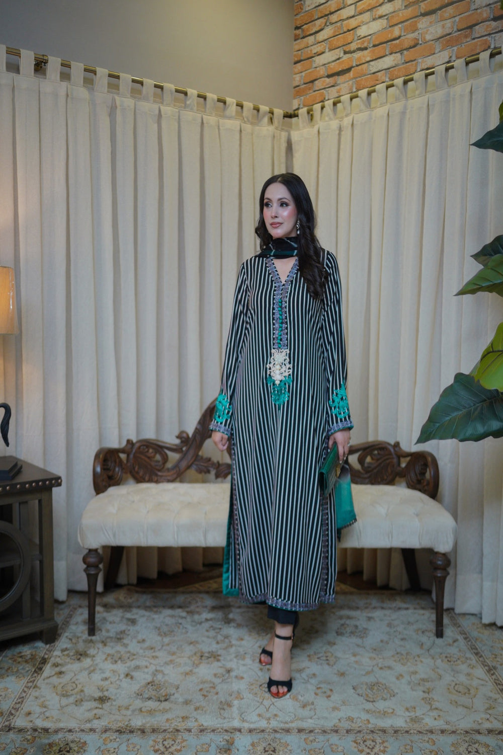 A sophisticated grip georgette ensemble featuring classic vertical black and white stripes, tailored in a straight-cut silhouette with subtle side slits. The neckline is adorned with delicate embroidery in emberald and ivory tones, finished with an eye-catching ivory tassel detail that adds a graceful touch. Intricately embroidered cuffs in striking Emberald green motif enhances the sleeves, while the outfit is paired with sleek black trousers and a rich emerald & black stripe dyed dupatta for a bold contrast. A refined look that blends minimalism with a pop of festive elegance.