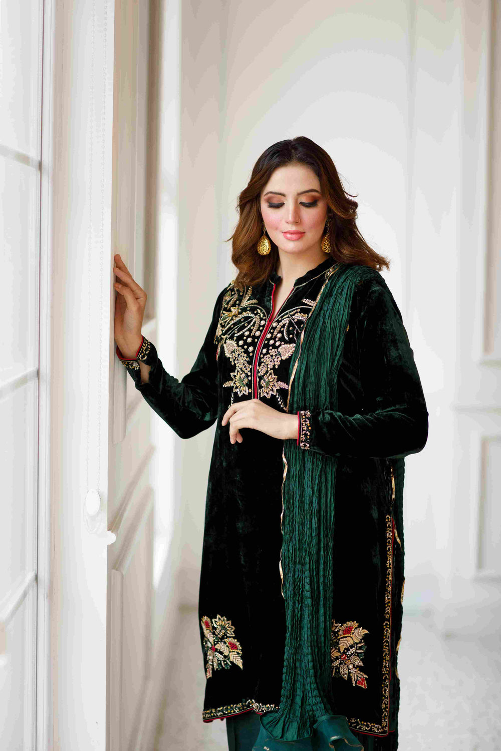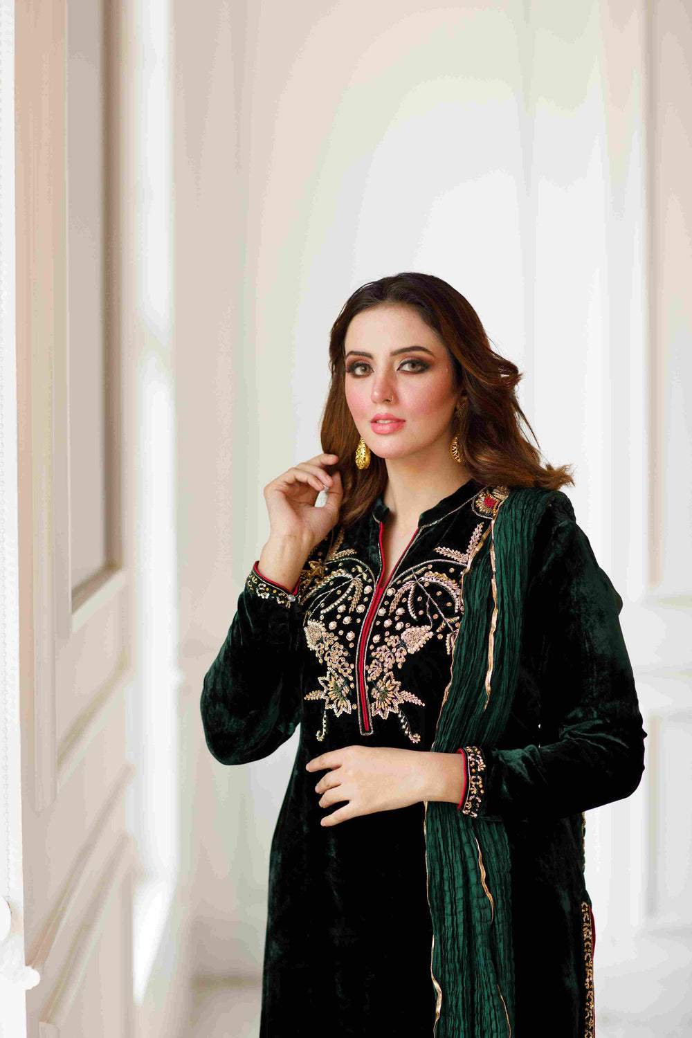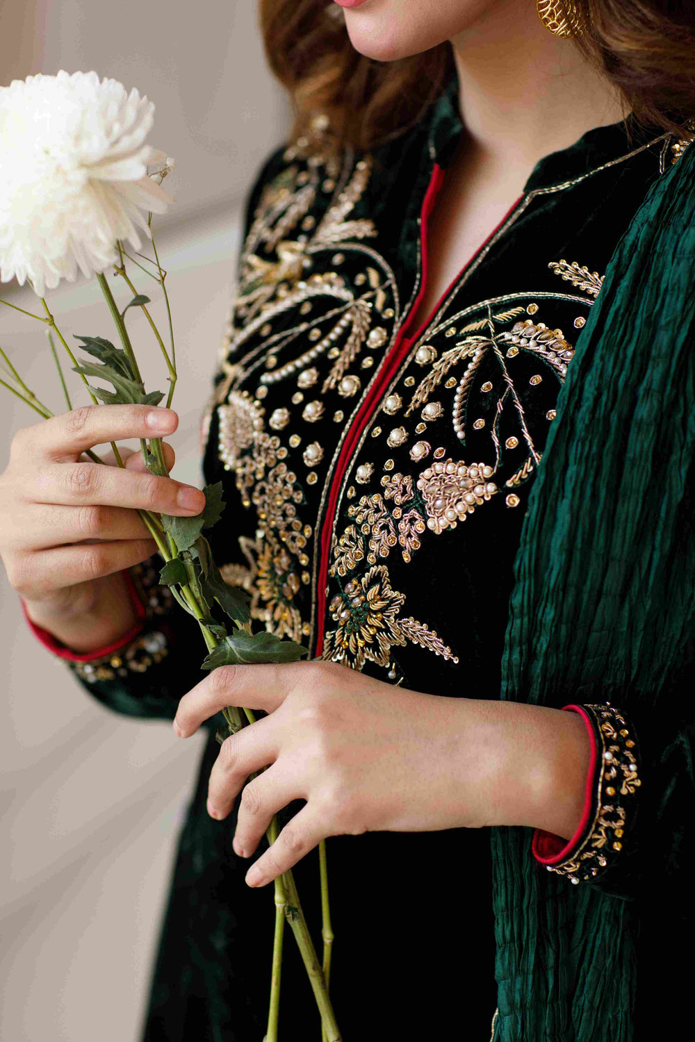 3-piece Emerald green velvet with hand worked neckline, embellished with resham, kora and dabka, paired with Korean silk pants and hand worked medium silk dupatta finished with organza frills.