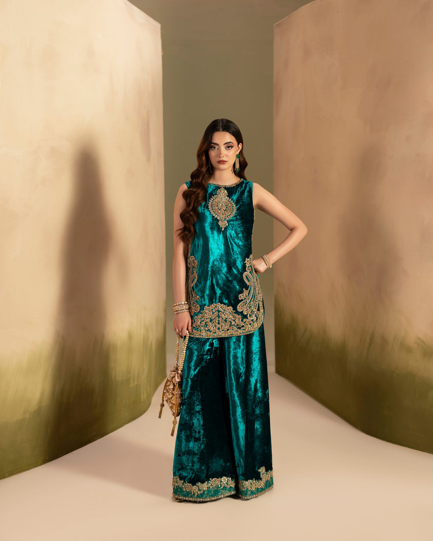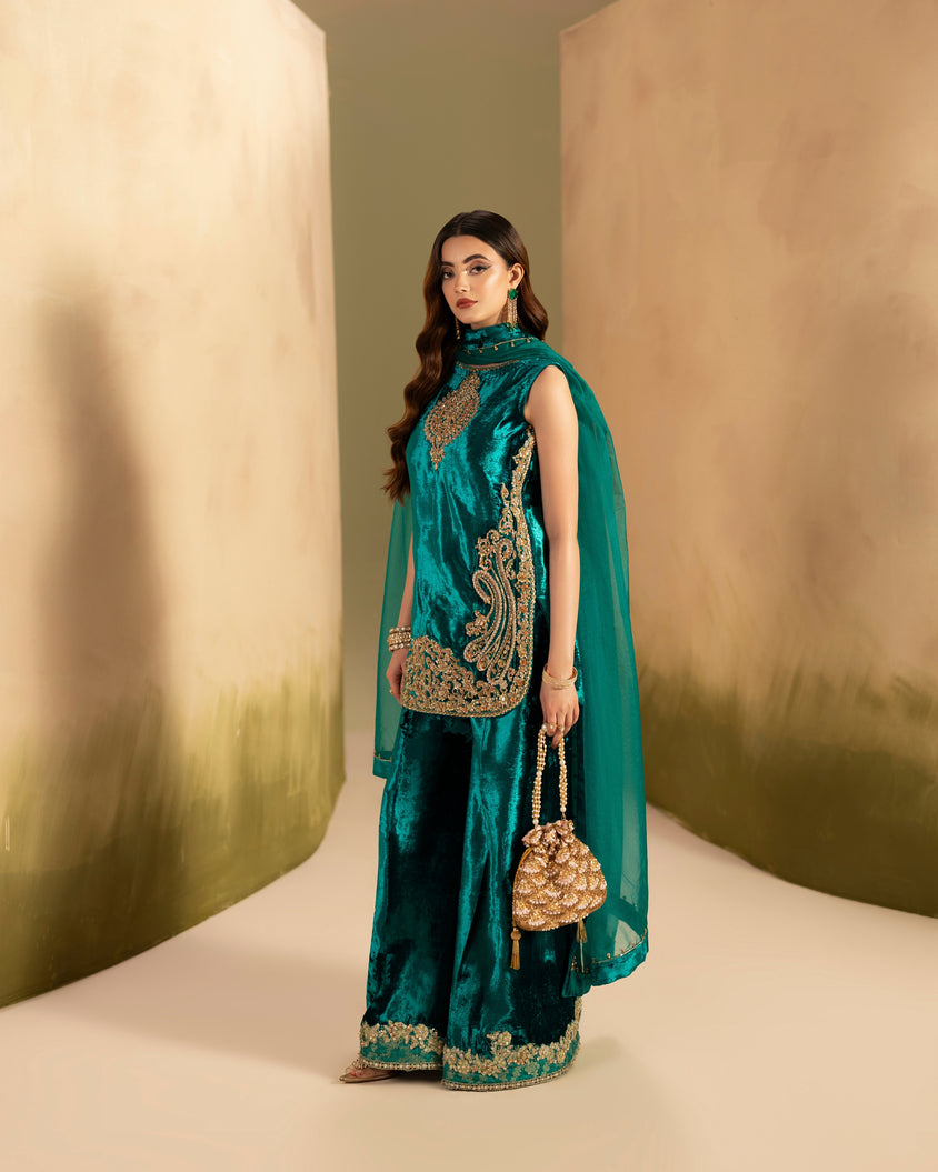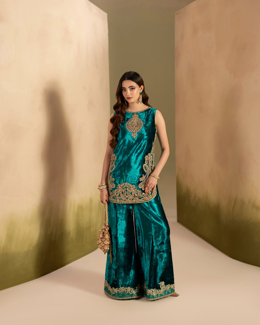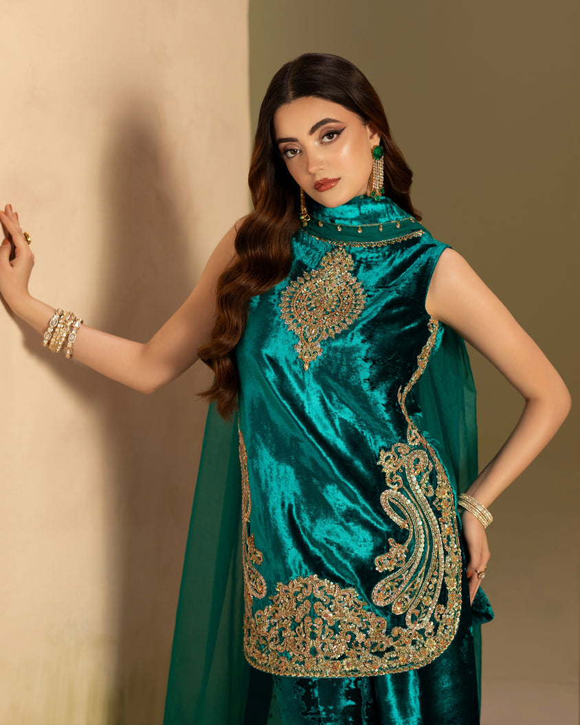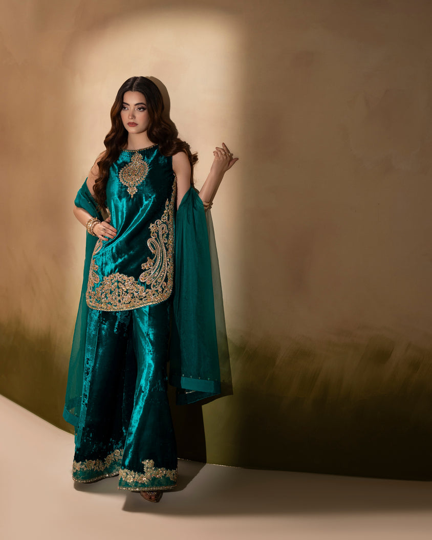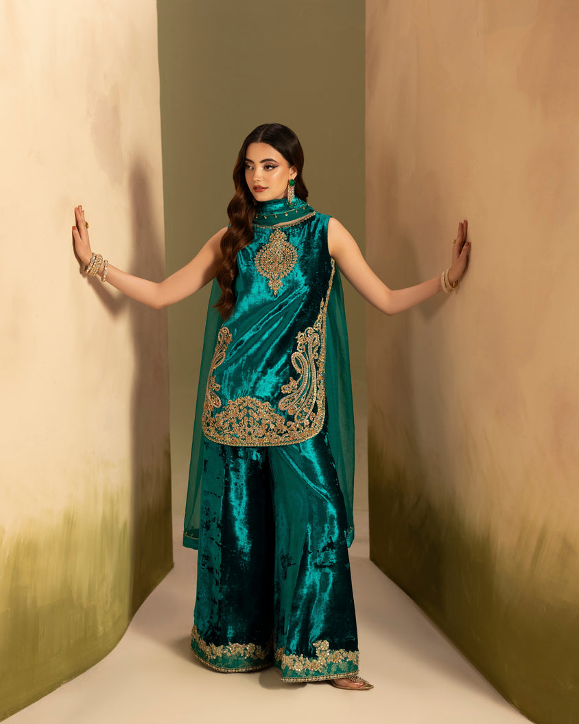 Velvet Sharara and an organza dupatta complete this rich Zink Velvet outfit, which includes a Short shirt with a delicate pattern and exquisite hand-embellished antique and light gold work. A festive formal attire that exudes haute elegance and is both spectacular and sophisticated.