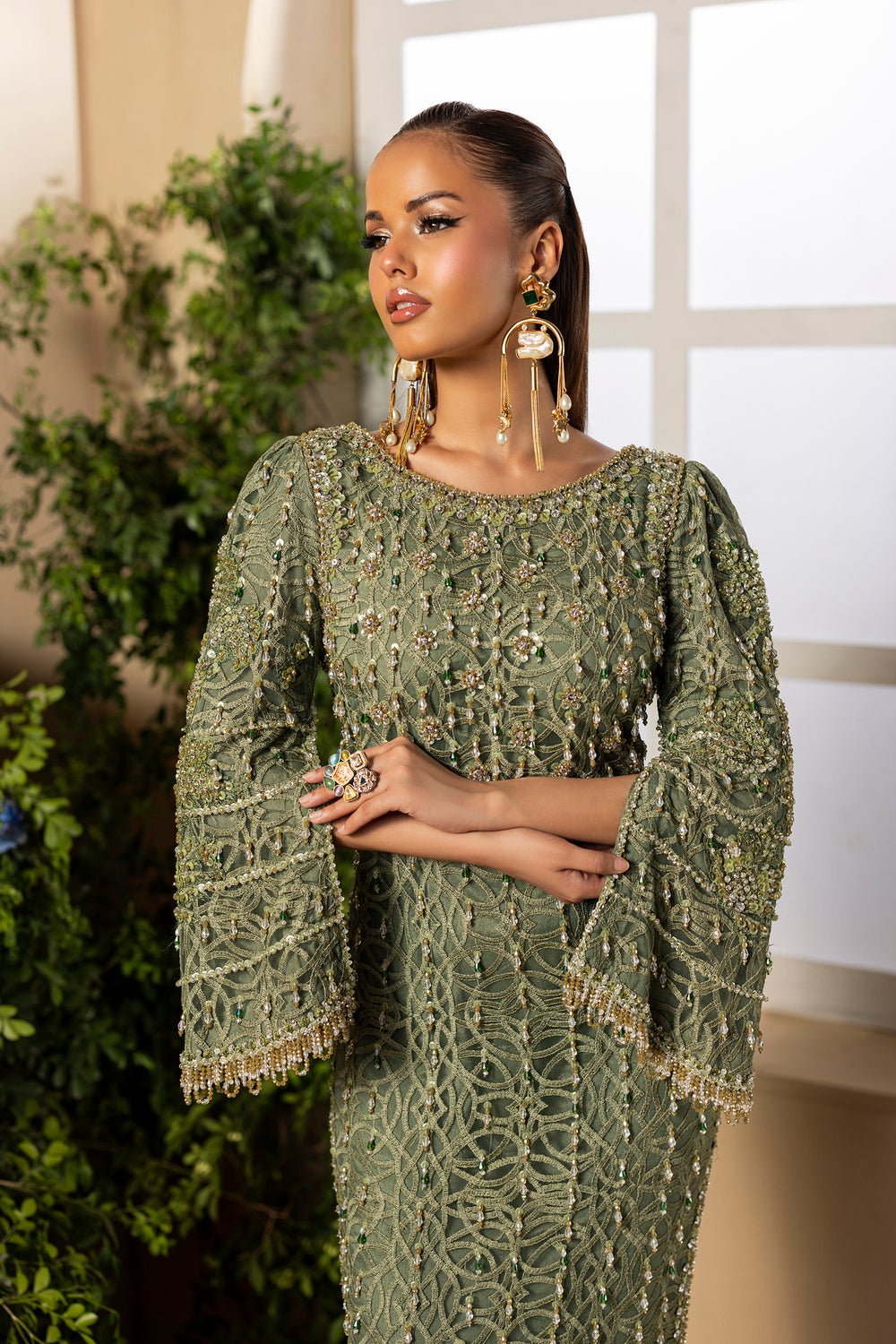 Gorgeous western-style bodygown garment made of net in ocean green with lovely circular jall embroidery, embellished in a completely different and completely opposite style from the based designs This body gown has an exquisite border around the sides that appears to be locking the raindrops that are hung from it, and its open sleeves, which are adorned with flowers, give even more appeal.