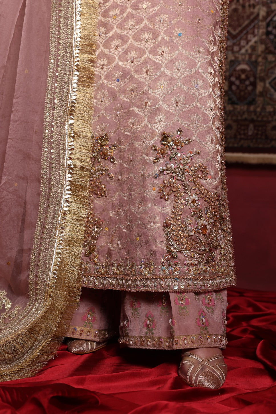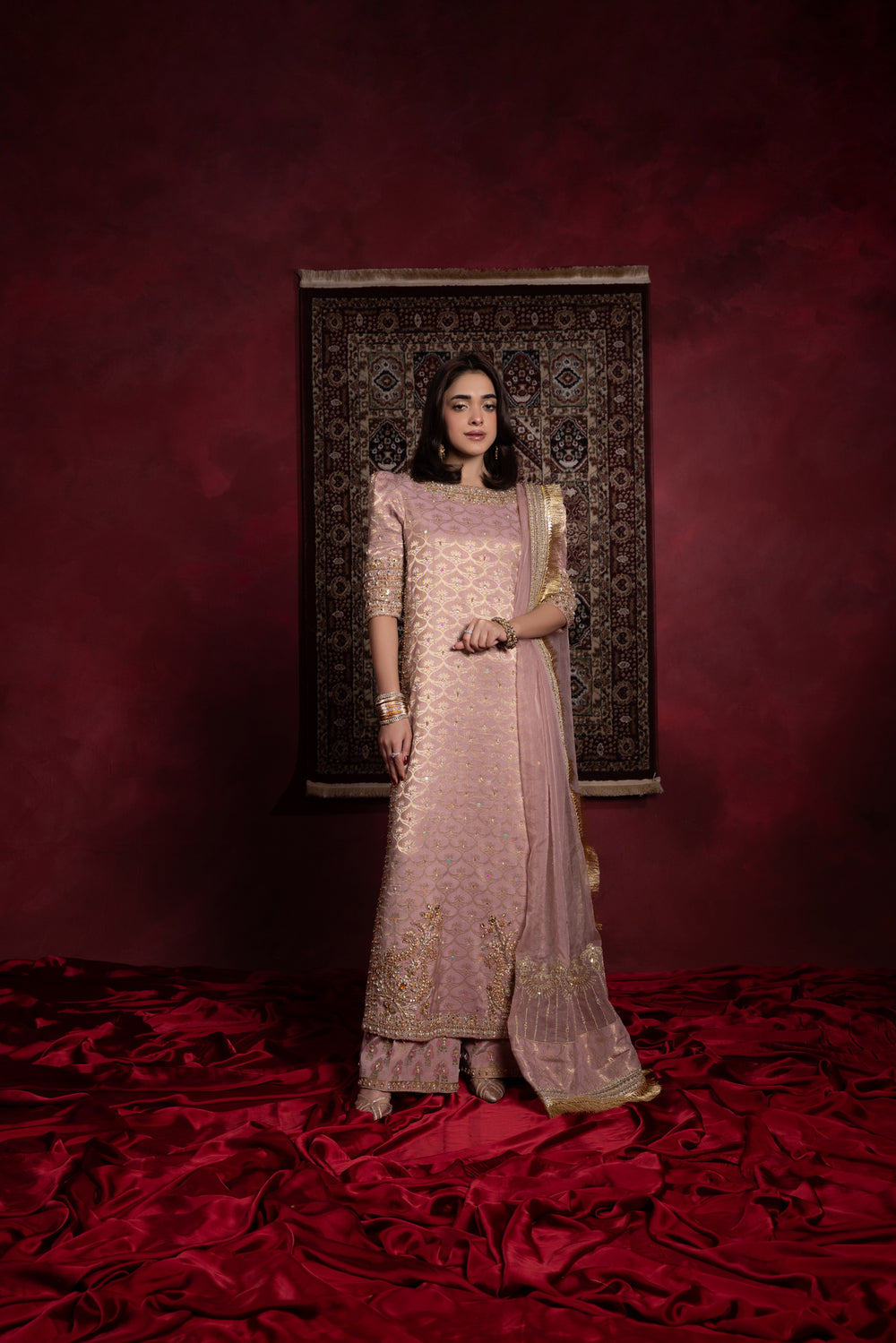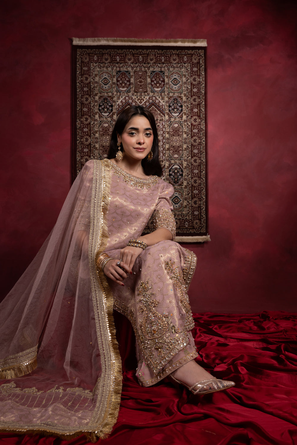 The liliac colour attire shirt based on Jacquard shirt with full side border work with tiil and sequence adonred heavy ada work and beautifull corner motifs work on the hem of the shirt and heavy embellished borders on the sleeves in indian style assemble with medium silk trouser decorated with block print boti design and borders are embellished with hand work touching, Dupatta is based on organza with havey border work and spray. Color: Lilac Mauve
