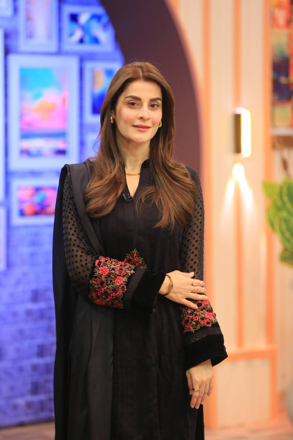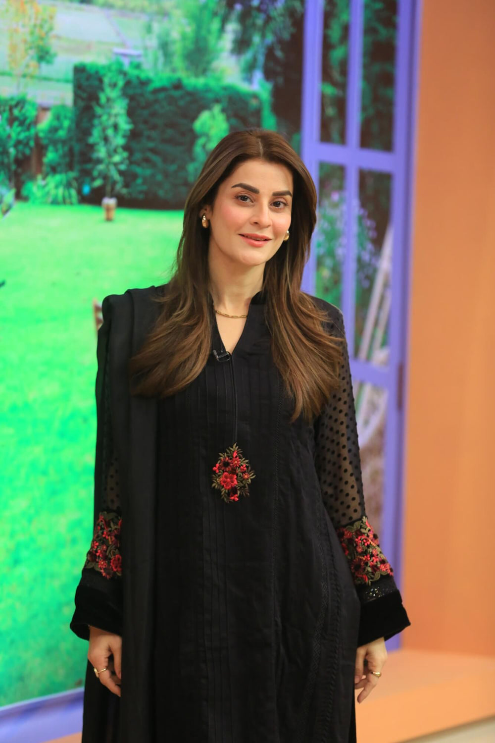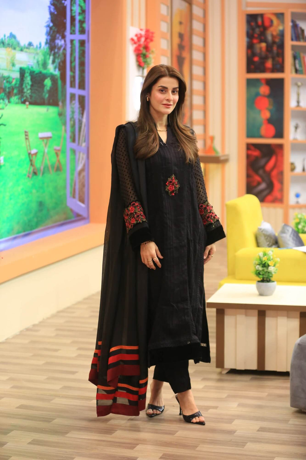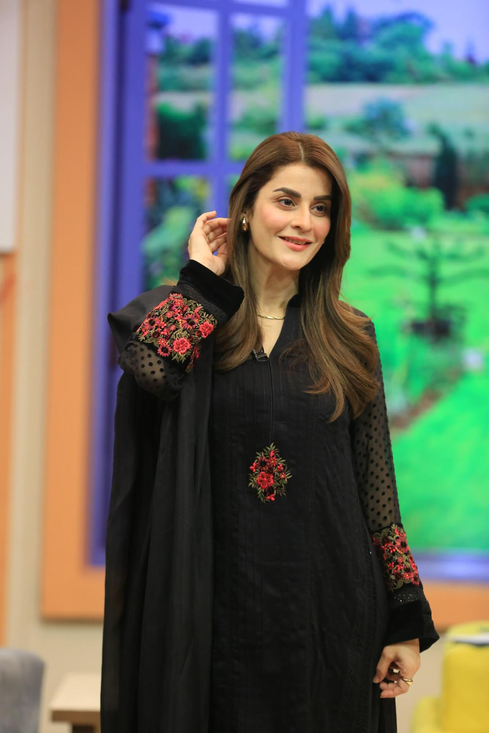 The Floral Amber is a sleek black ensemble featuring sheer dotted sleeves and intricate red floral embroidery on the cuffs and neckline. Paired with tailored black trousers and a matching dupatta, accented by bold red stripes at the border, this outfit exudes timeless elegance and sophistication. Perfect for formal evenings or festive gatherings.