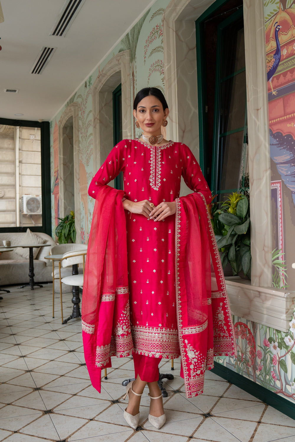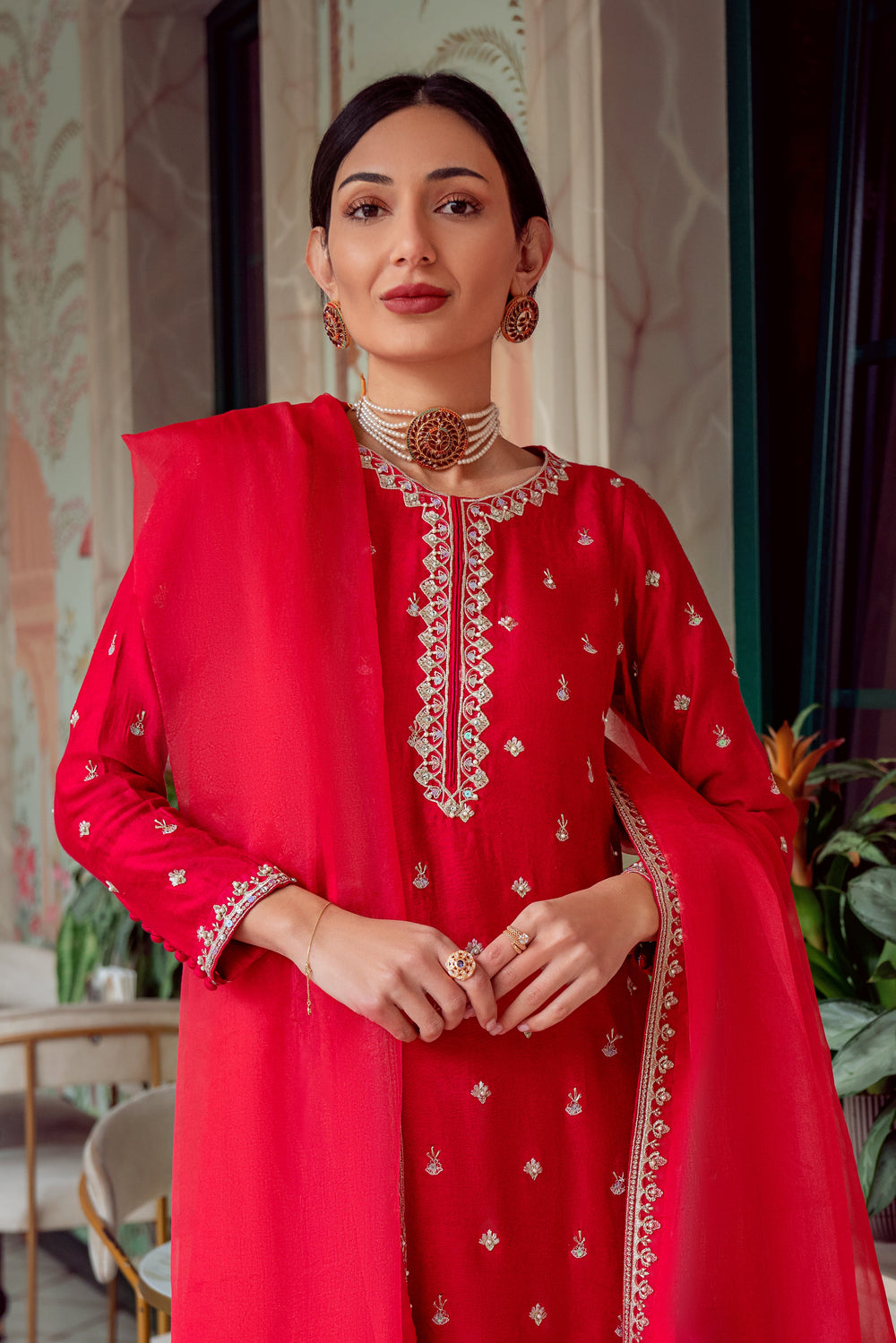 Fabric:Tassel silk shirt and trousers, chiffon dupatta Style:3-piece co-ord– straight shirt, trousers, and dupatta Details:● Crafted on premium tassel silk with a soft sheen and graceful drape● Aari and thread embroidery in deep sapphire, lilac, and mint forming ornate floral & paisley motifs on...