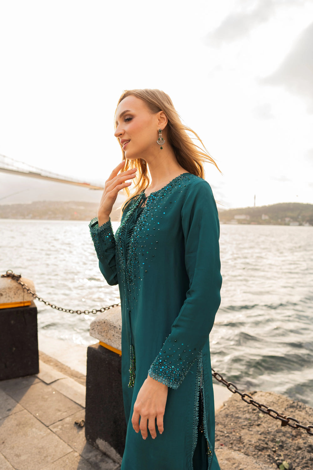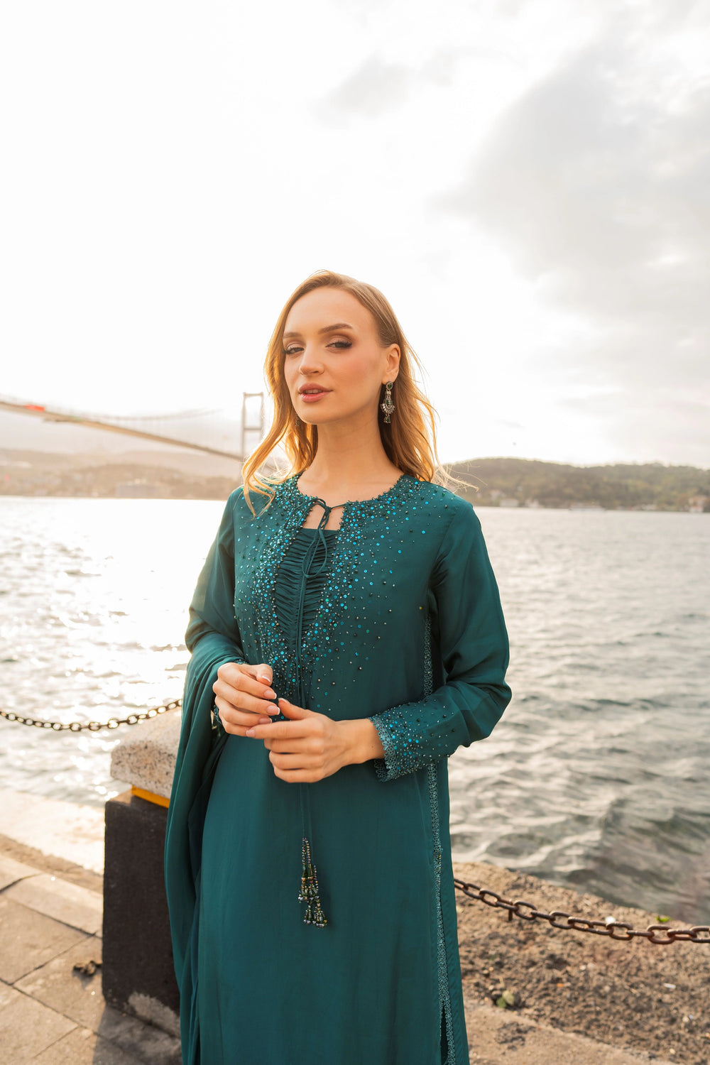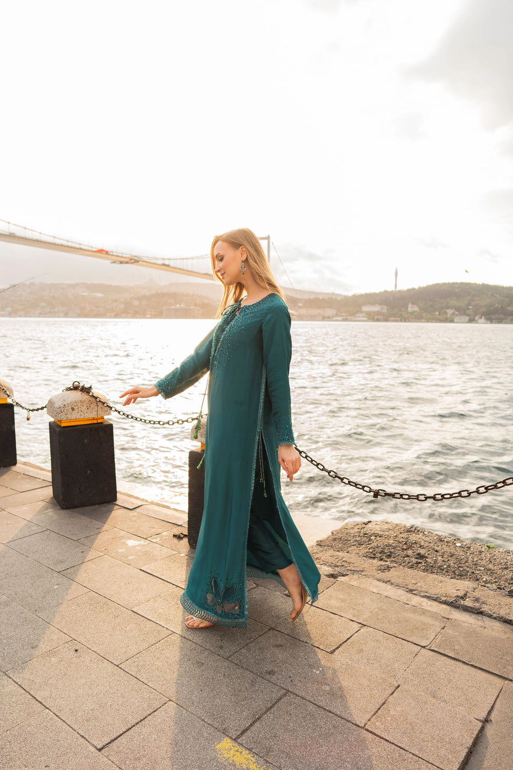 1) Pure silk shirt with hand Embroidered all over work on front, back & Sleeves (dapka,nakshi ,3D,Rasham, Swarovski, pearls, sequins, etc) with daman embroidered border detailing and finished edges.
