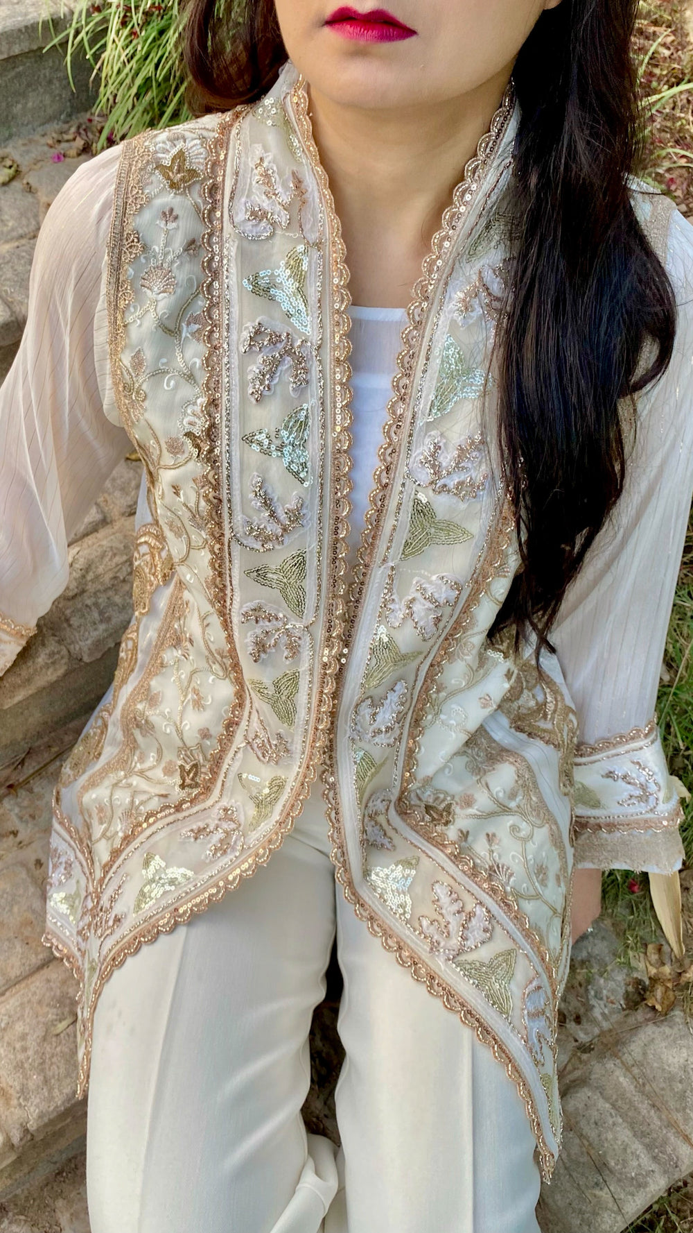 Breezy ivory white jacket with an open front neck band. Embroidered chiffon panels are embellished in lifting colours of copper, silver and gold sequins and thread; adding a sophisticated flair to an otherwise all white look. Can be worn both casually and formally. Wear with a plain white tank and white jeans for the daytime or with a silk top and silk trousers for a night out! * Top and trousers are sold separately.