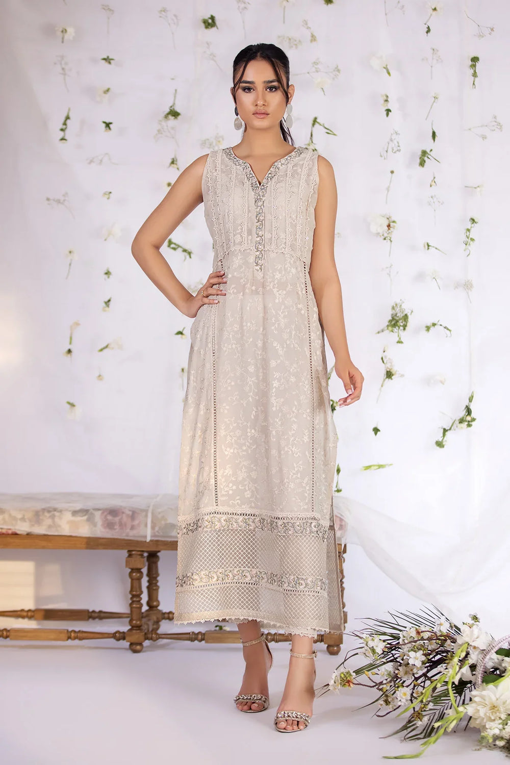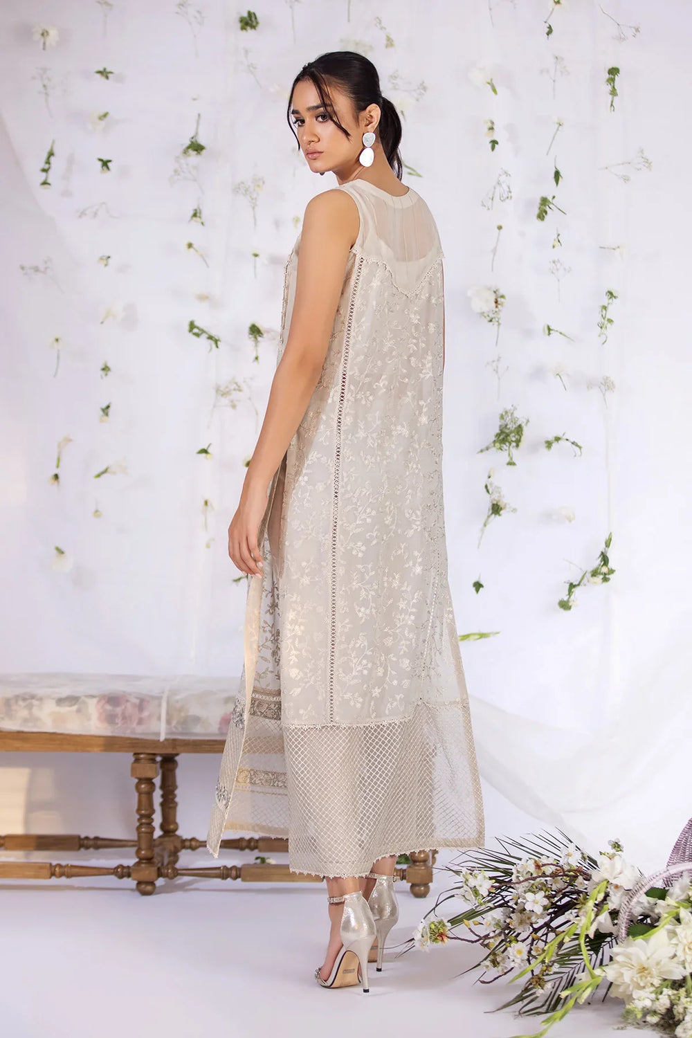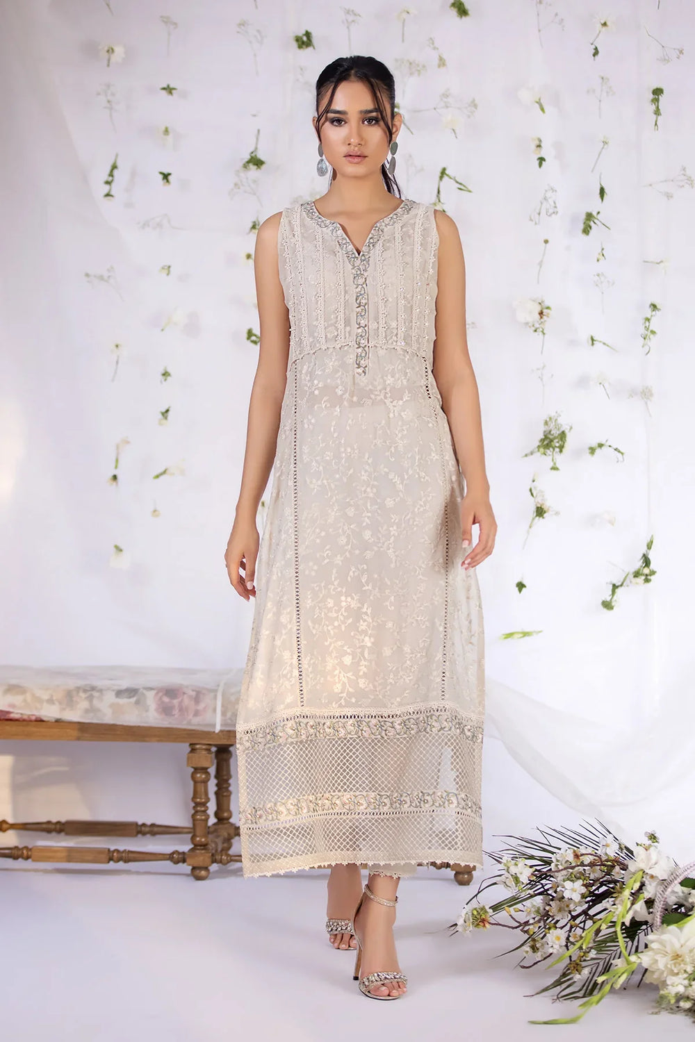 This long ivory Georgette shirt is made from the finest Georgette fabric, the shirt is fully embroidered with delicate silk threads, further complemented by multiple laces and embroidered organza borders that add a touch of glamour and texture to the design. Paired with silk cigarette pants.