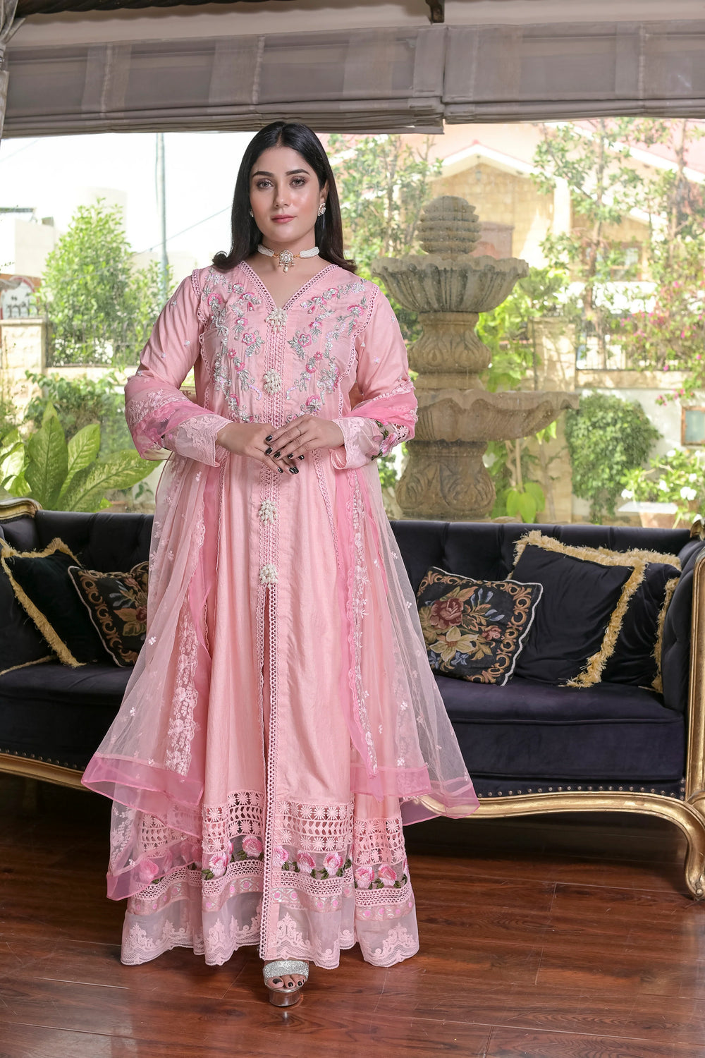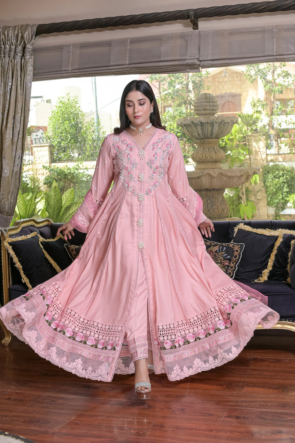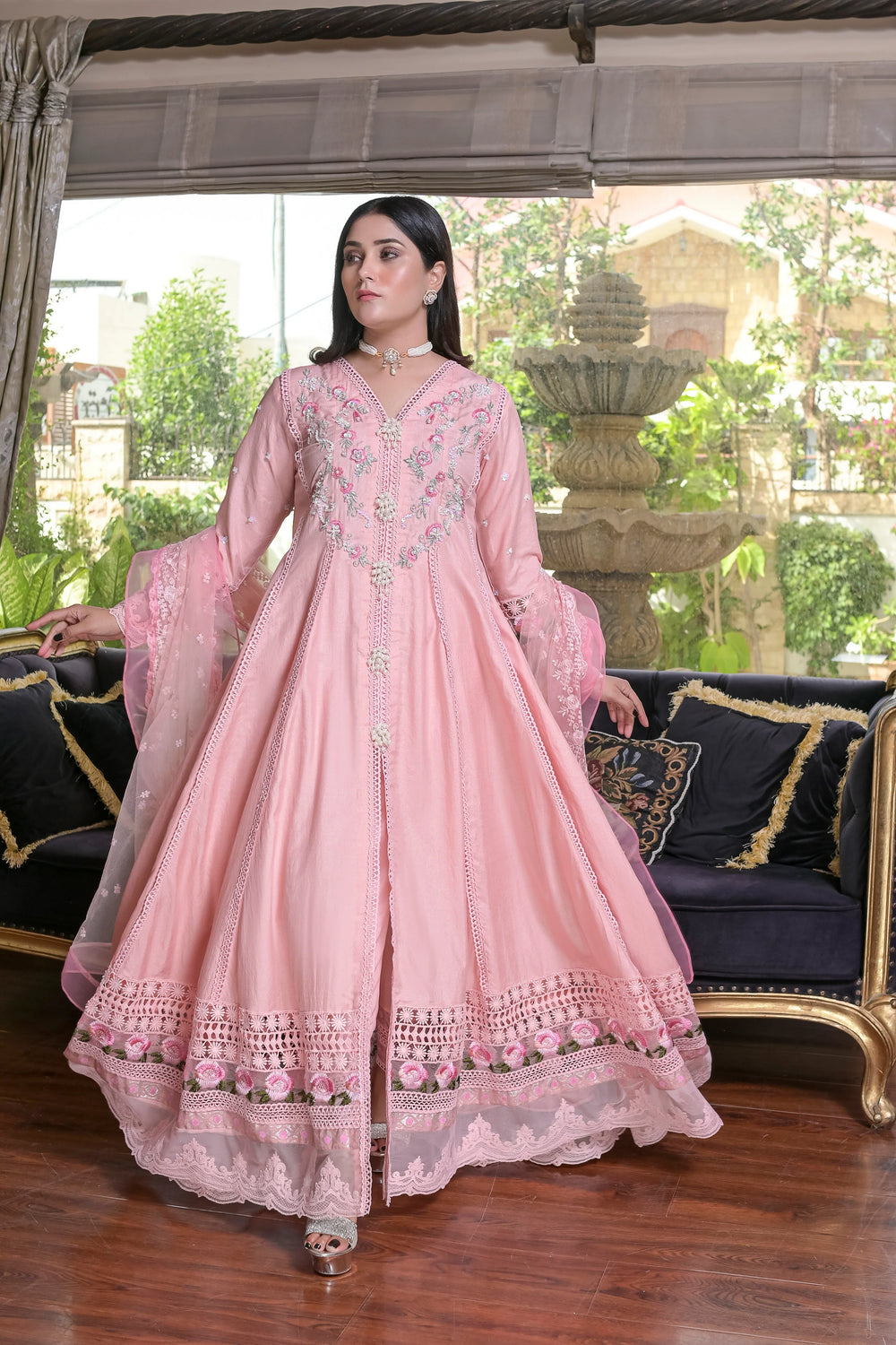 Raw silk panel flared frock with hand Embroidered yoke & sleeves (Rasham,nakshi,pearls,etc) with embroidered gheera all over with lace and embellished borders detailing gheera edges. Silk pants with embellished bottom. Soft net fully embroidered dupatta with embellishment edges. Complete 3pcs Stitched (Same as Shown in pictures).