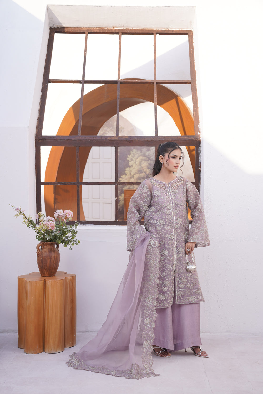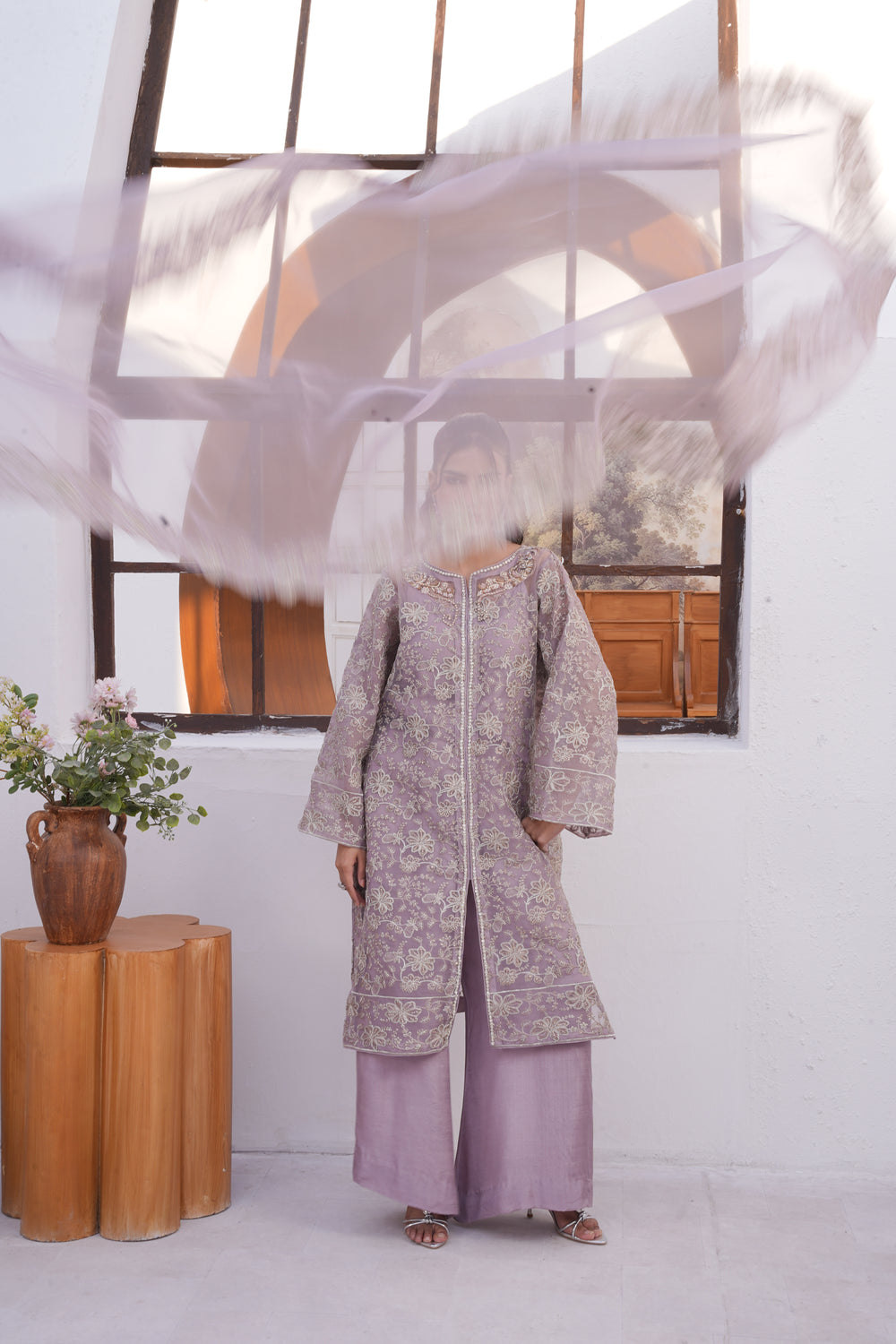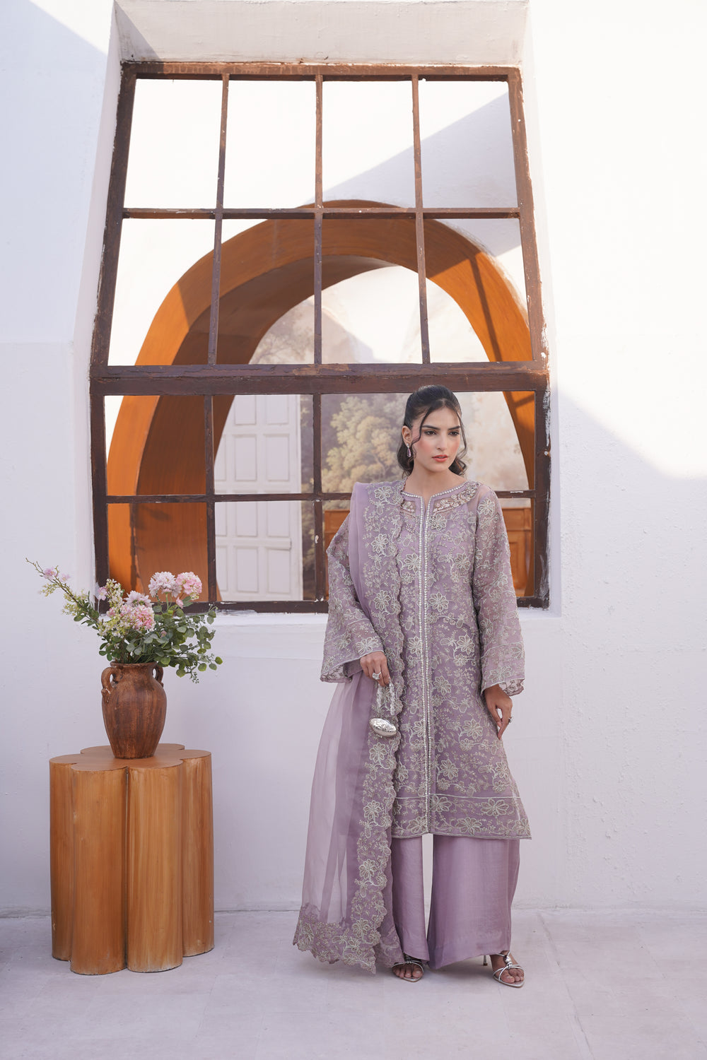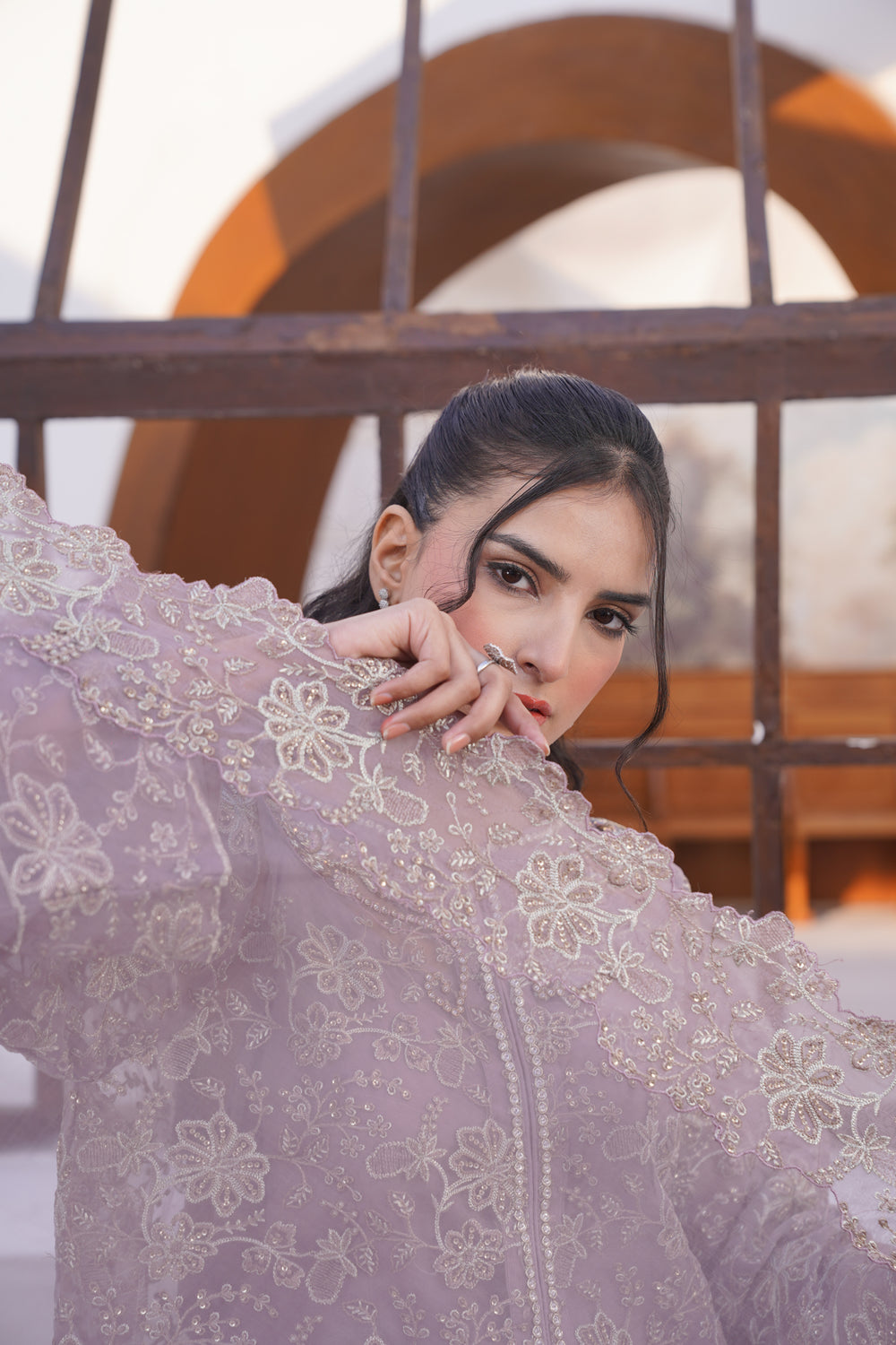 This dreamy lilac ensemble is crafted from delicate organza, beautifully adorned with intricate embroidery and shimmering sequins for a graceful, festive look. The neckline is meticulously handworked, adding a refined and luxurious touch to the design.