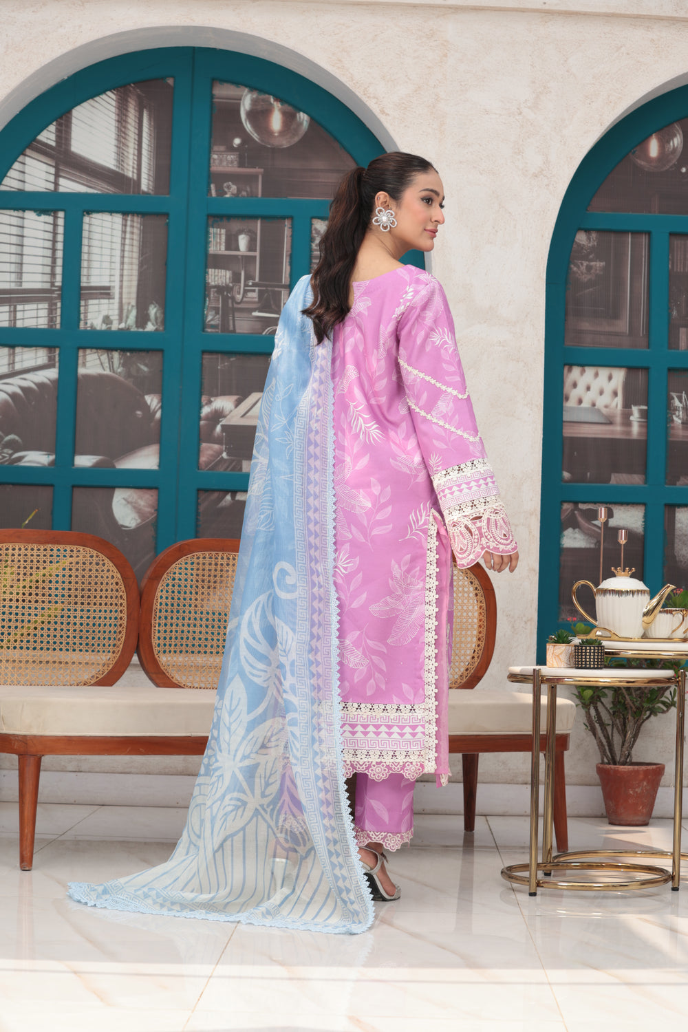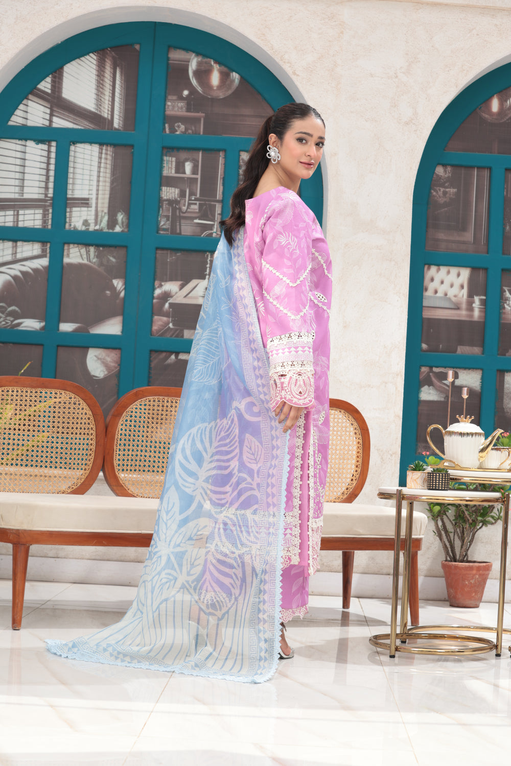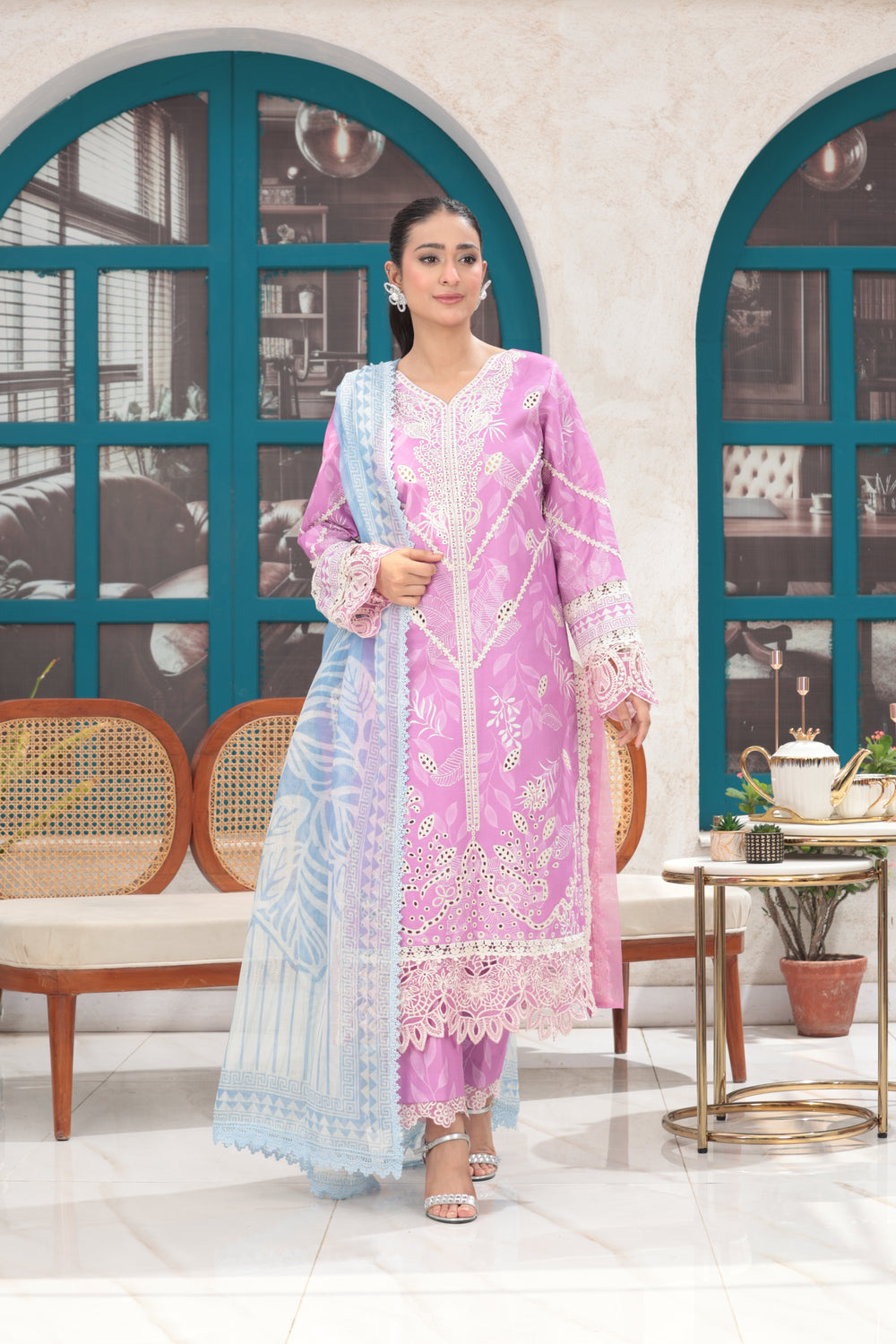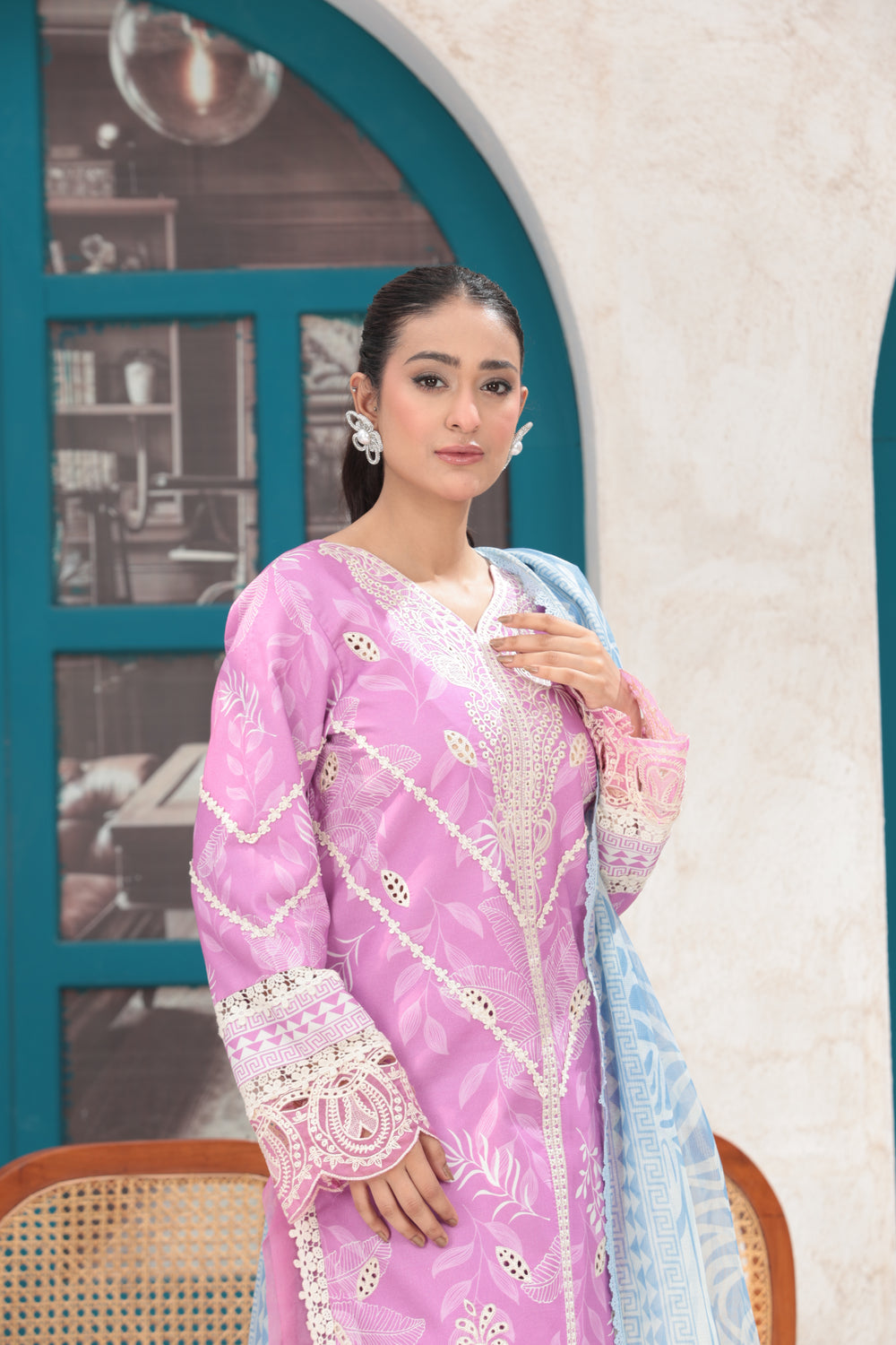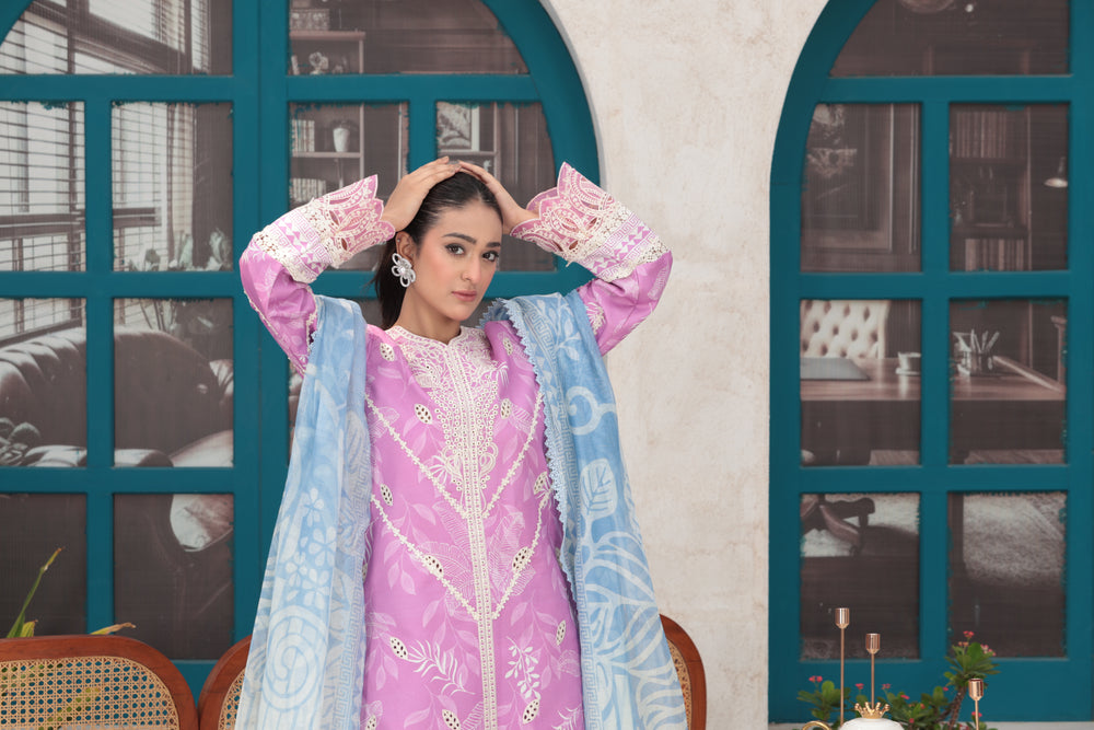 Experience the charm of Lilac Haze – A 3-piece embroidered lawn outfit paired with cotton-net dupatta and cotton