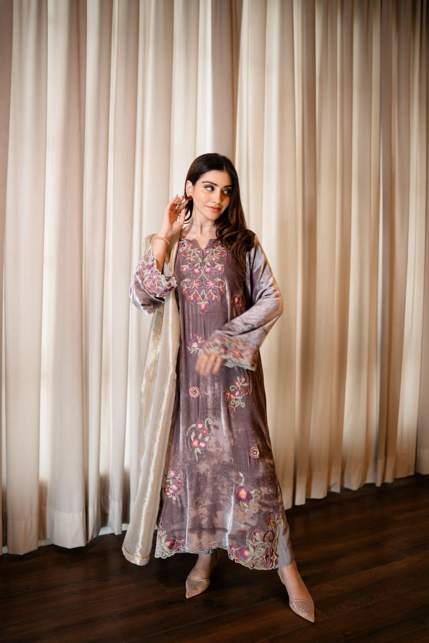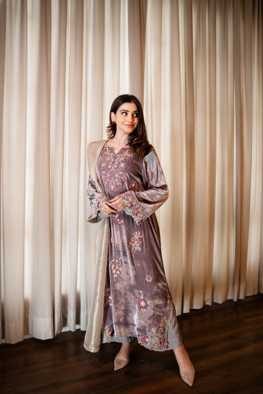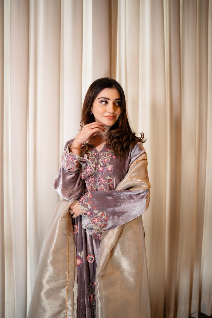 The outfit is paired with silk culottes that complement the kaftan’s fall, while a tissue dupatta in a soft white-gold tone completes the look with a subtle shimmer. Thoughtfully detailed and meticulously crafted, LILOU embodies timeless elegance with a modern sensibility.