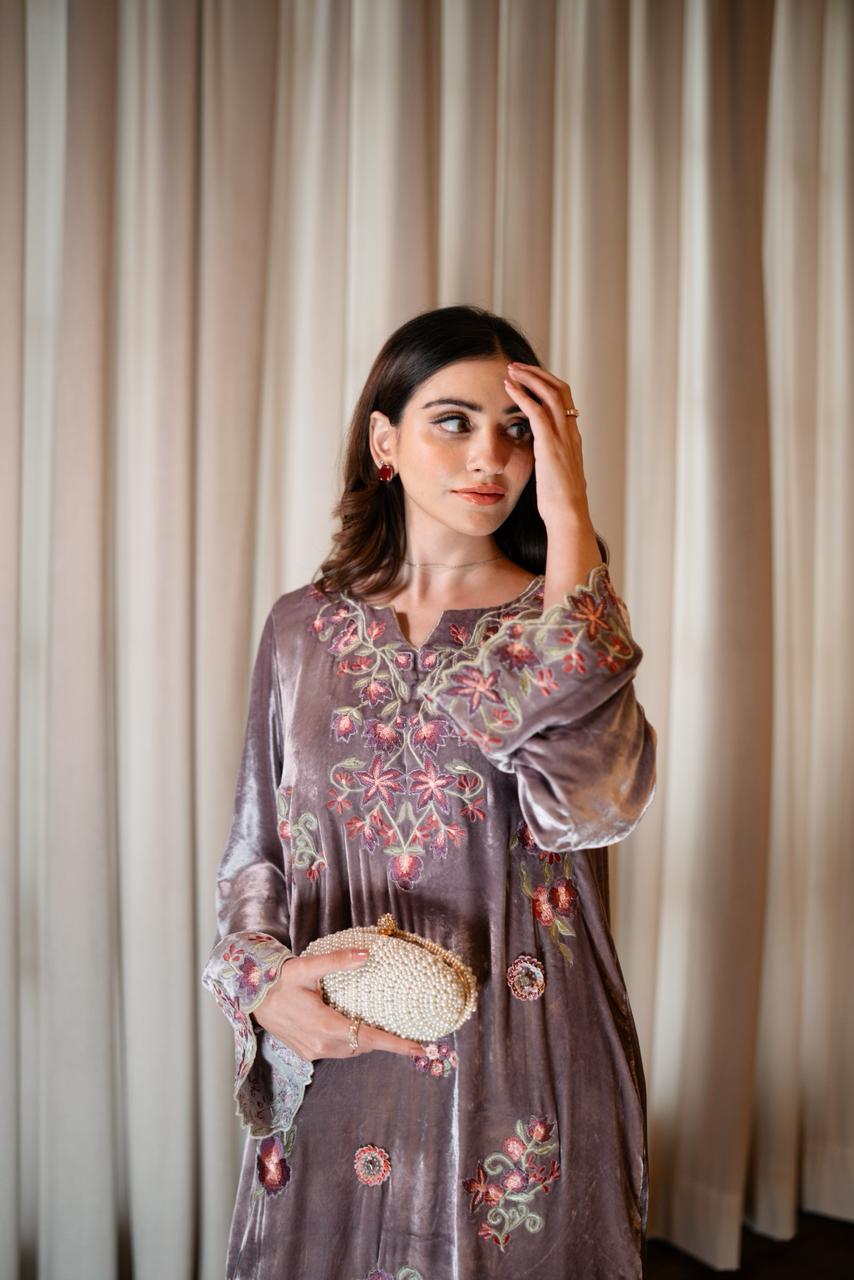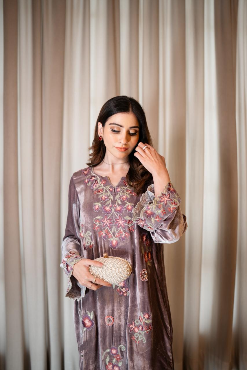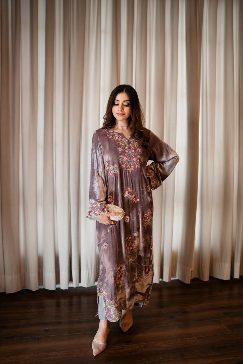 The outfit is paired with silk culottes that complement the kaftan’s fall, while a tissue dupatta in a soft white-gold tone completes the look with a subtle shimmer. Thoughtfully detailed and meticulously crafted, LILOU embodies timeless elegance with a modern sensibility.