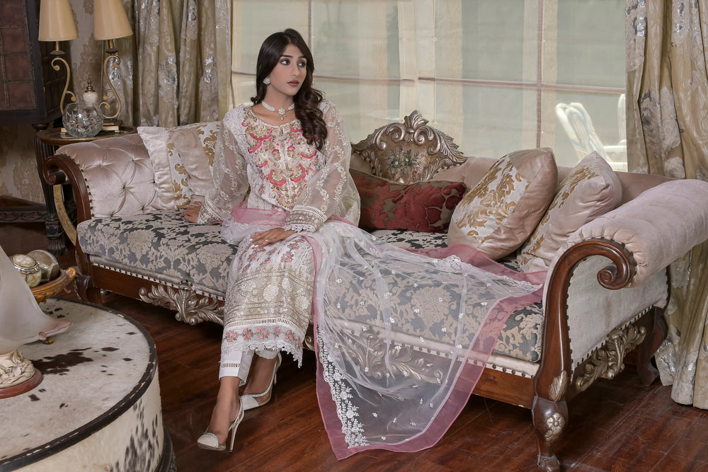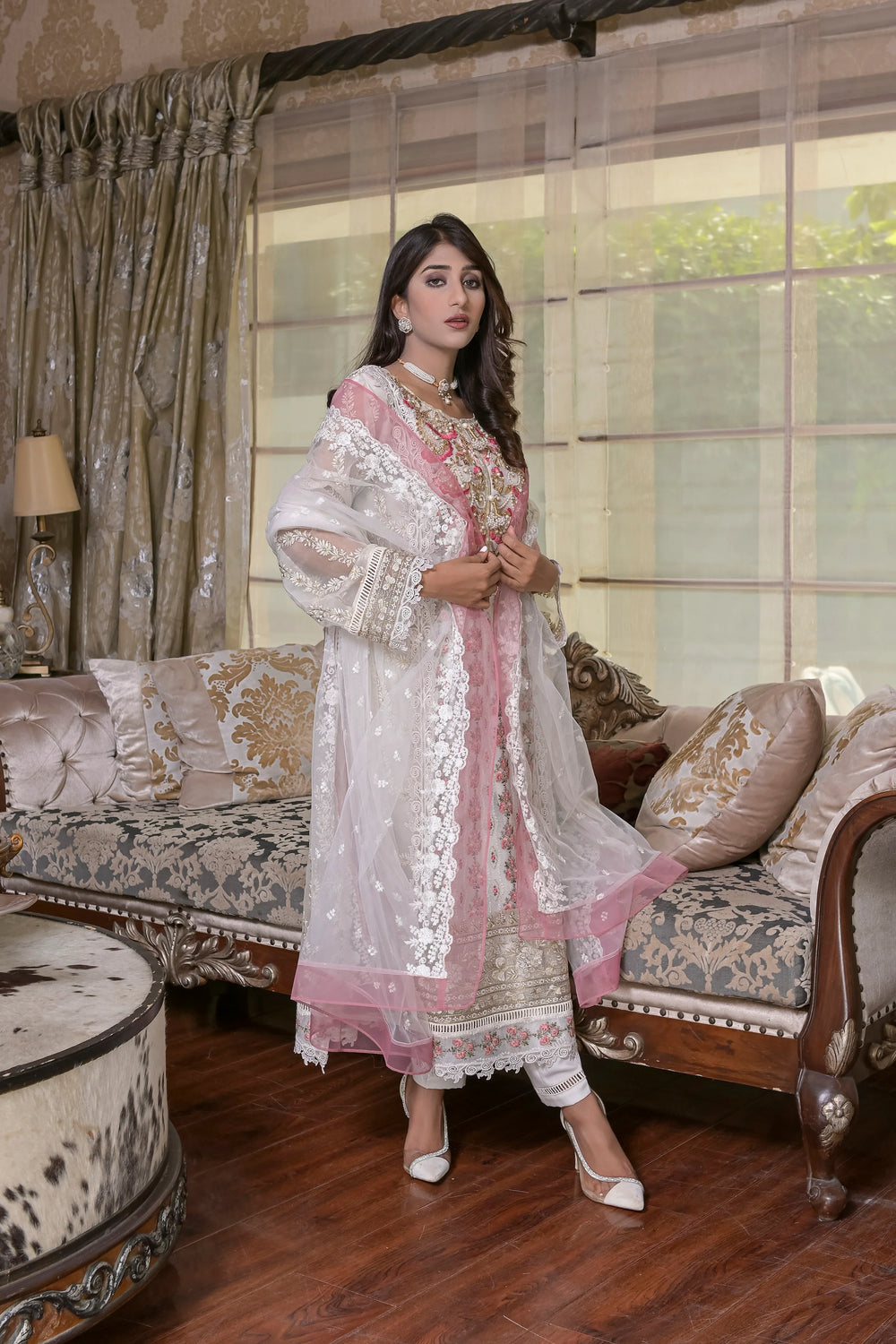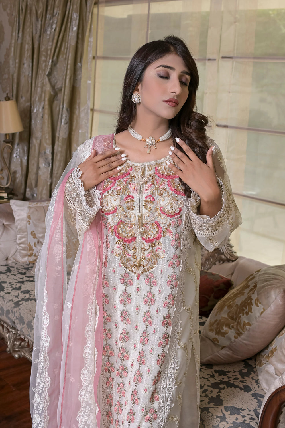 Fully embroidered khaddi panel shirt with hand Embroidered neckline (Rasham,nakshi,pearls,etc) with embroidered sleeves & daman all over with lace and embroidered borders detailing gheera edges. 2)Silk pants with bottom embellishment. 3) Soft net fully embroidered dupatta with embellishment edges. Complete 3pcs Stitched (Same as Shown in pictures).