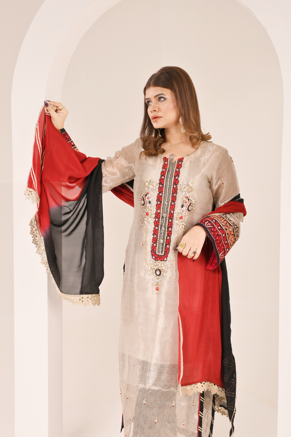 Crafted from pure lama tissue fabric, this stunning outfit features a timeless design. The shirt is paired with a luxurious silk dupatta and classic black trousers, creating a perfect balance of elegance and tradition. This ensemble exudes sophistication, making it ideal for festive and formal occasions. The neckline and sleeves are adorned with intricate hand embroidery, showcasing meticulous handwork with dabka, stones, sequins, and beads. Each detail reflects exceptional craftsmanship, adding a touch of brilliance to the overall look.