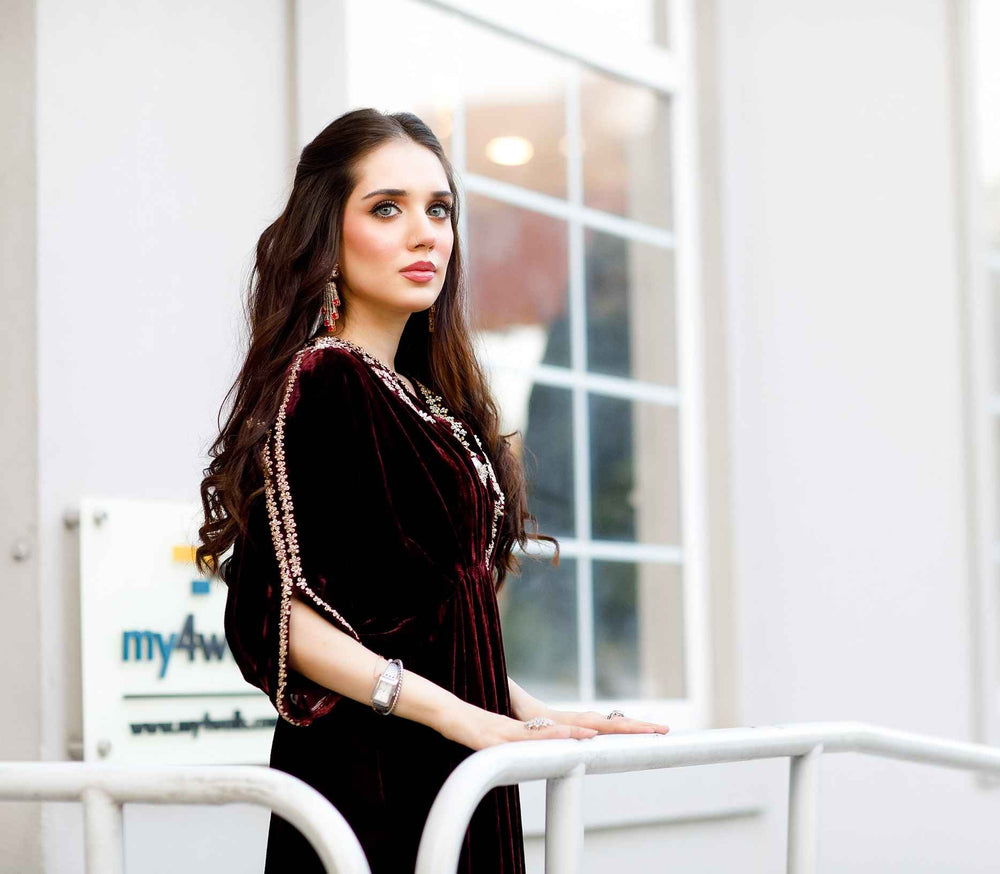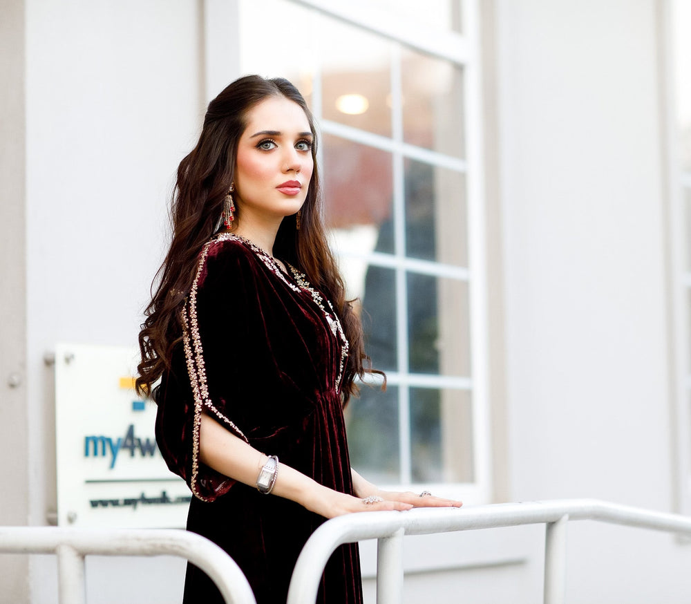 The hottest color of the season ! A winter must have .A flattering Magenta pink velvet kaftan with hand worked neckline and sleeves embellished with resham , kora and dabka , A beautiful motif on the shoulder and hem to give you a classy look.