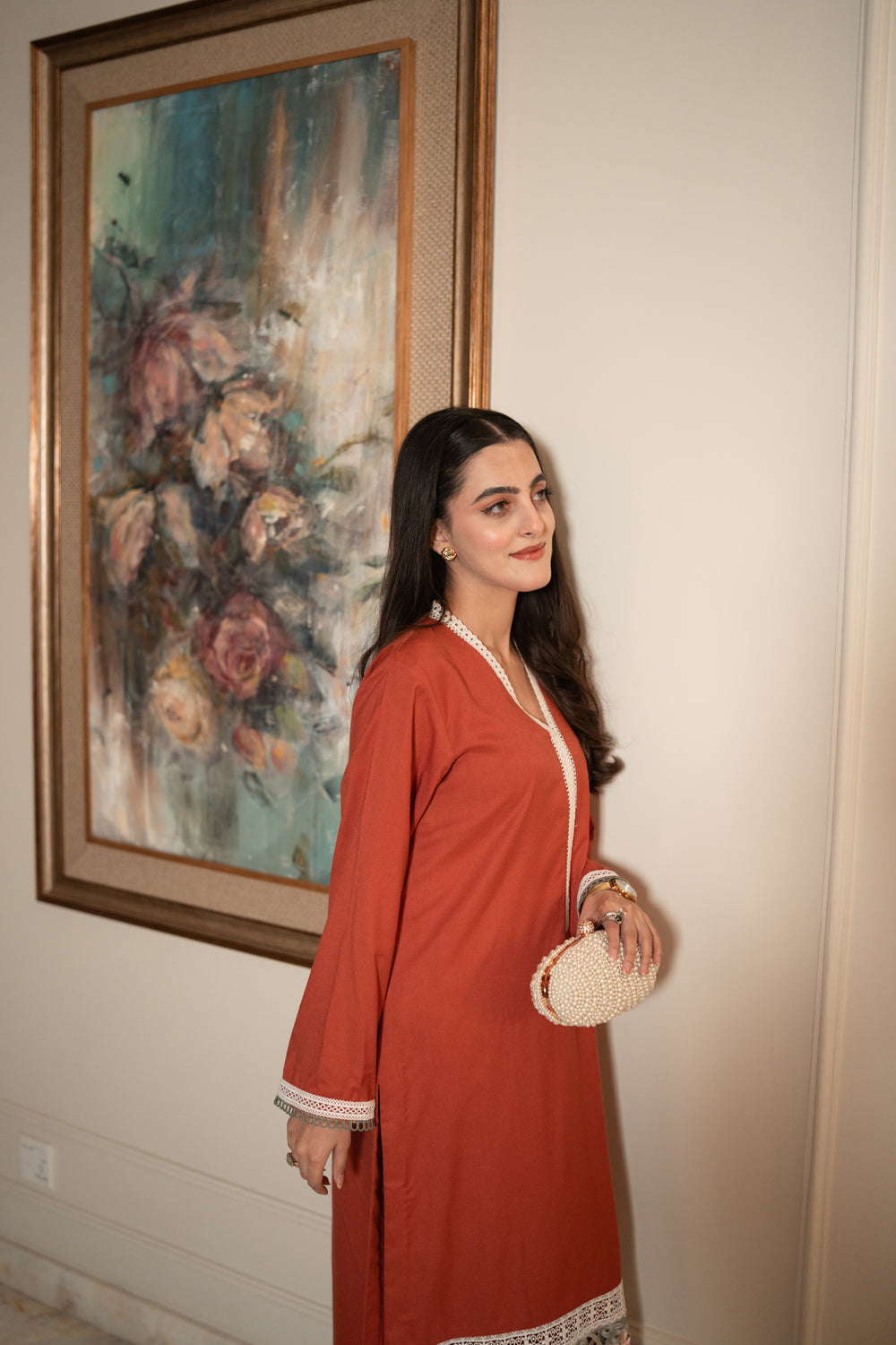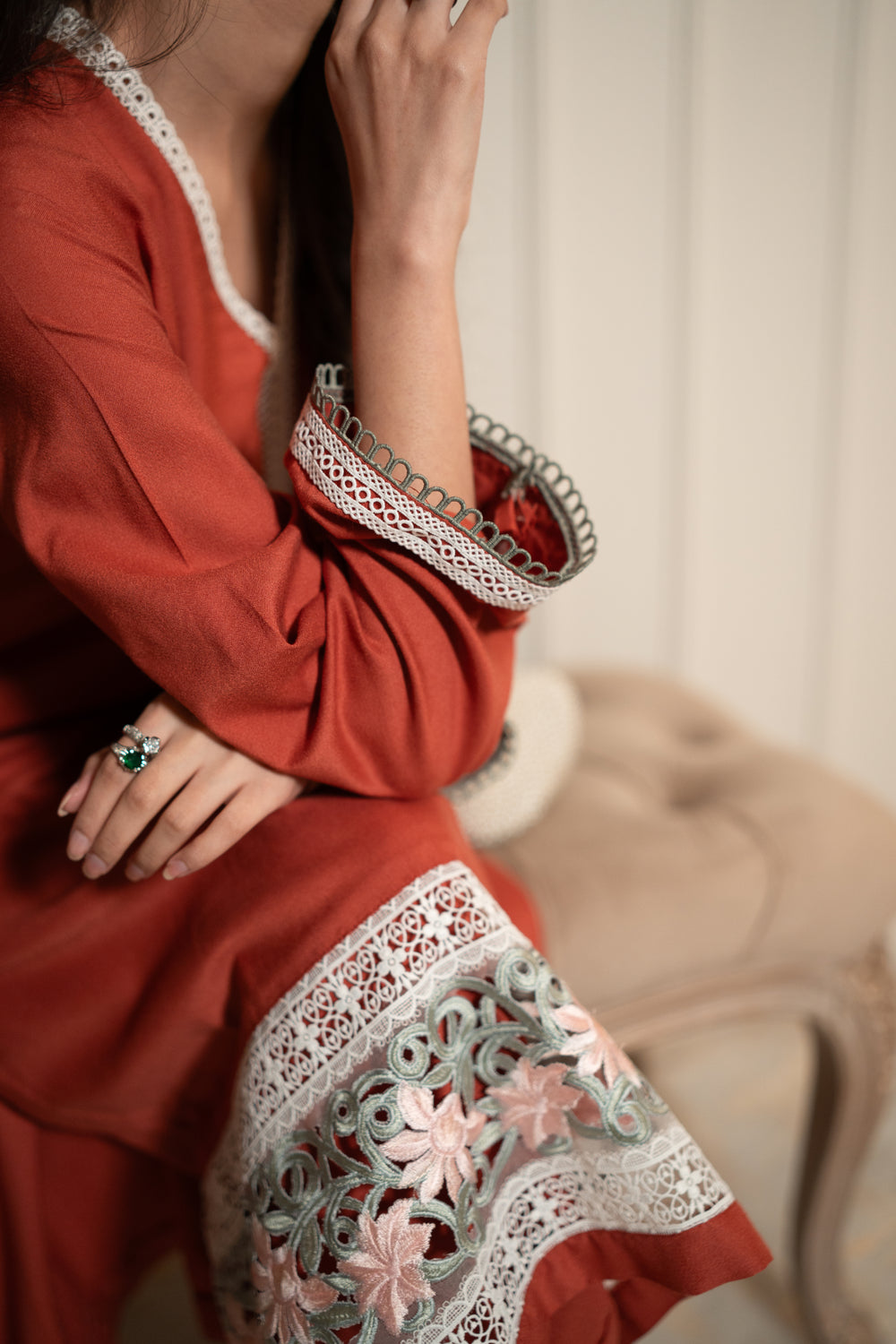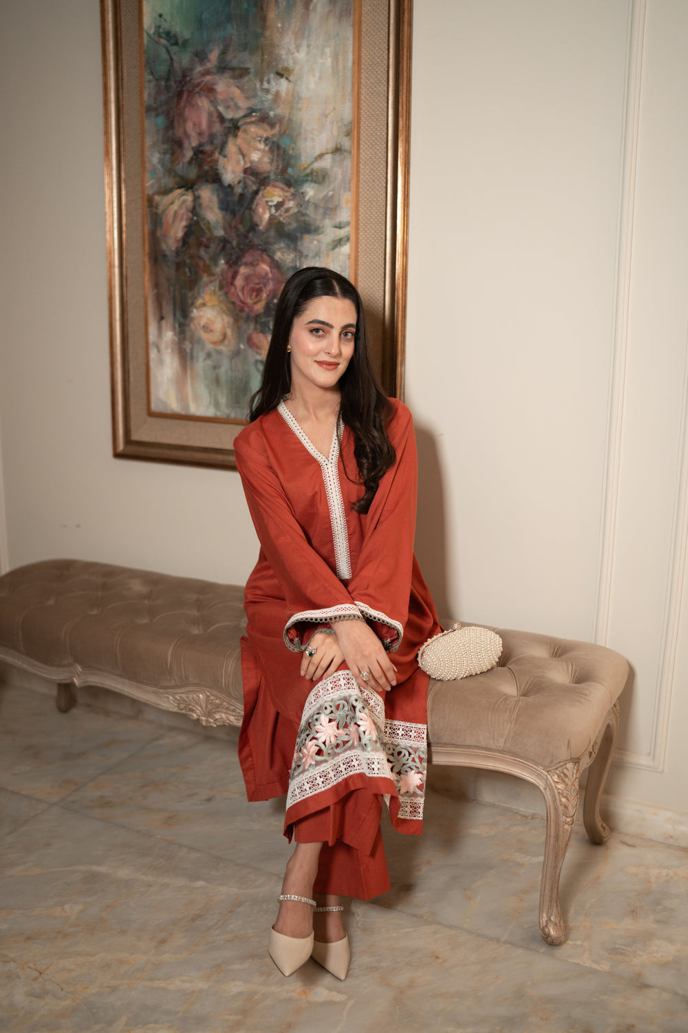 Introducing MANNA, an exquisite pink marina two-piece where soft hues meet intricate detailing. The long shirt features a unique neckline adorned with delicate white lace, while the daman is decorated with embroidered organza in light pink and mint, stitched together with elegant white joining laces. The sleeves are finished with matching white and mint lace, creating a harmonious contrast that makes MANNA truly stand out. Perfect for festive occasions, this ensemble celebrates subtle elegance with a modern twist.