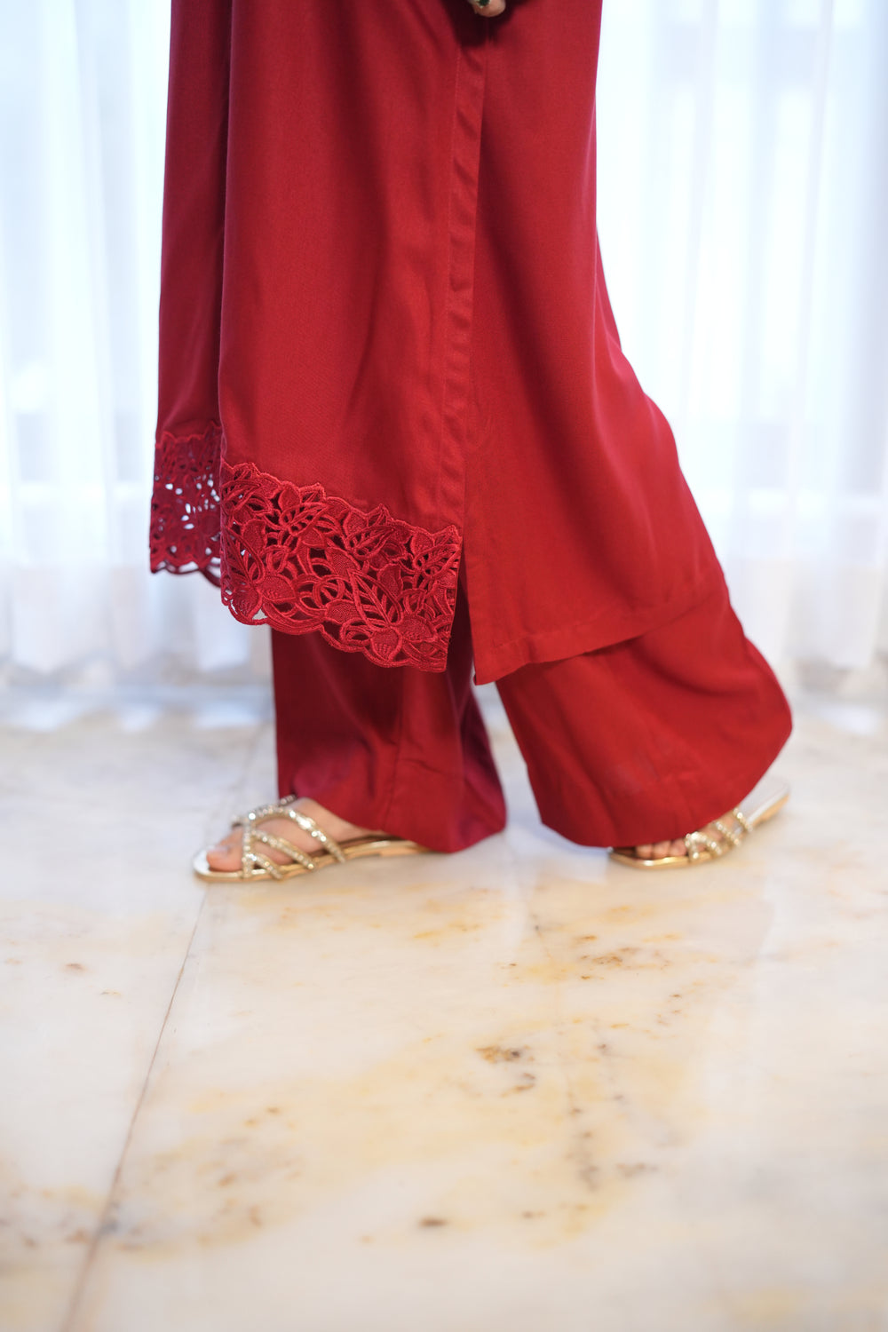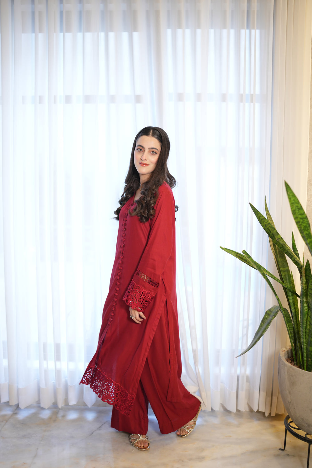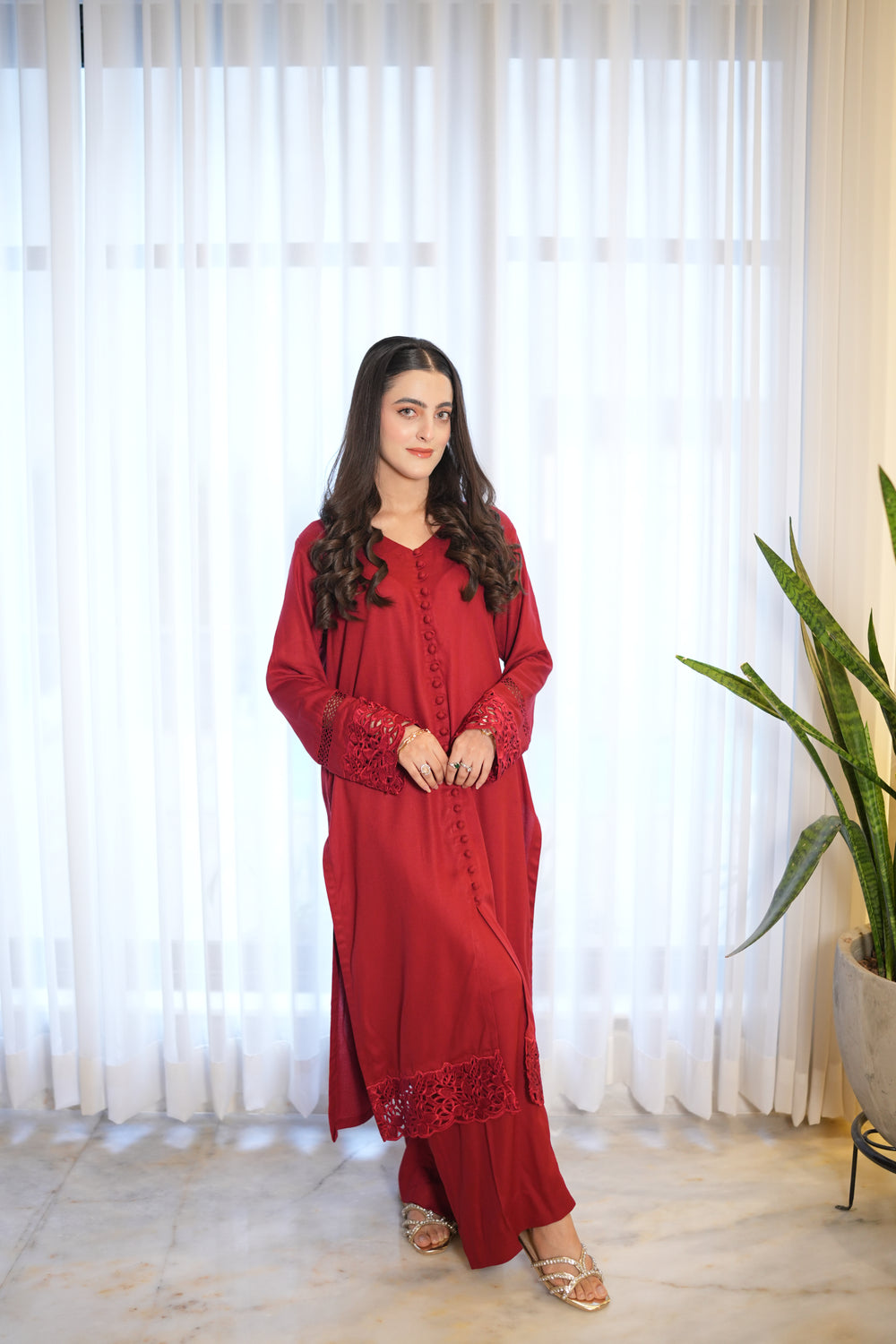 Introducing MANO, a beautiful red french marina two-piece that combines style and comfort. The long shirt features fabric buttons running down from the neckline and a slit starting just below the knees for a graceful look. The daman and sleeves are decorated with same-color embroidered organza lace, adding subtle elegance. Paired with loose, flowy culotte-style trousers, MANO is perfect for festive occasions or special gatherings.