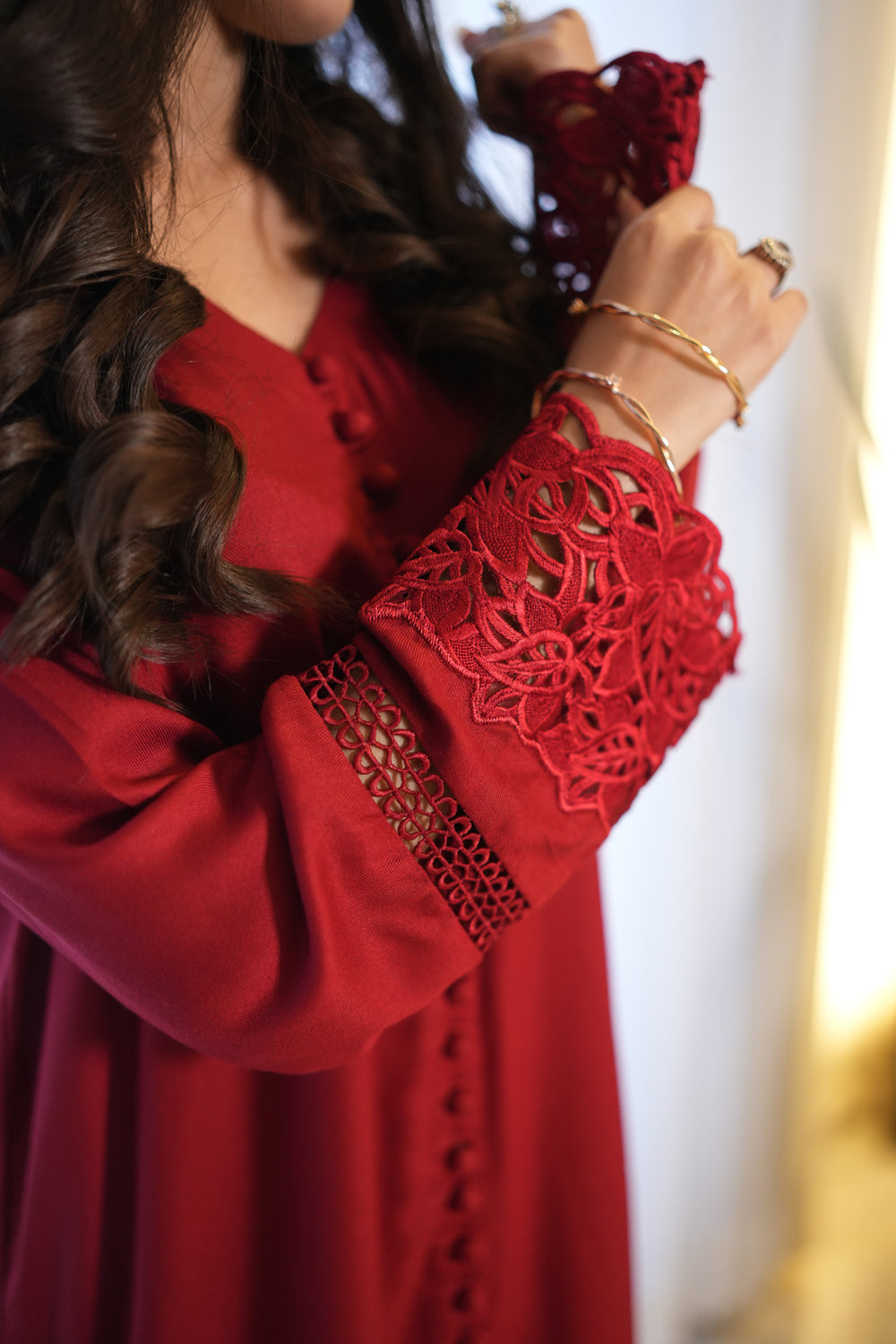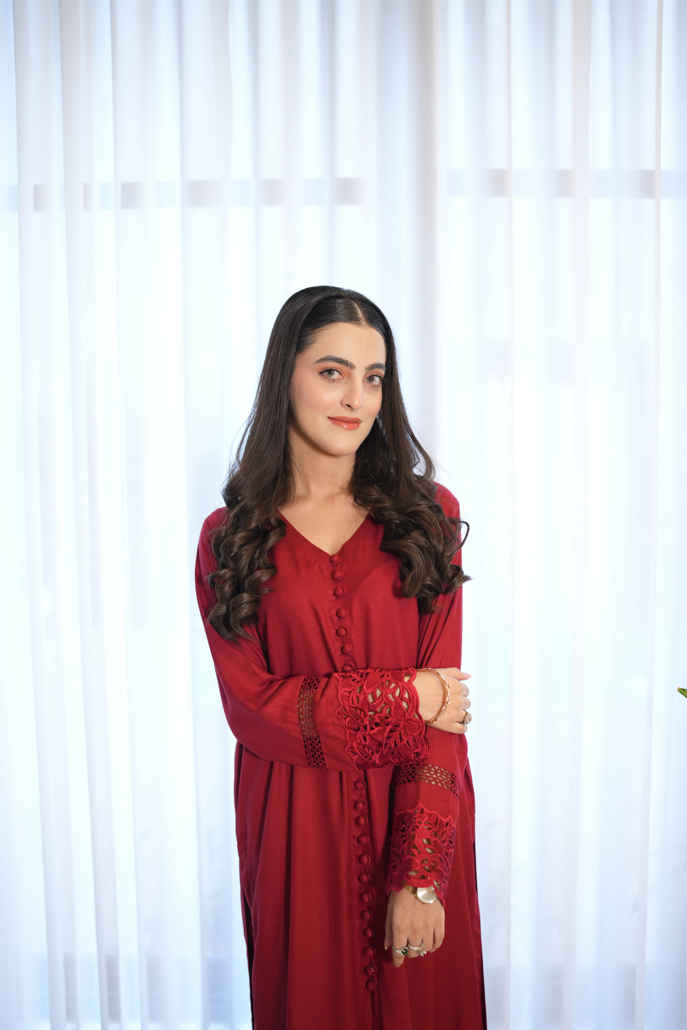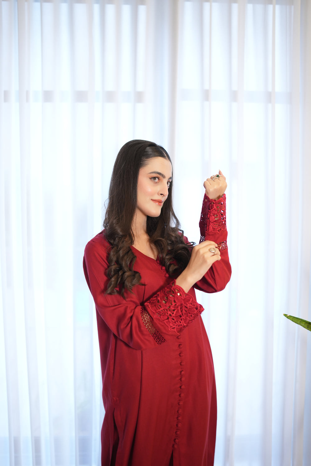 Introducing MANO, a beautiful red french marina two-piece that combines style and comfort. The long shirt features fabric buttons running down from the neckline and a slit starting just below the knees for a graceful look. The daman and sleeves are decorated with same-color embroidered organza lace, adding subtle elegance. Paired with loose, flowy culotte-style trousers, MANO is perfect for festive occasions or special gatherings.