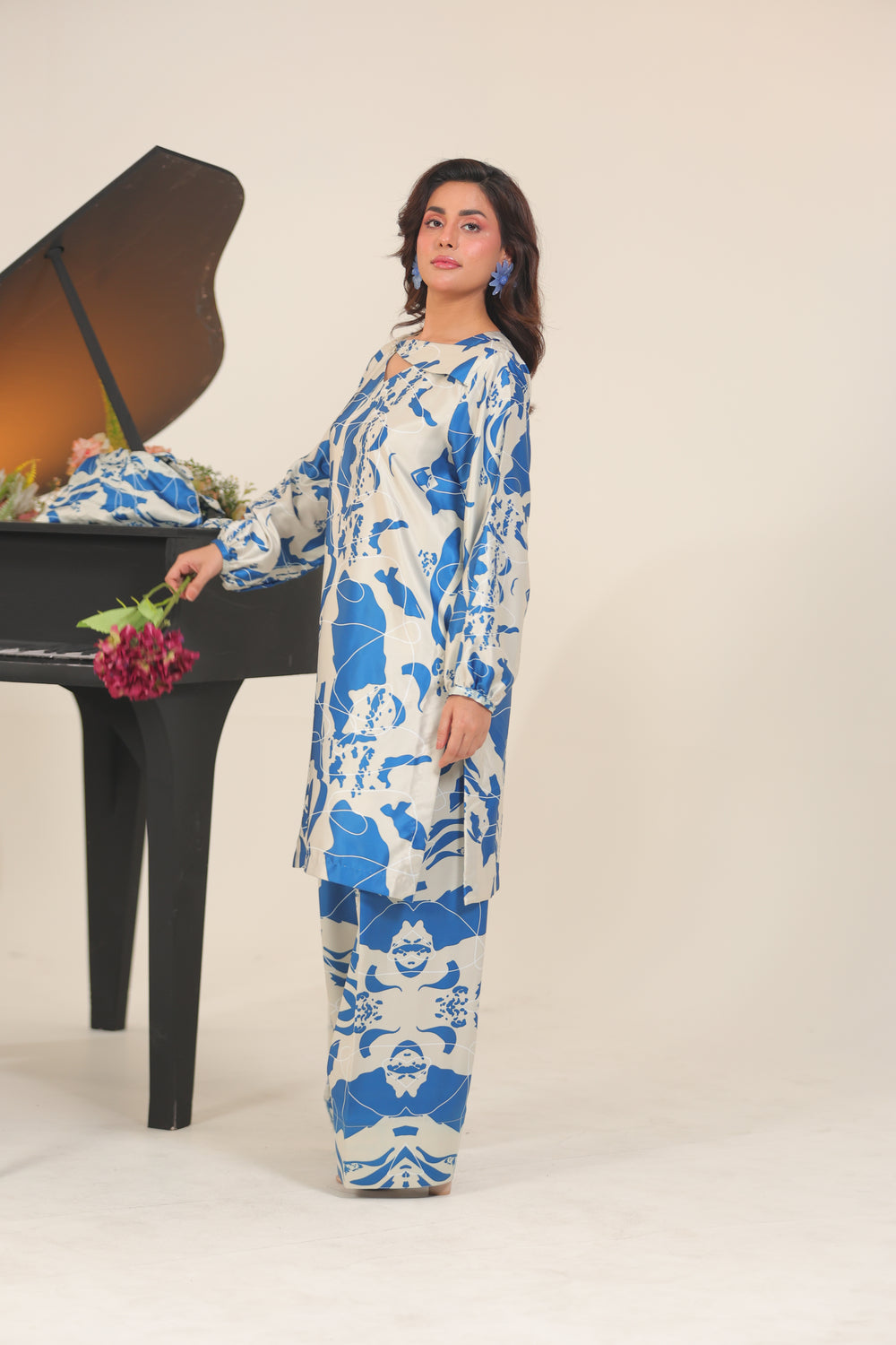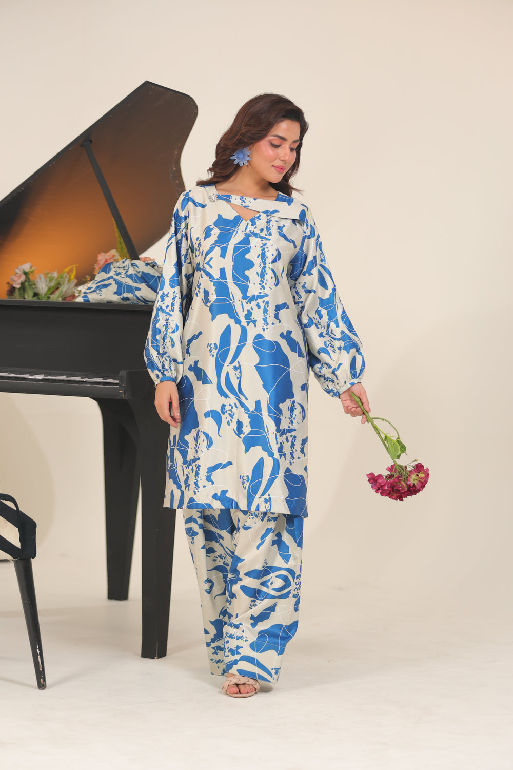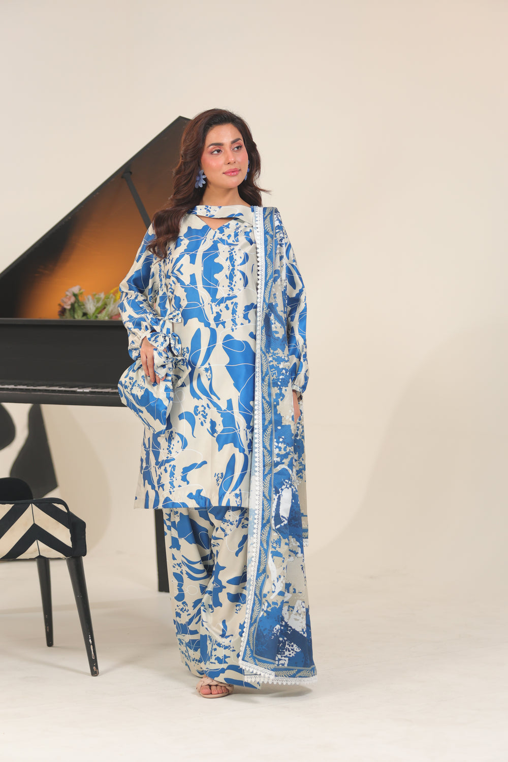 Unstitched Marina’s satin silk 3-piece set combines a refined printed shirt, flowing dobbie net shawl, and coordinating trousers.