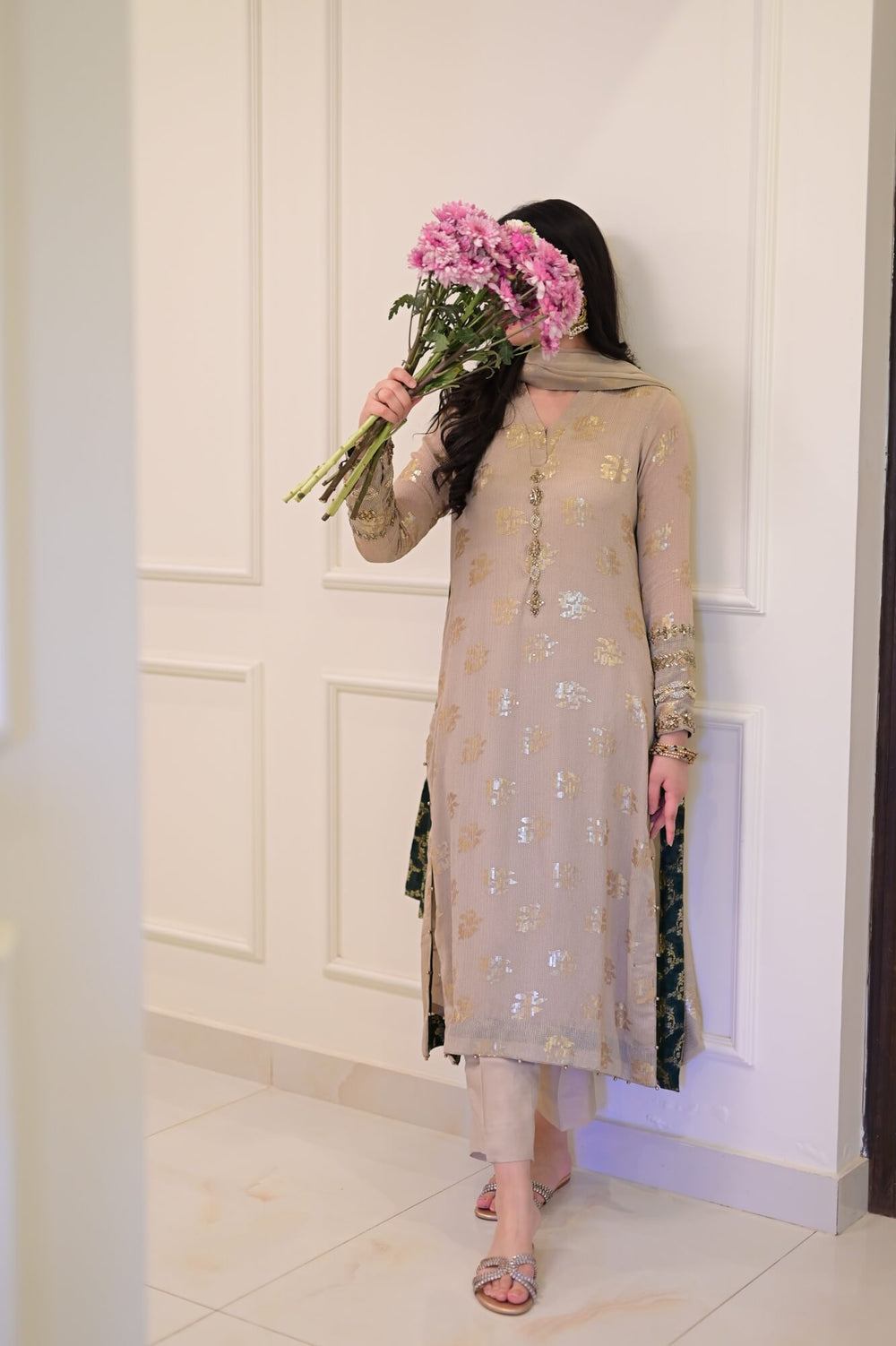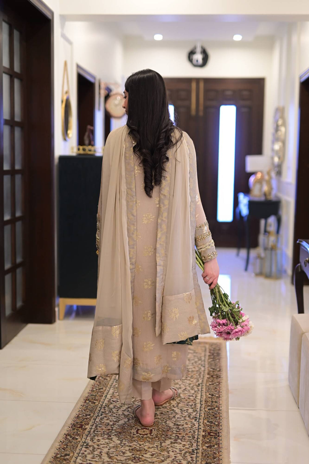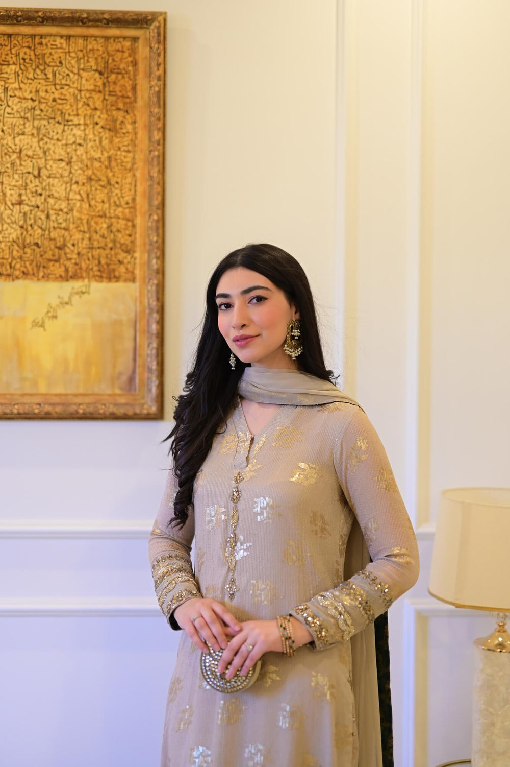 A vision of understated elegance crafted in a muted mouse grey canvas, adorned with delicate golden motifs that shimmer softly with every movement. The sleeves are beautifully embellished with hand-crafted champagne glass beads, adding a refined sparkle to the look. With precise detailing along the neckline, this ensemble exudes timeless sophistication. Draped with a sheer matching dupatta, Mehru is perfect for those who adore subtle glamour and refined tradition.