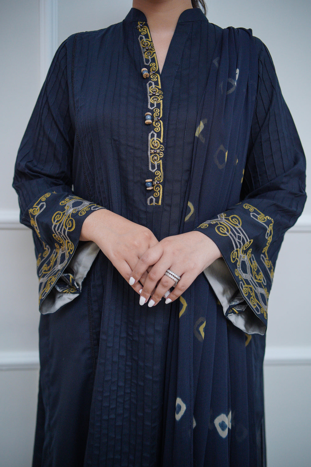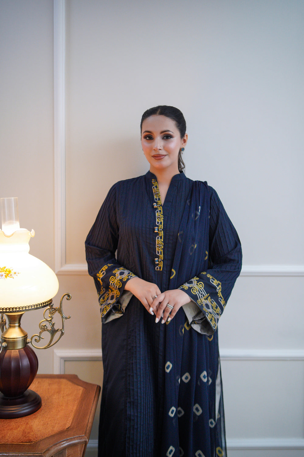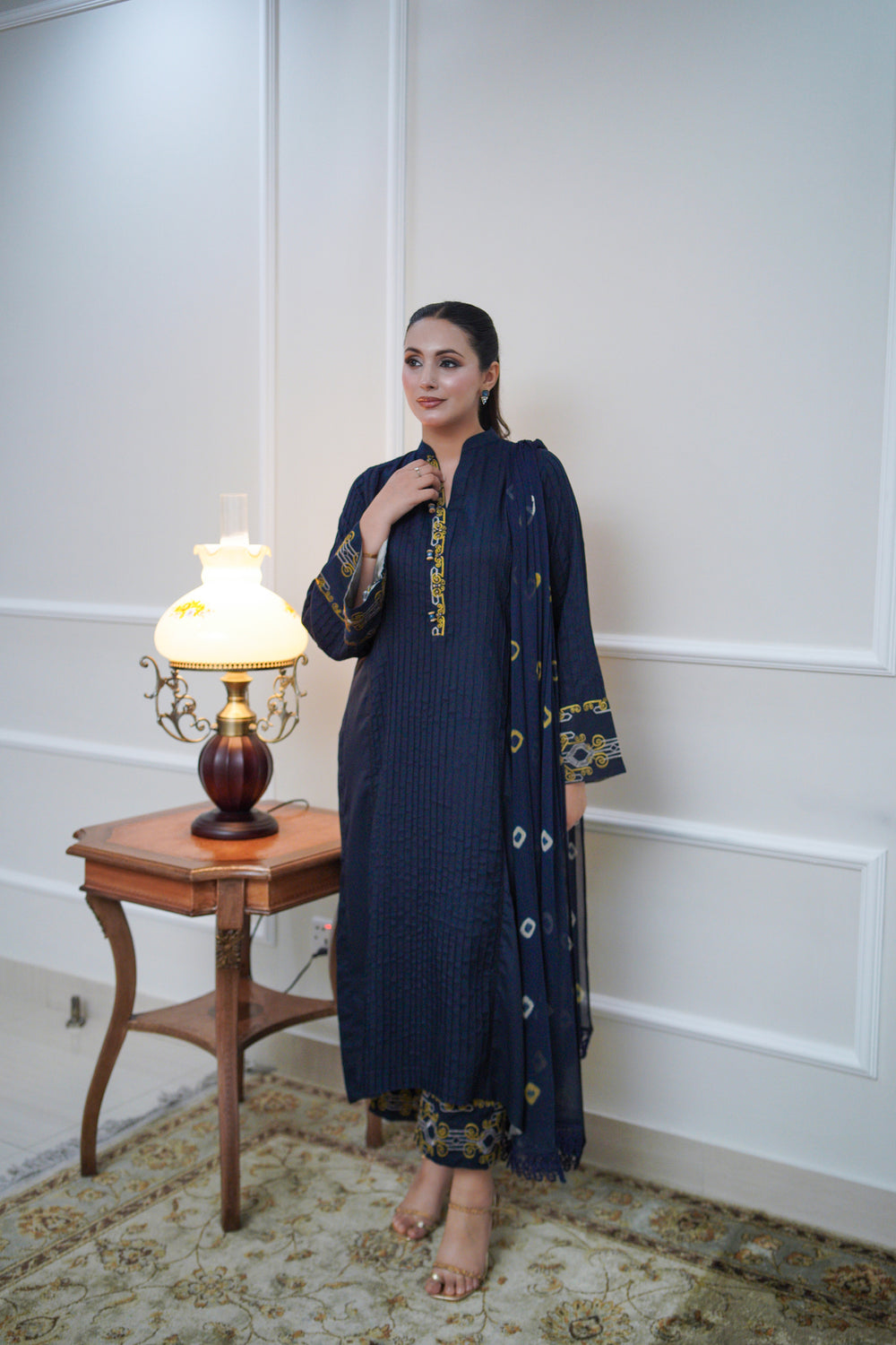 Moonlit Flow is a navy 3-piece suit made from premium cotton that’s soft, breathable, and ideal for daily wear. The kurta features subtle vertical self-texture, elevated by delicate olive and grey embroidery on the neckline and cuffs. Coordinated trousers mirror the same embroidered detailing at the hem, while a flowy dupatta with minimal accents completes the look. Elegant yet comfortable, it’s designed to add poise to your everyday wardrobe