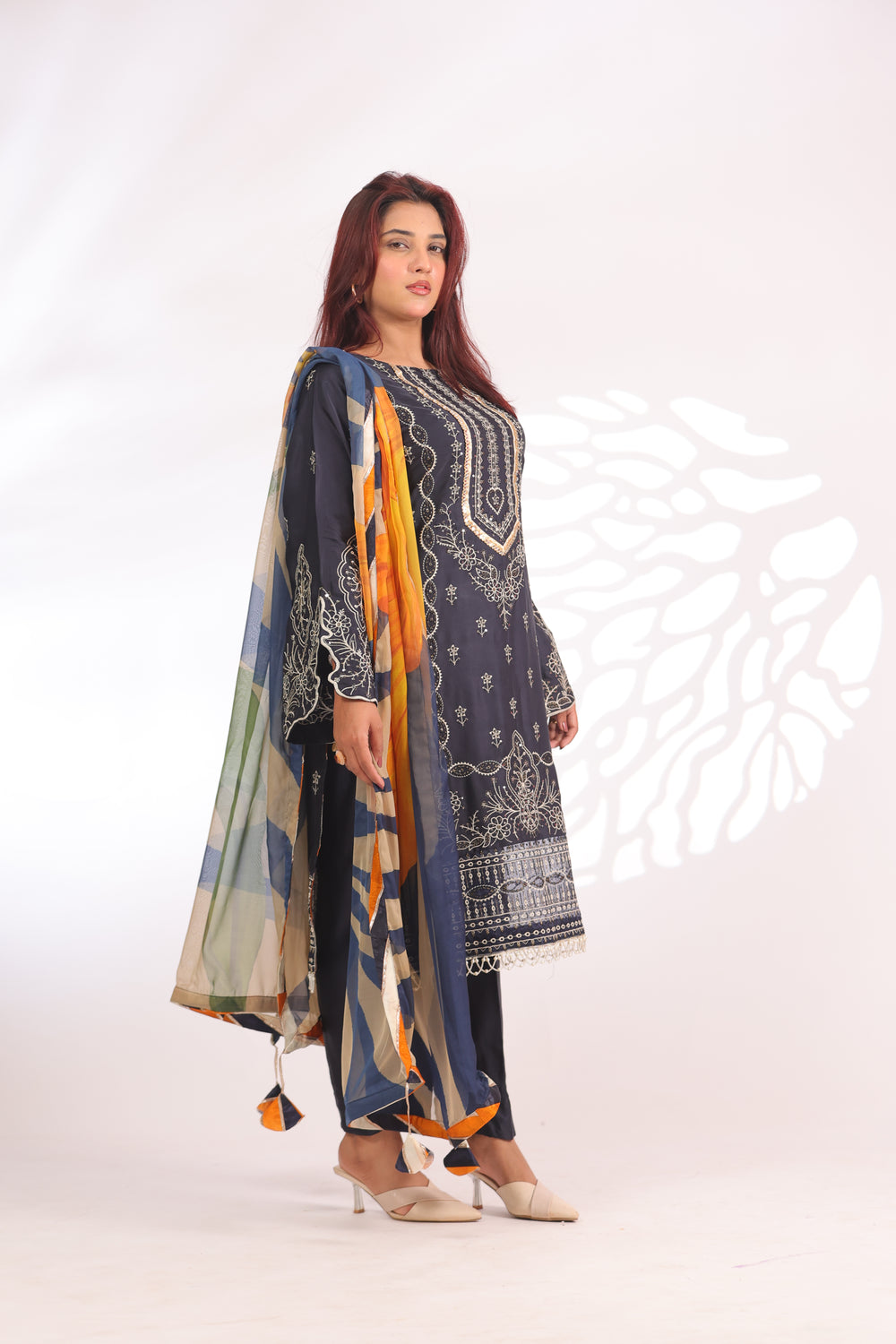 •Vibrant Color Palette – the bold mix of navy blue and orange yellow creates a striking contrast that radiates elegance and confidence.