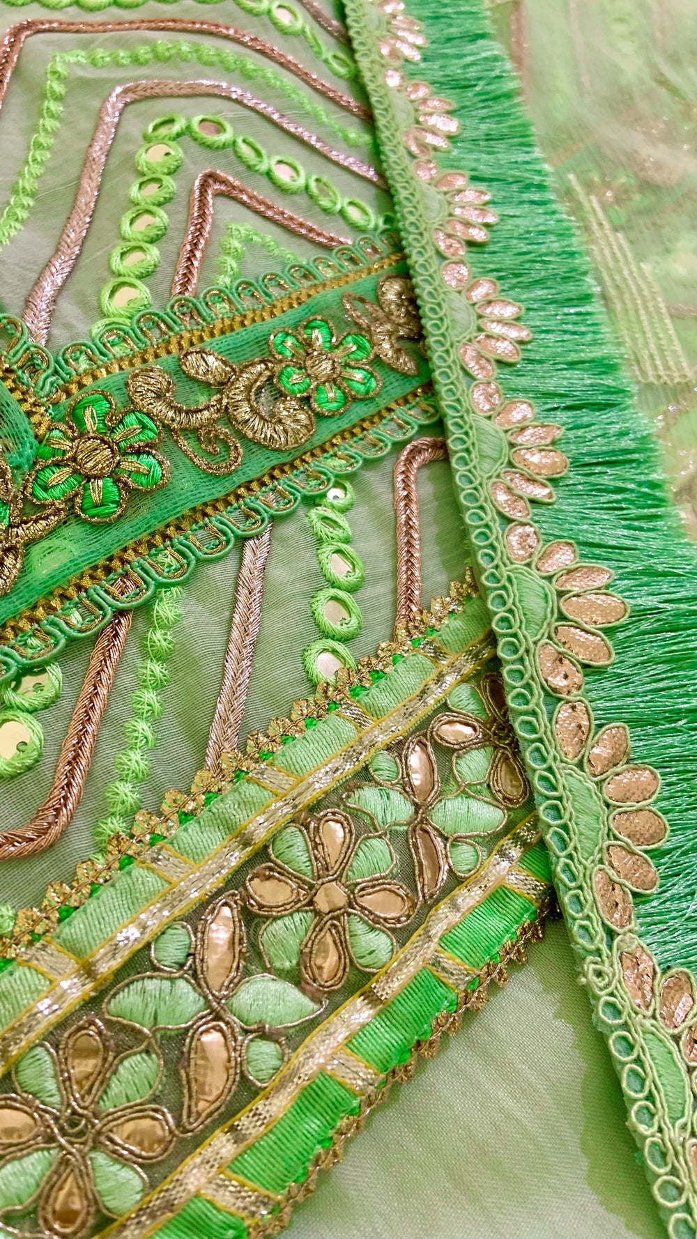 Short shirt and lehenga trouser set in a vibrant neon-mint hue! Featuring festive kamdani, tilla and mirror-work laces in shades of bright green and antique gold. Shirt & lehenga are made of lawn adorned with foil-work, further decorated by hand with alternate shades of bright and antique gold piping. Chiffon dupatta with sequins, finished with gota lace and fringe detailing. Shirt comes with slip and fully lined lehenga trousers.