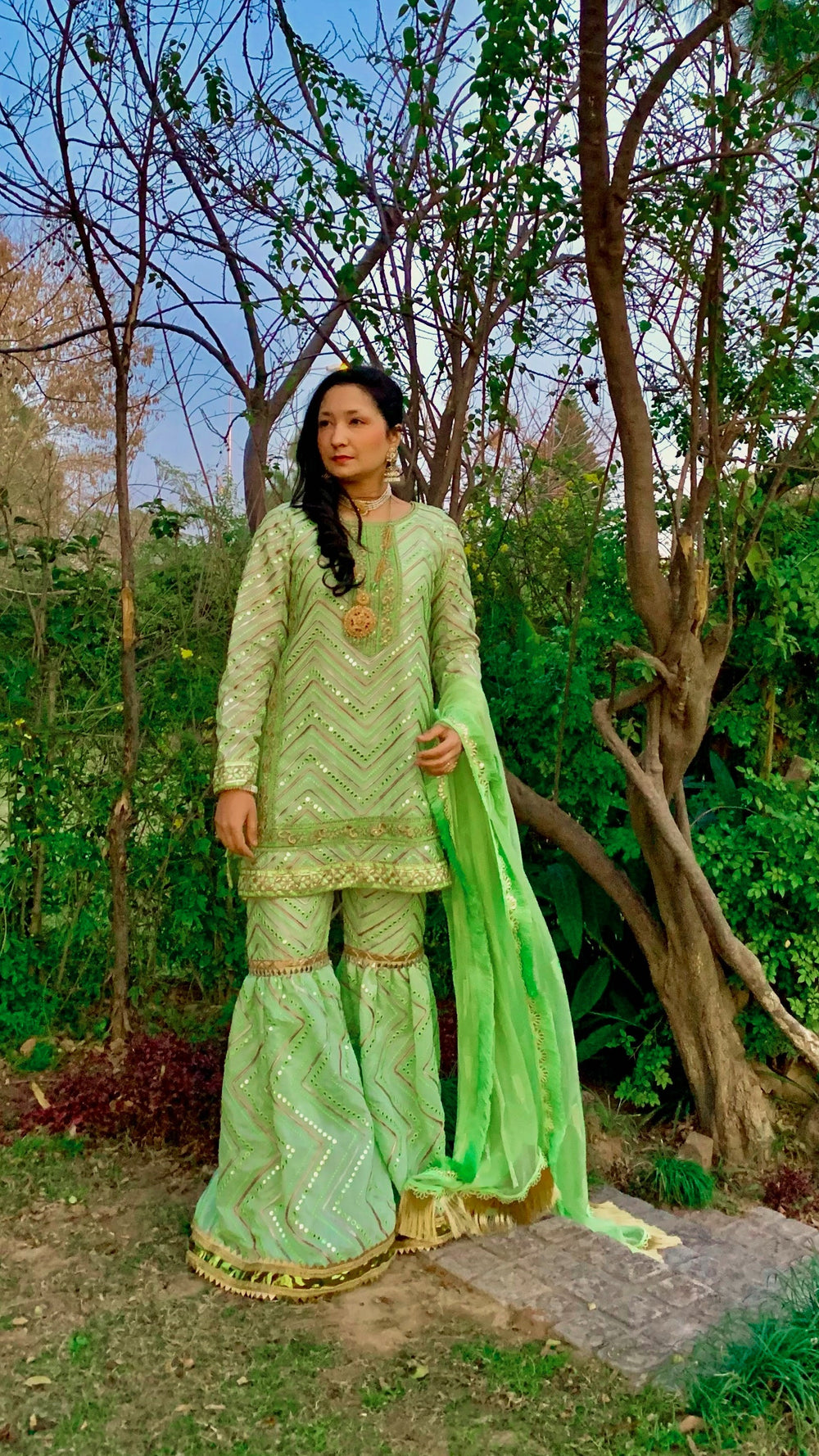 Materials Lawn with foil work. Pakistani chiffon dupatta. Local and imported laces and embellishments. All our work is done by locally employed craftsmen and workers.