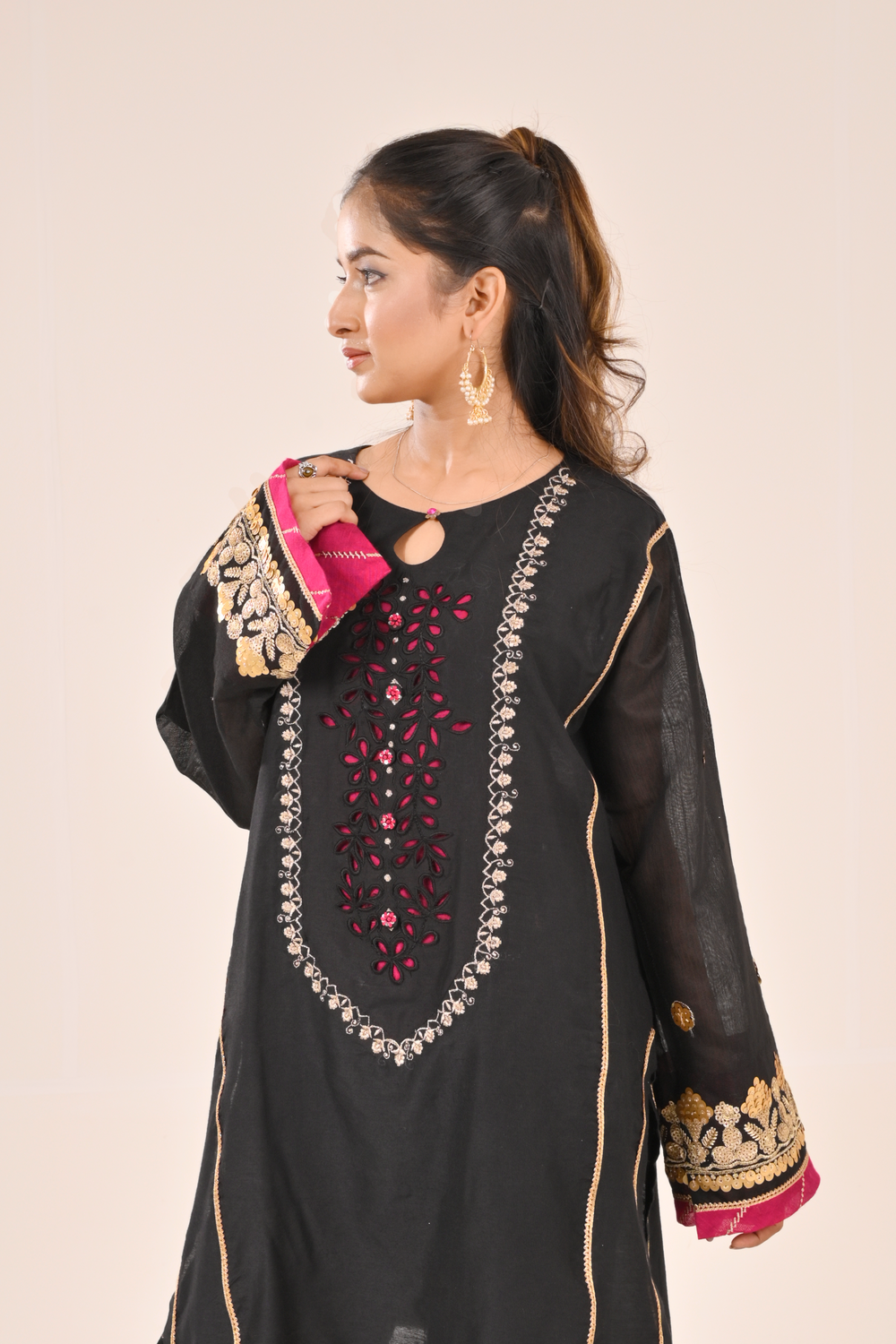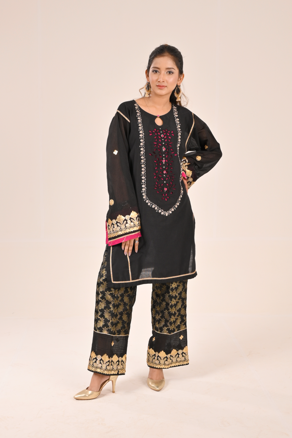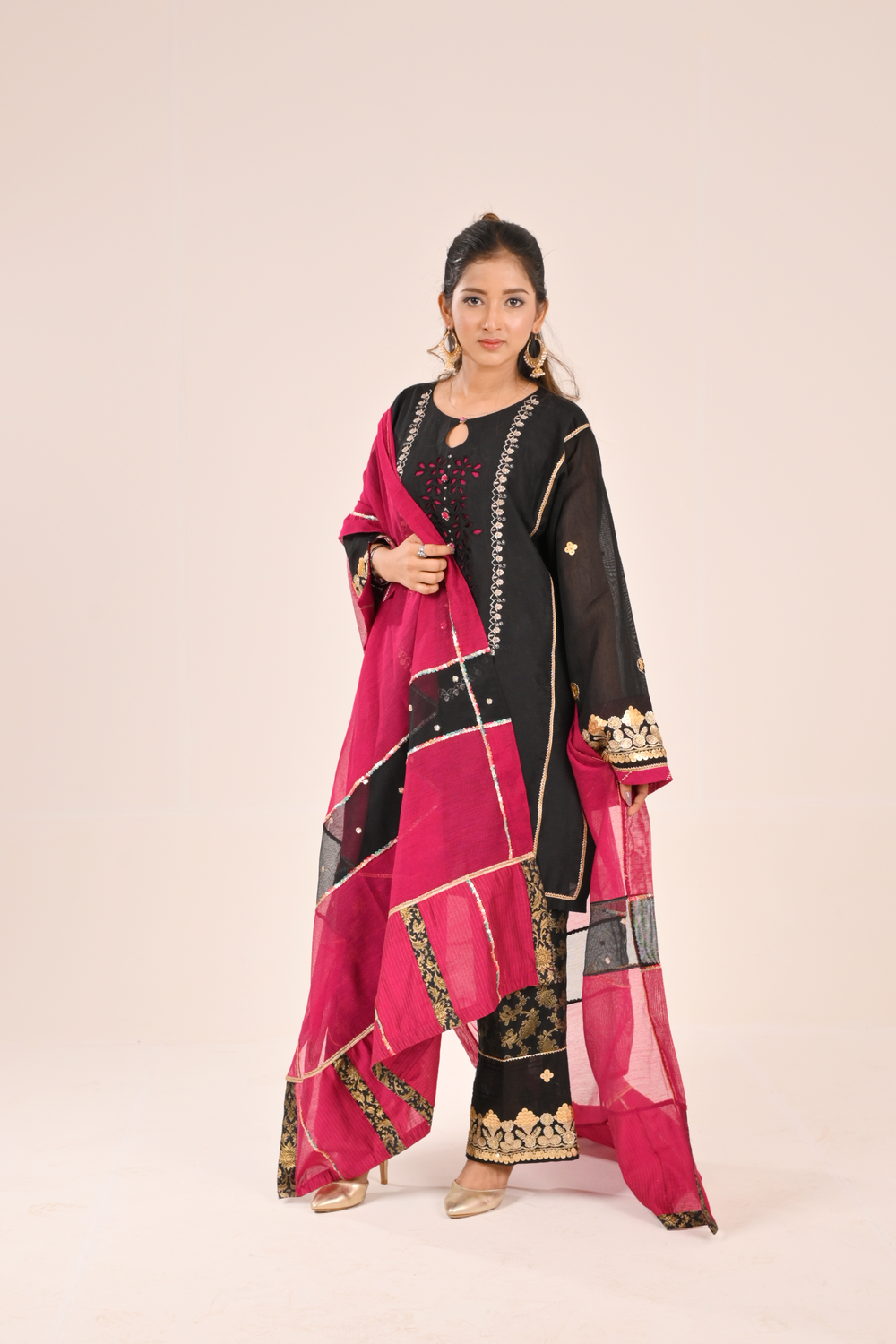 This sophisticated outfit features a black khaddi net kurta with a timeless straight-cut design, paired with loose jamawar trousers for a luxurious touch. The ensemble is stitched with contrast zari detailing and paired with a pink cotton net dupatta adorned with elegant zari booti work, exuding understated elegance. The neckline showcases intricate cutwork embroidery, while the sleeves and jamawar trouser bottoms are enriched with delicate zari embroidery, adding finesse and charm to this exquisite attire
