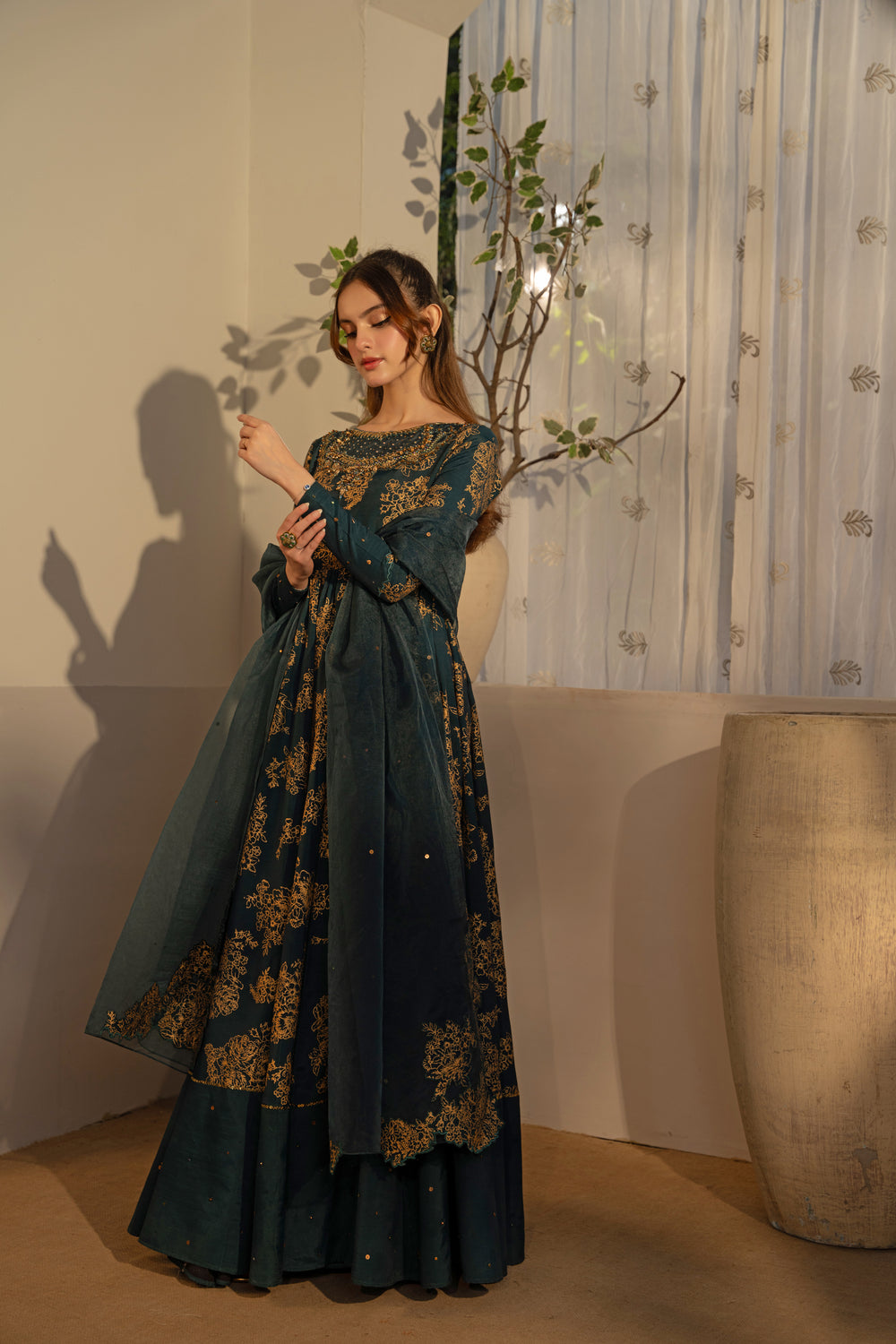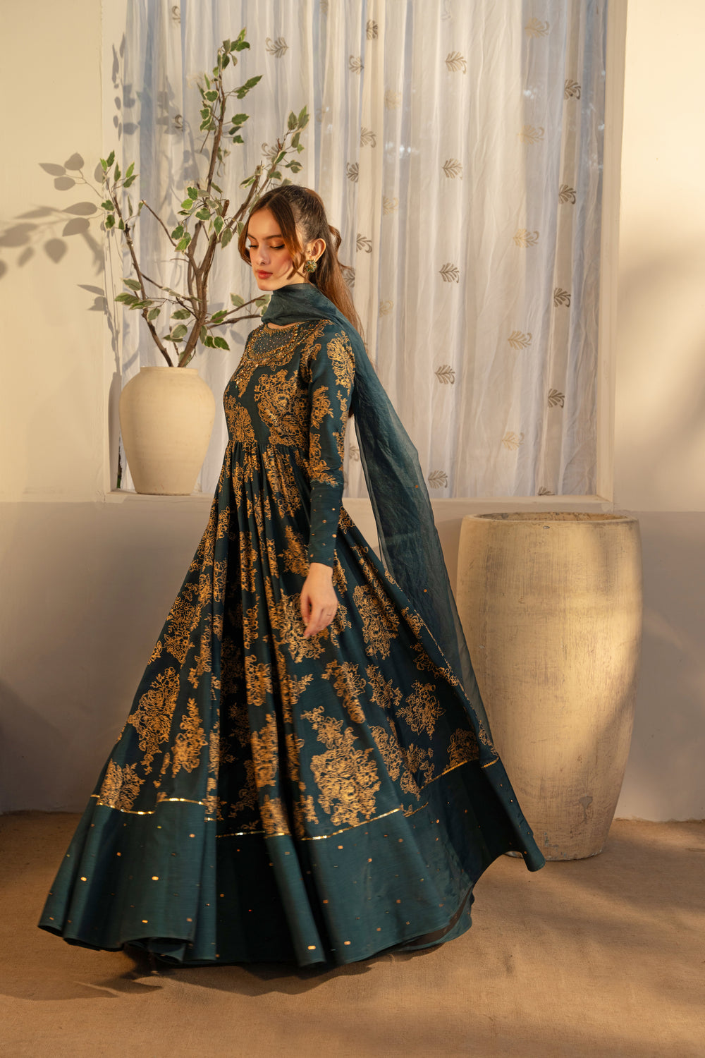 Inspired by Thai Silk, this classic teal-green combination includes a gorgeous organza dupatta with a corner motif design and a sequence spray, as well as pishwas with a charming screen-printed design and a distinctively adorned neckline.